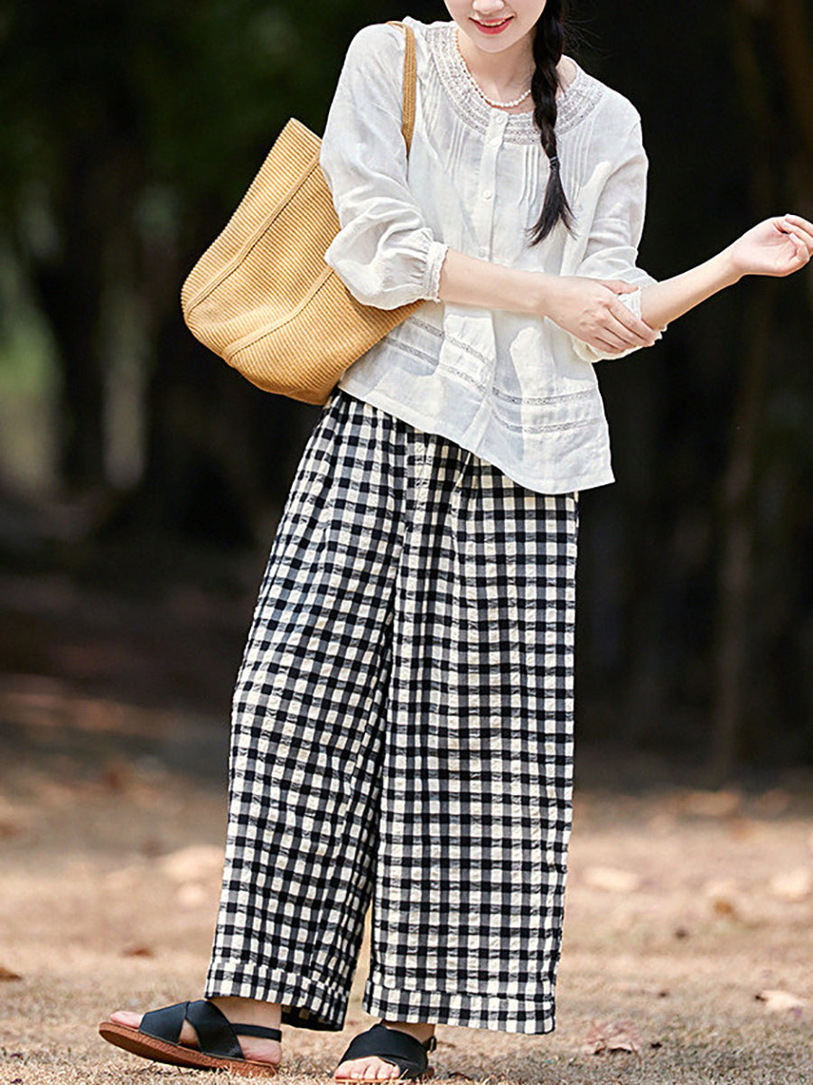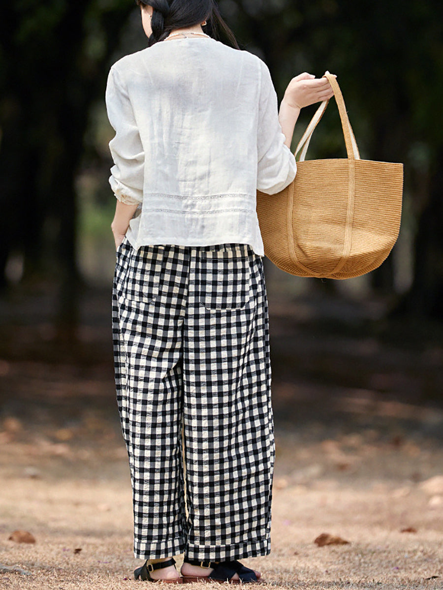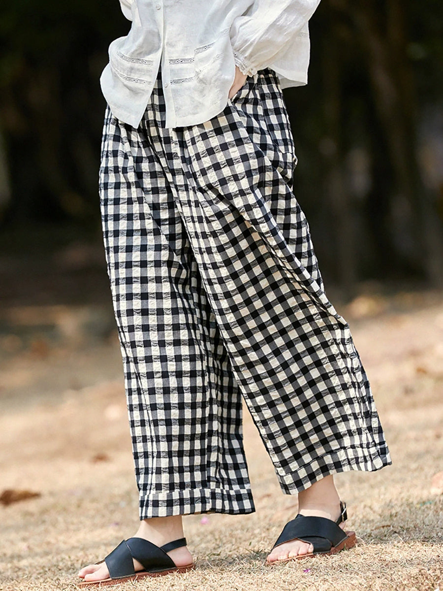 Women Spring Plaid 100%Cotton Plaid Pants