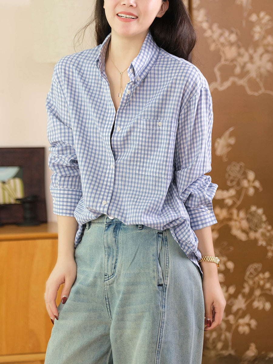 Women Spring Plaid Turn-down Collar Cotton Shirt