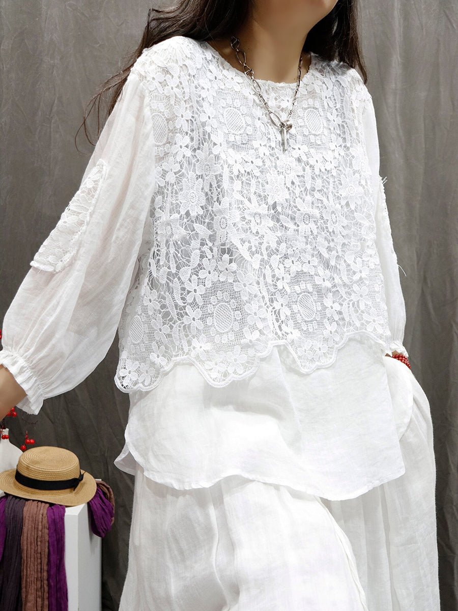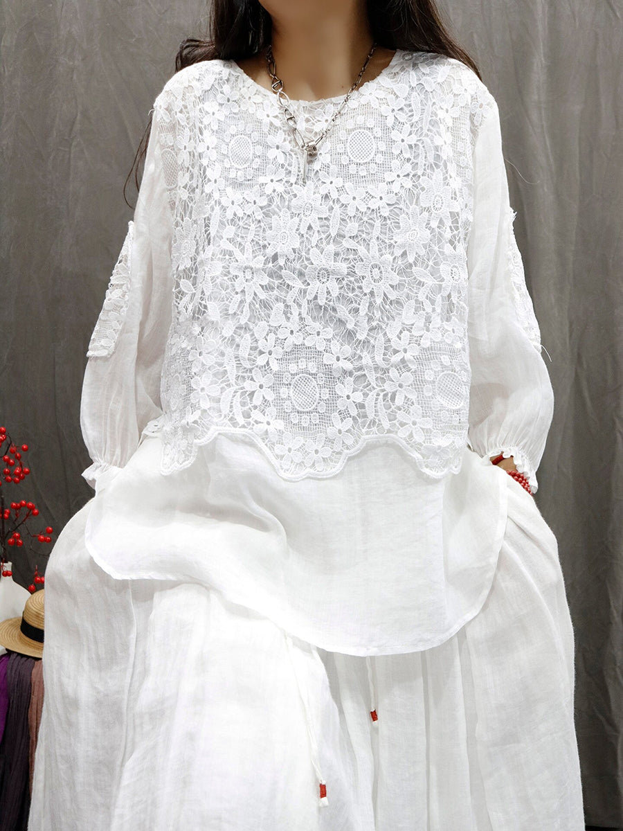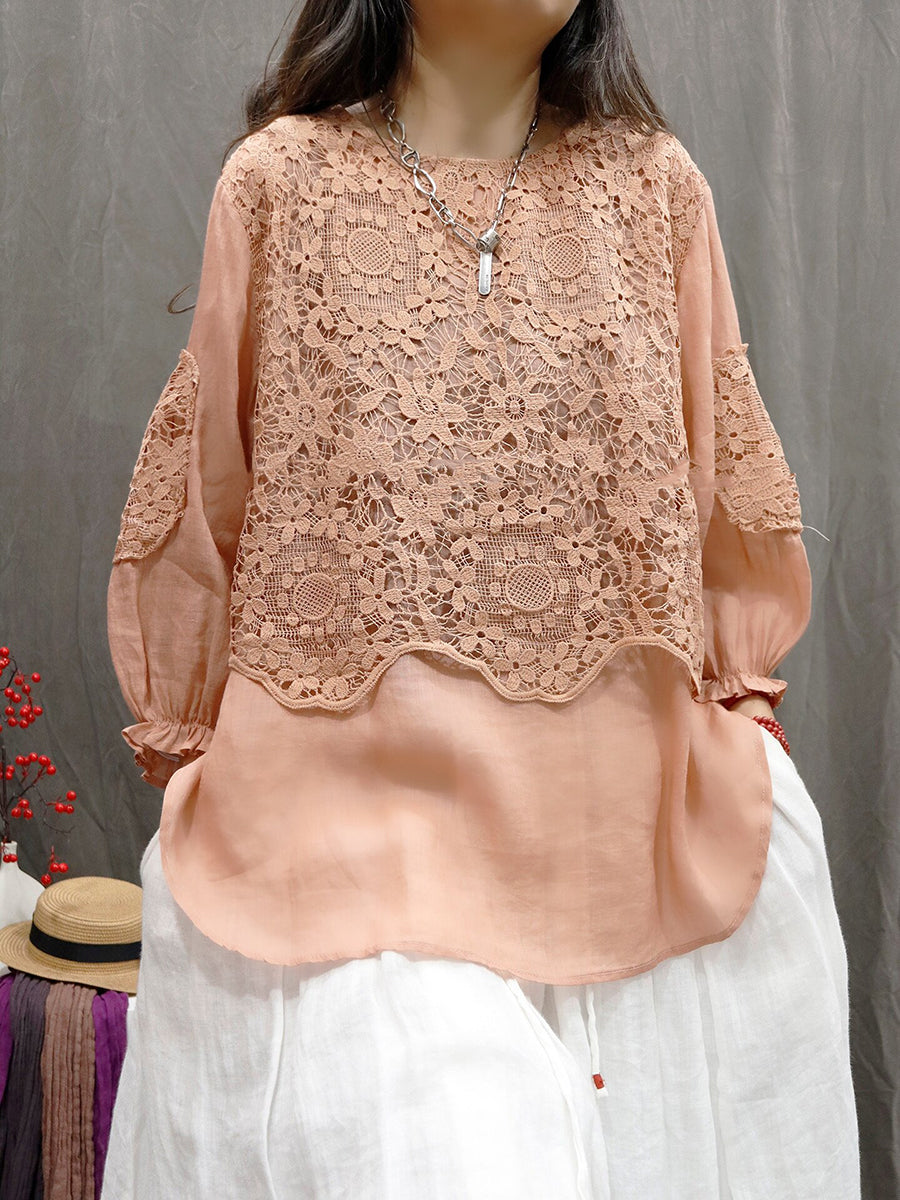 Women Summer Artsy Flower Lace O-Neck 100%Ramie Shirt