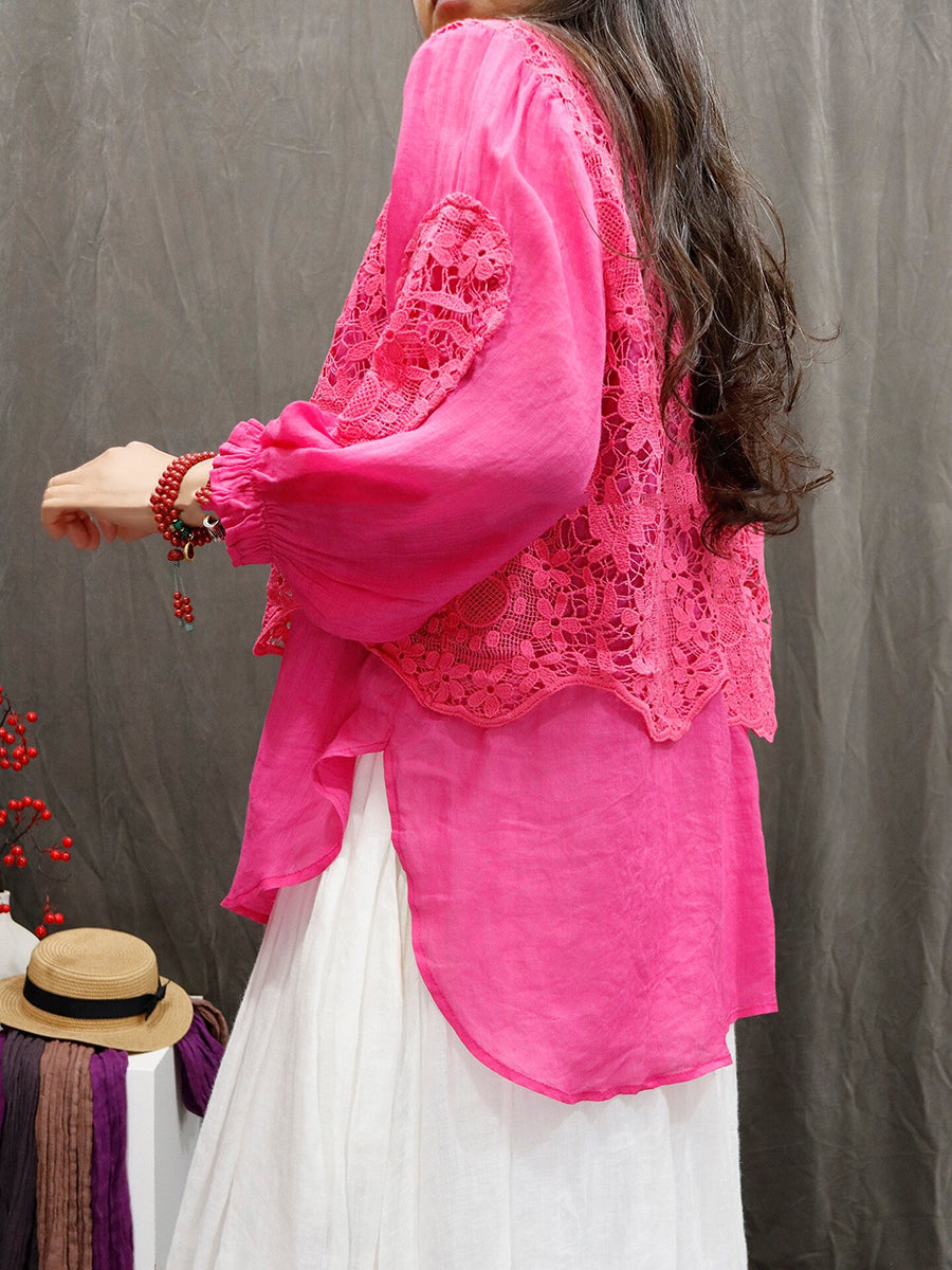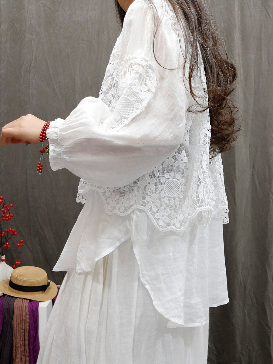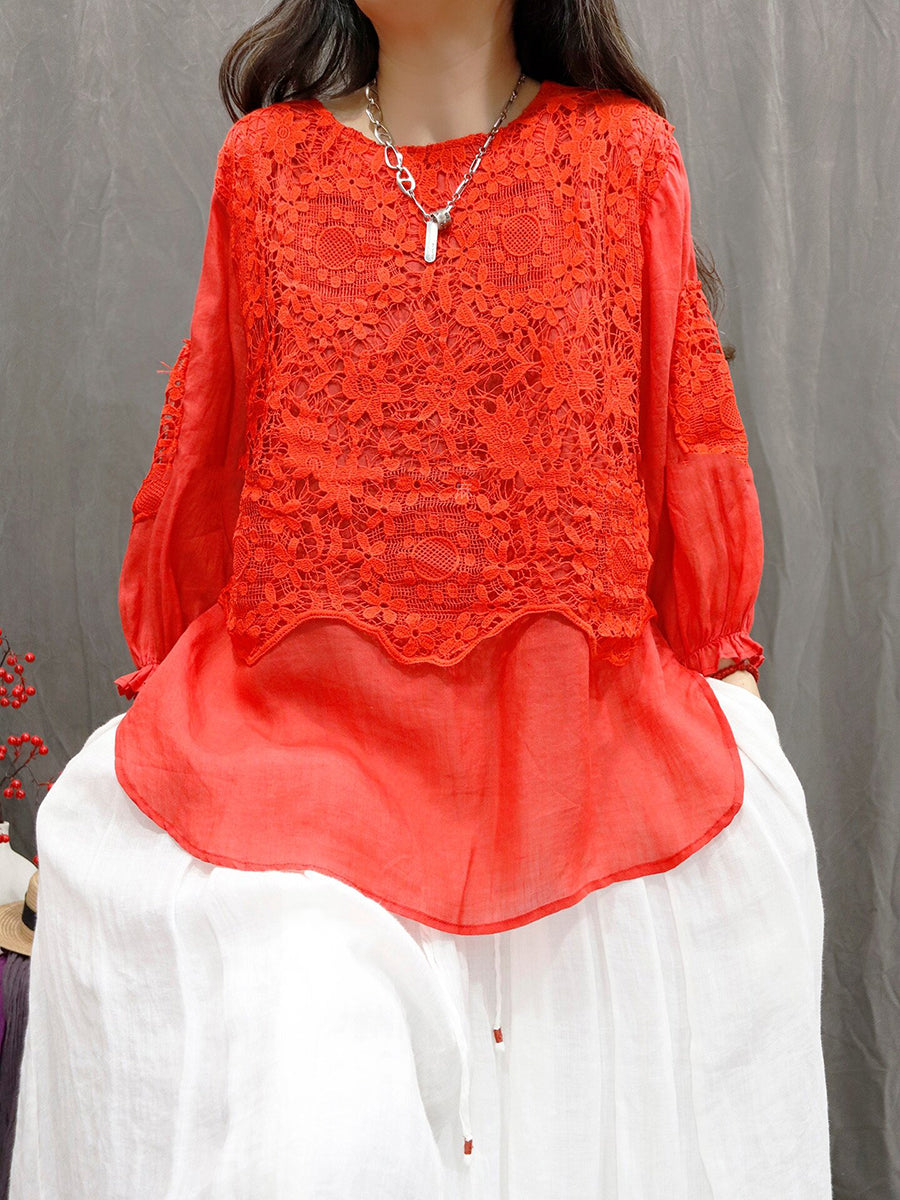 Women Summer Artsy Flower Lace O-Neck 100%Ramie Shirt