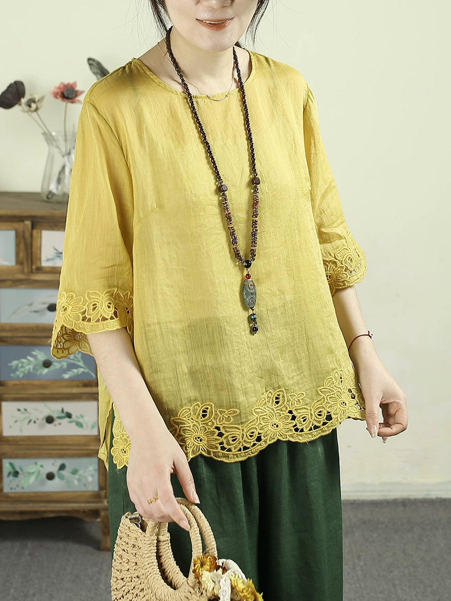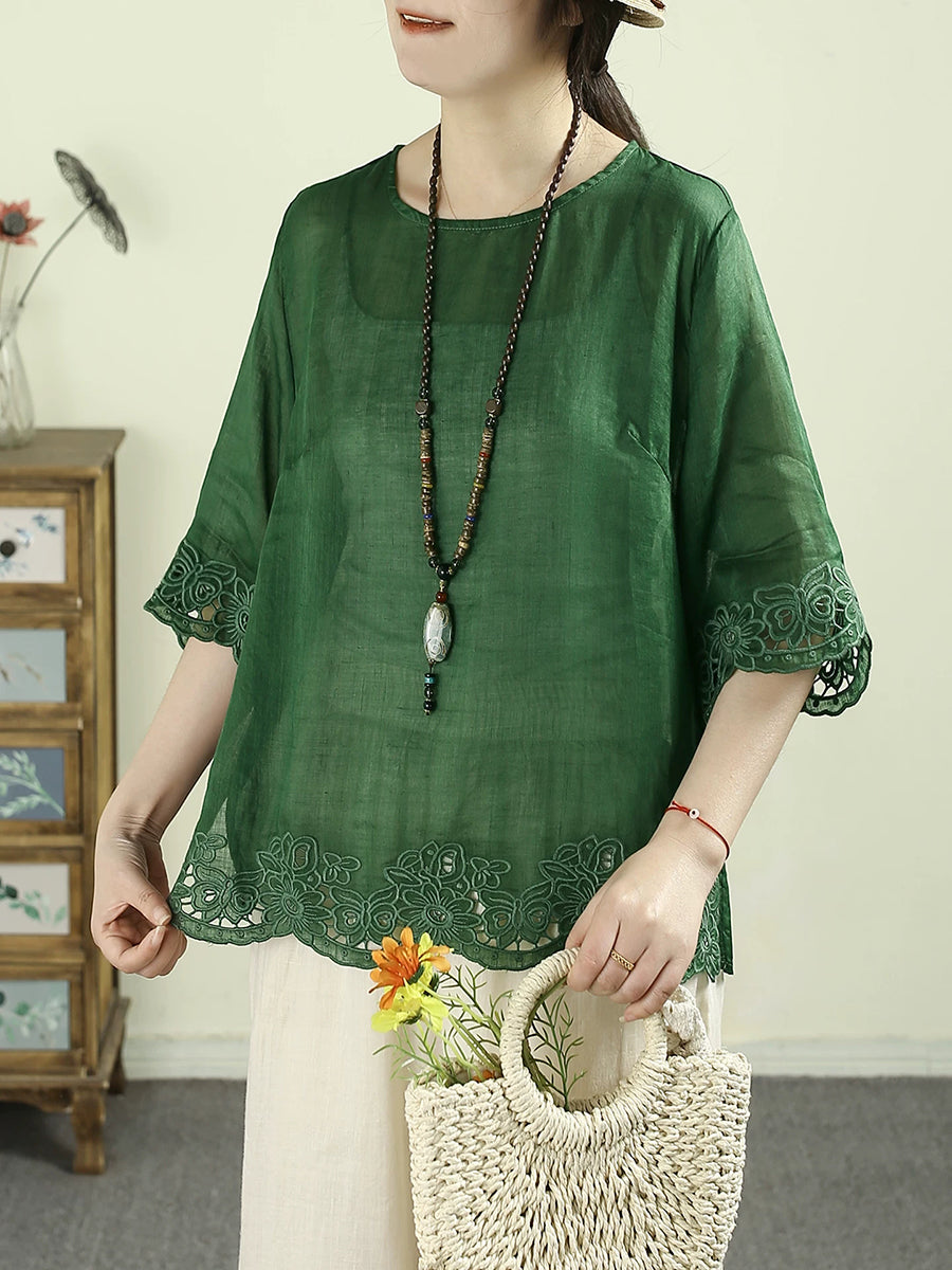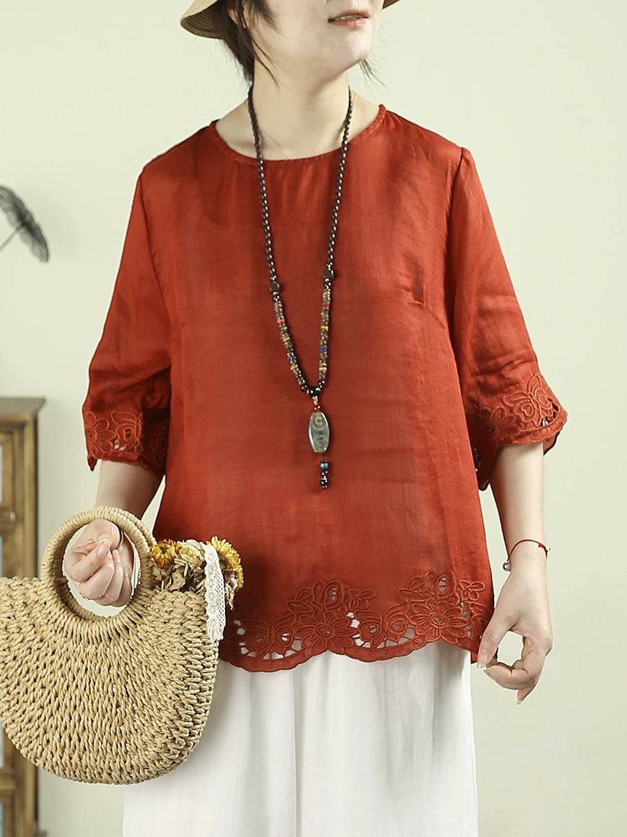 Women Summer Artsy Embroidery 100%Ramie Blouse