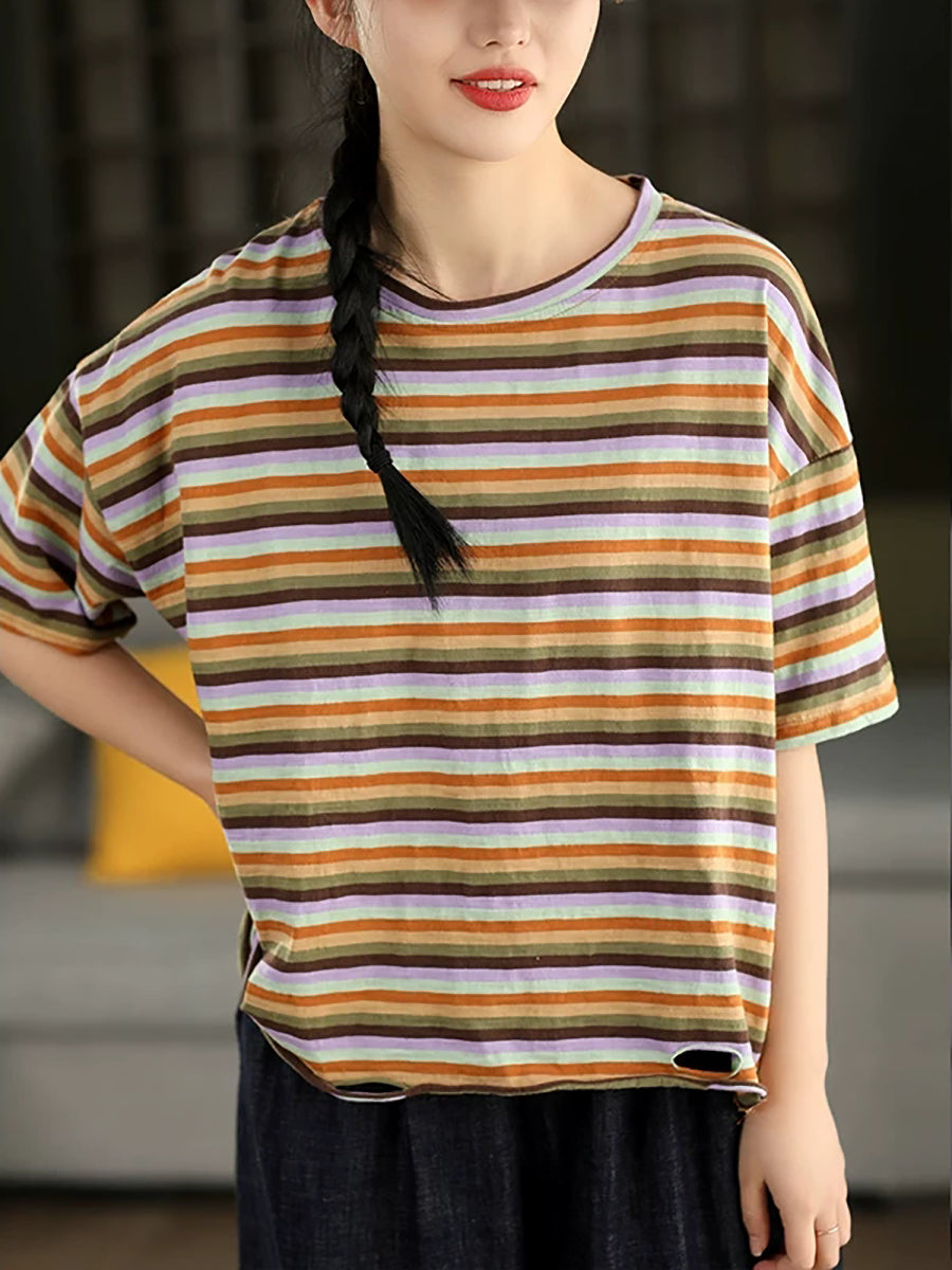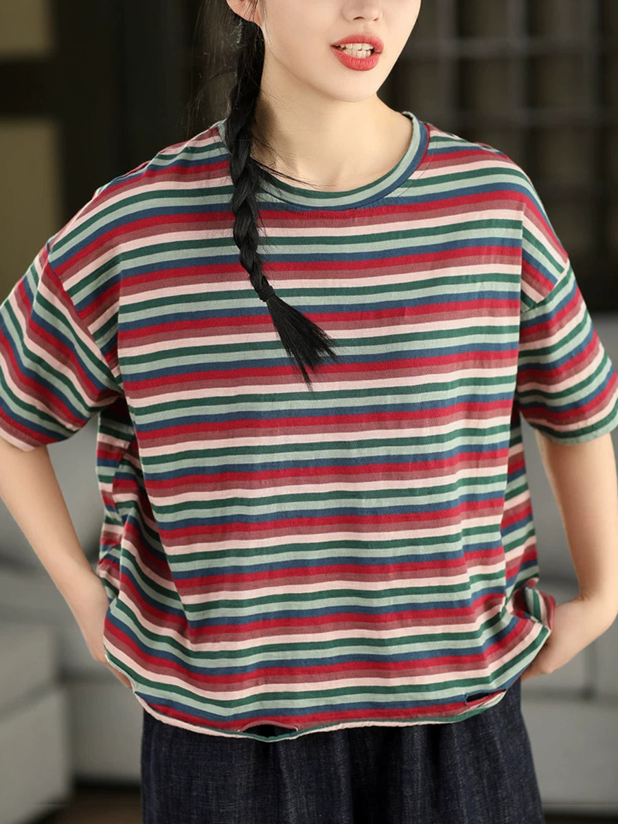 Women Summer Stripe O-Neck Cotton T-Shirt