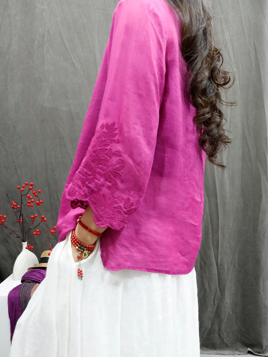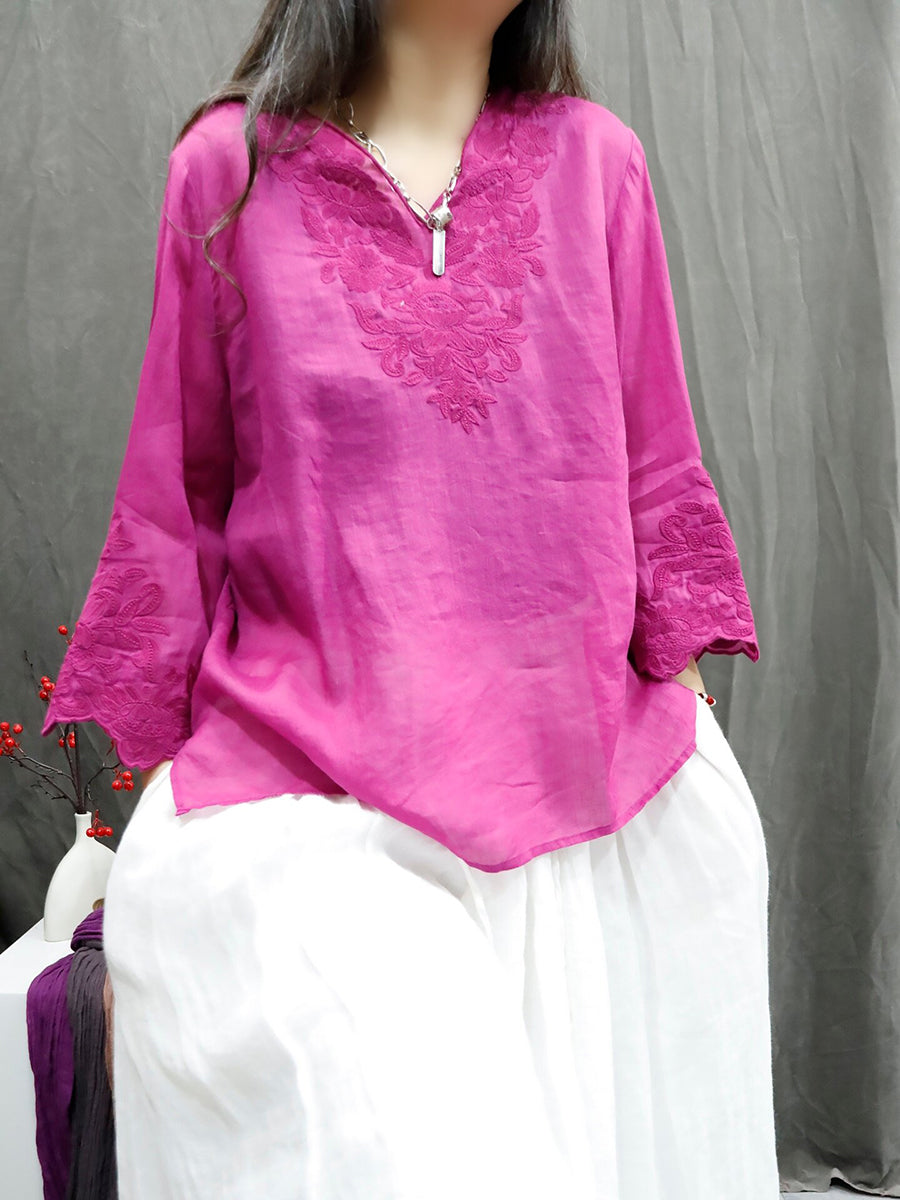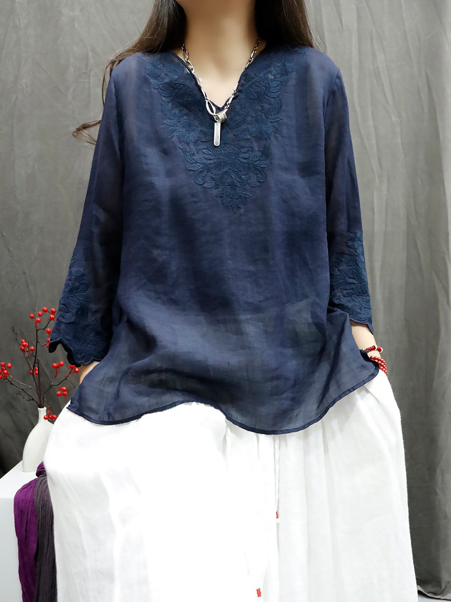 Women Summer Artsy Pure Color Embroidery V-Neck 100%Ramie Shirt