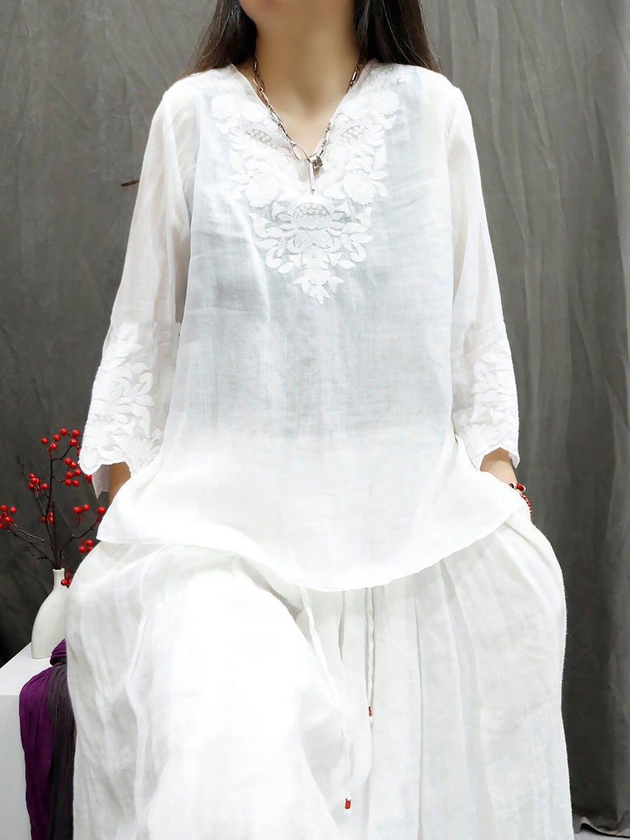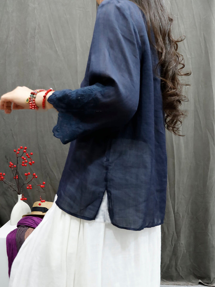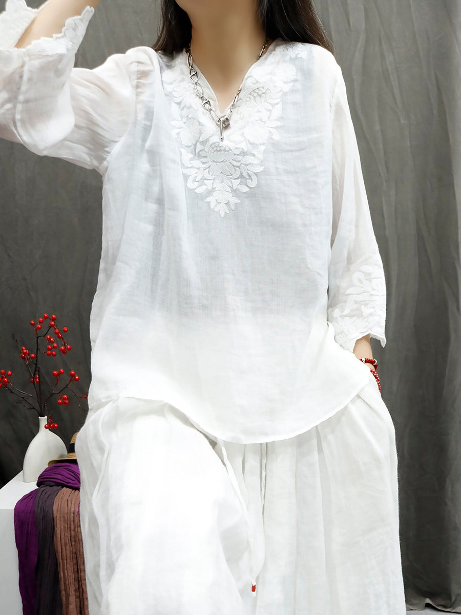 Women Summer Artsy Pure Color Embroidery V-Neck 100%Ramie Shirt