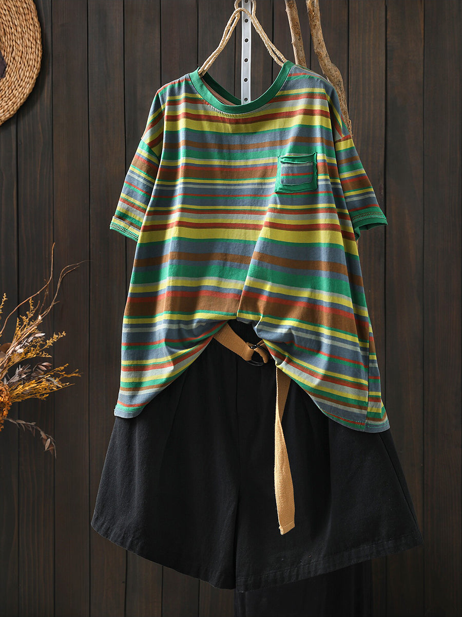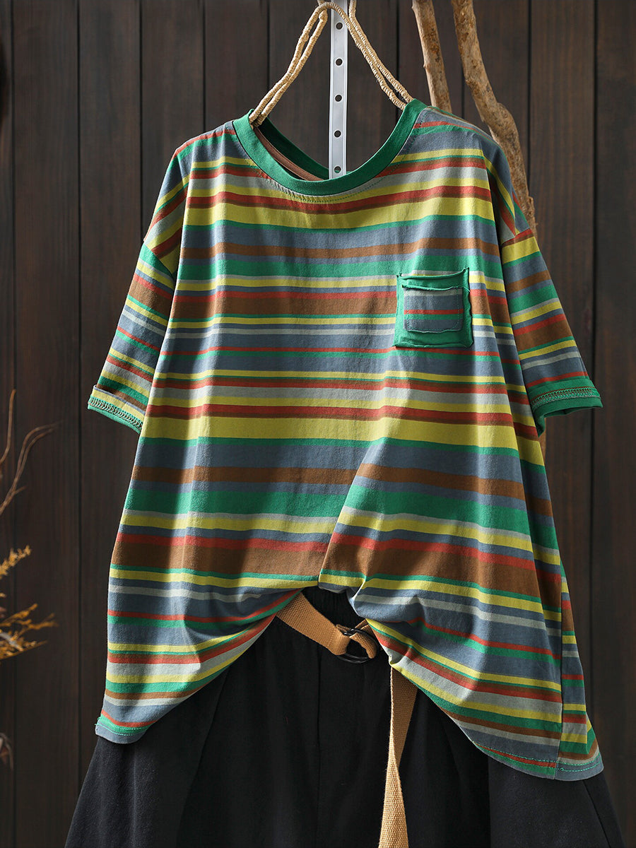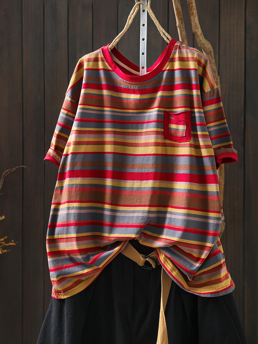 Women Summer Casual Stripe Cotton O-Neck Blouse