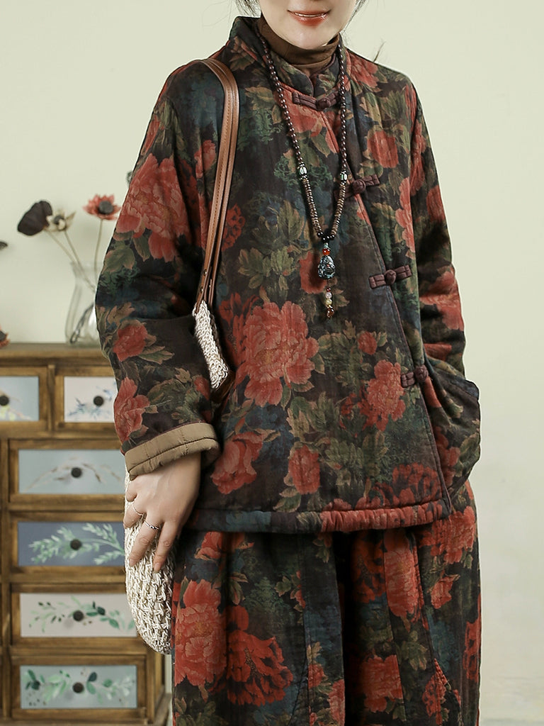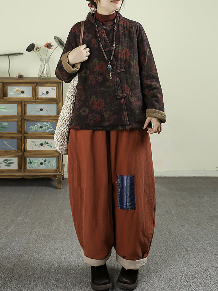 Women Ethnic Autumn Flower Stand Collar Cotton Coat