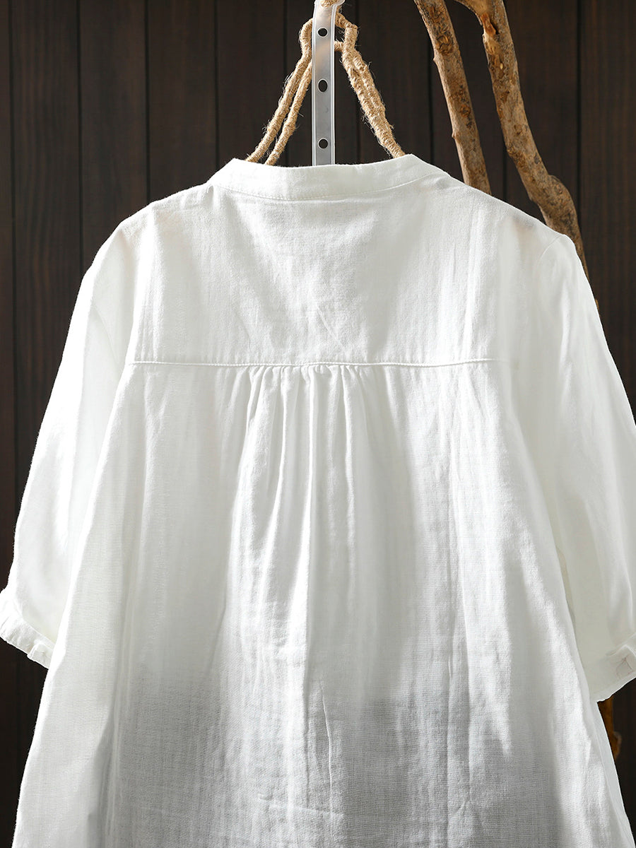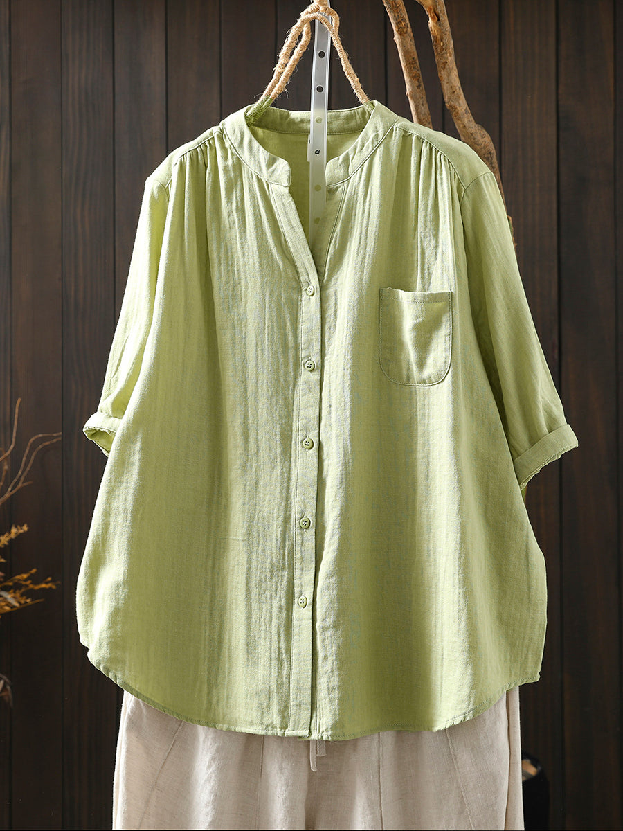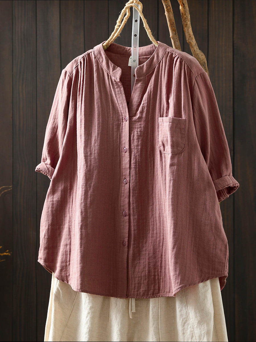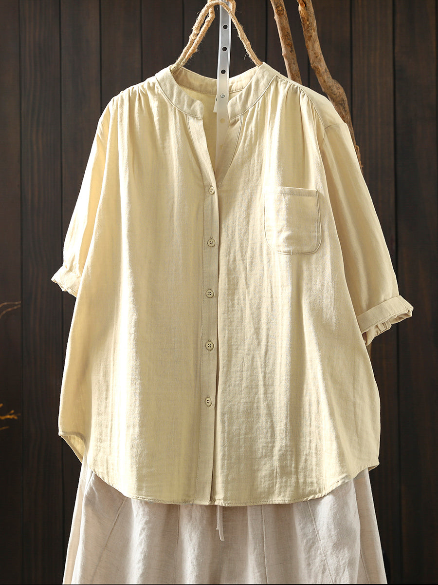Women Summer Casual Pure Color V-Neck 100%Cotton Blouse