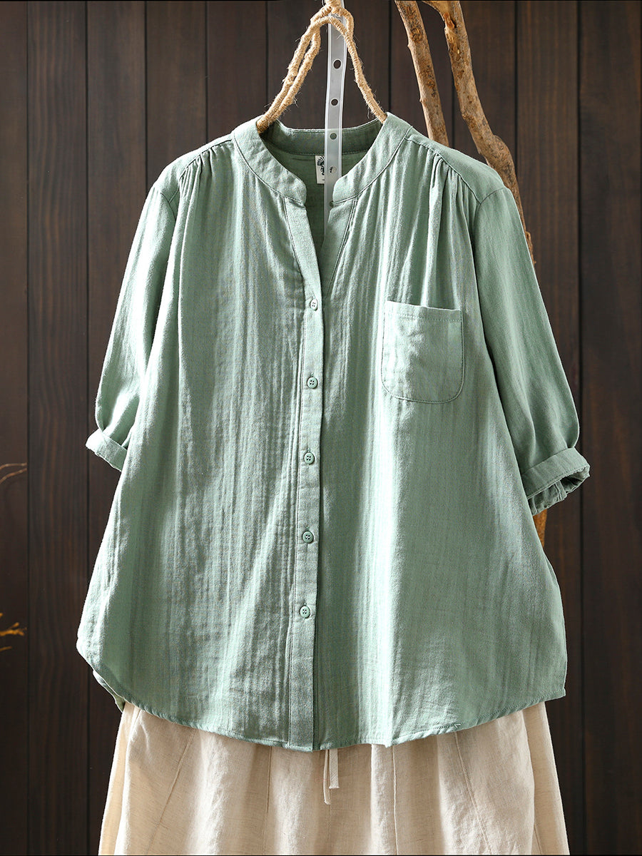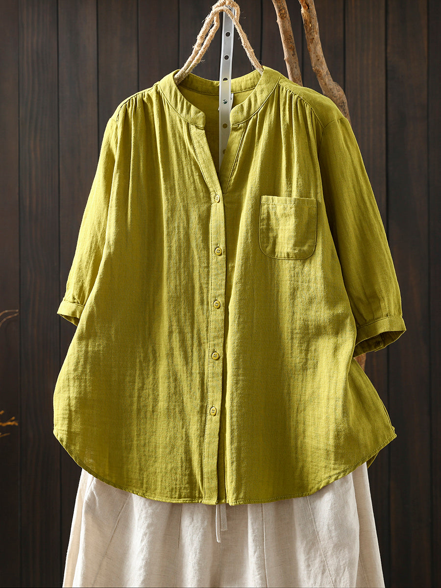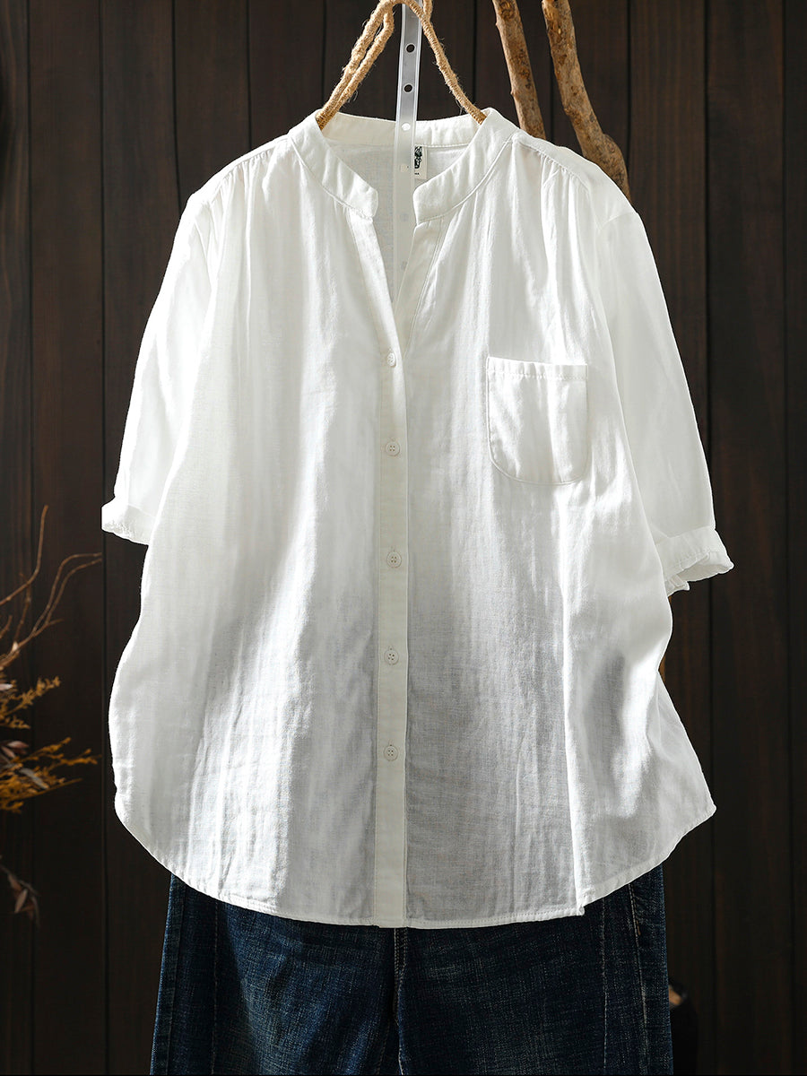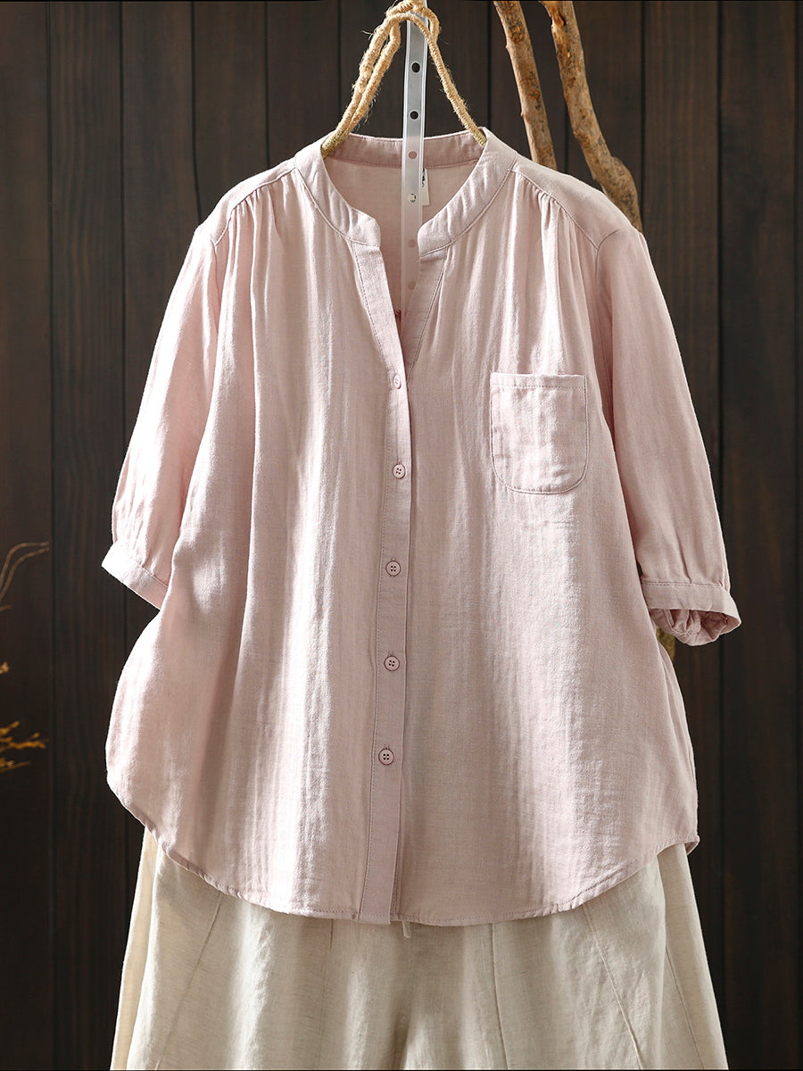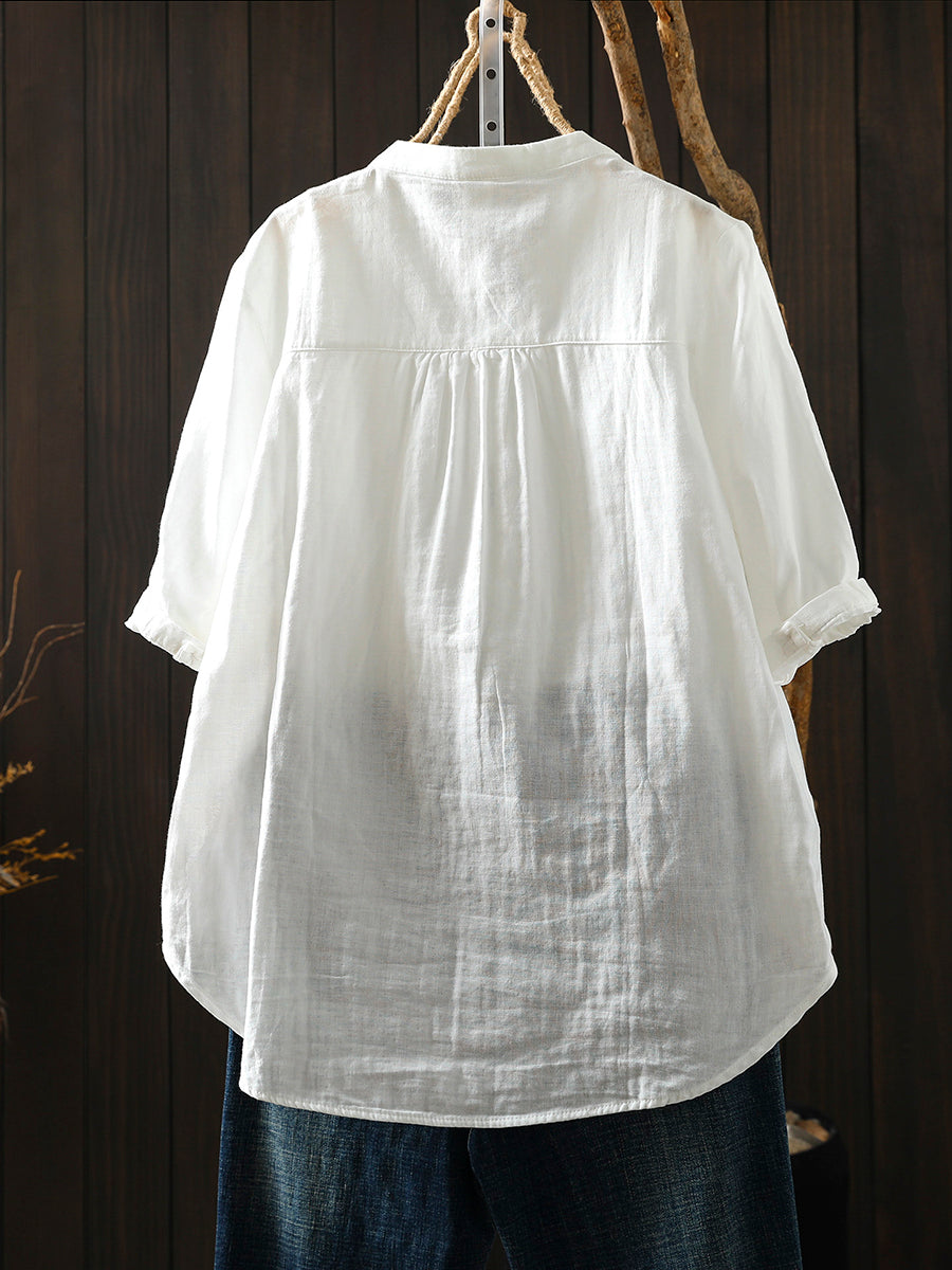 Women Summer Casual Pure Color V-Neck 100%Cotton Blouse
