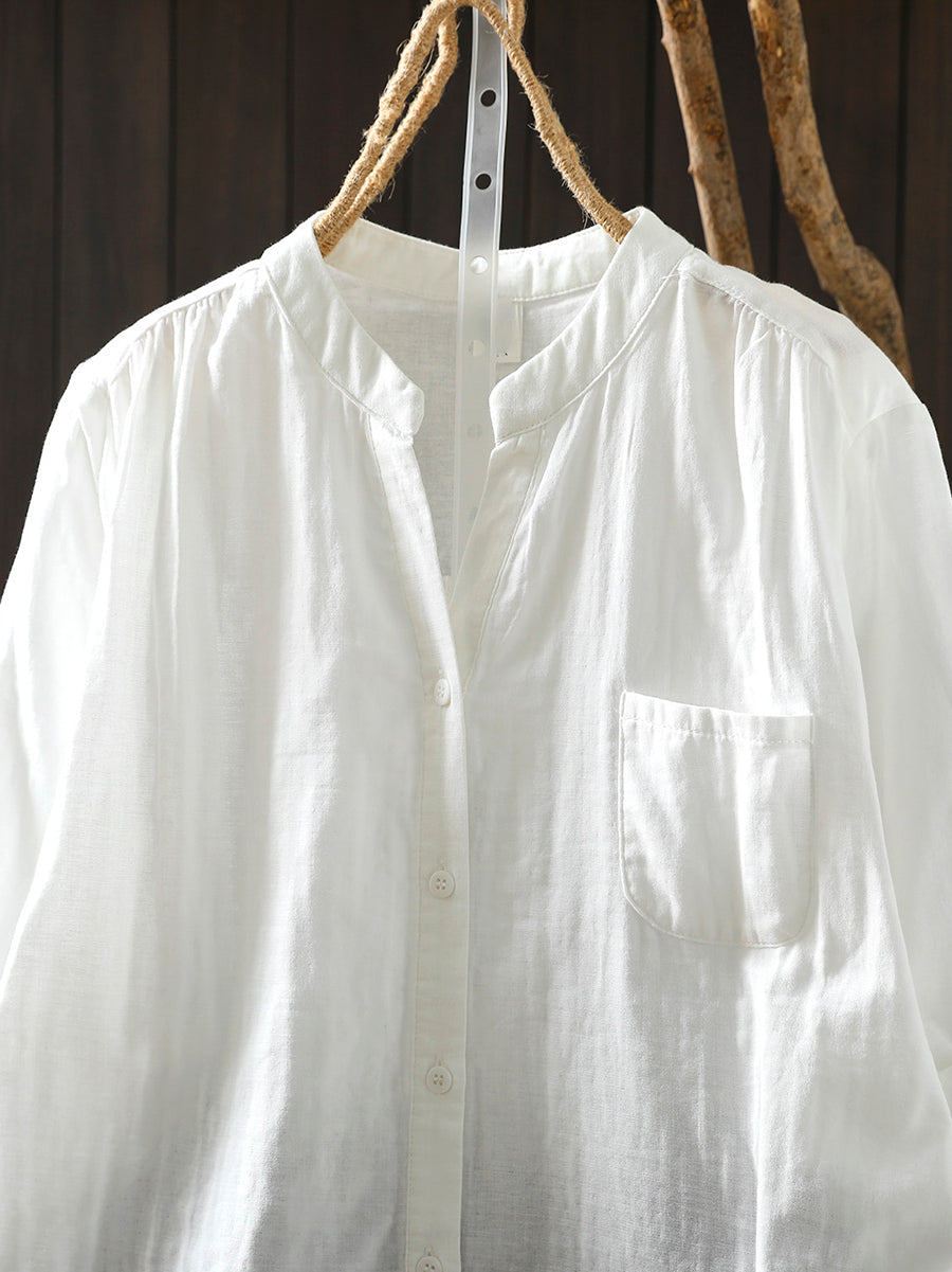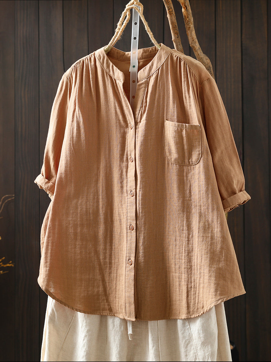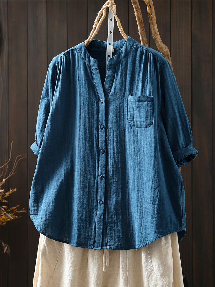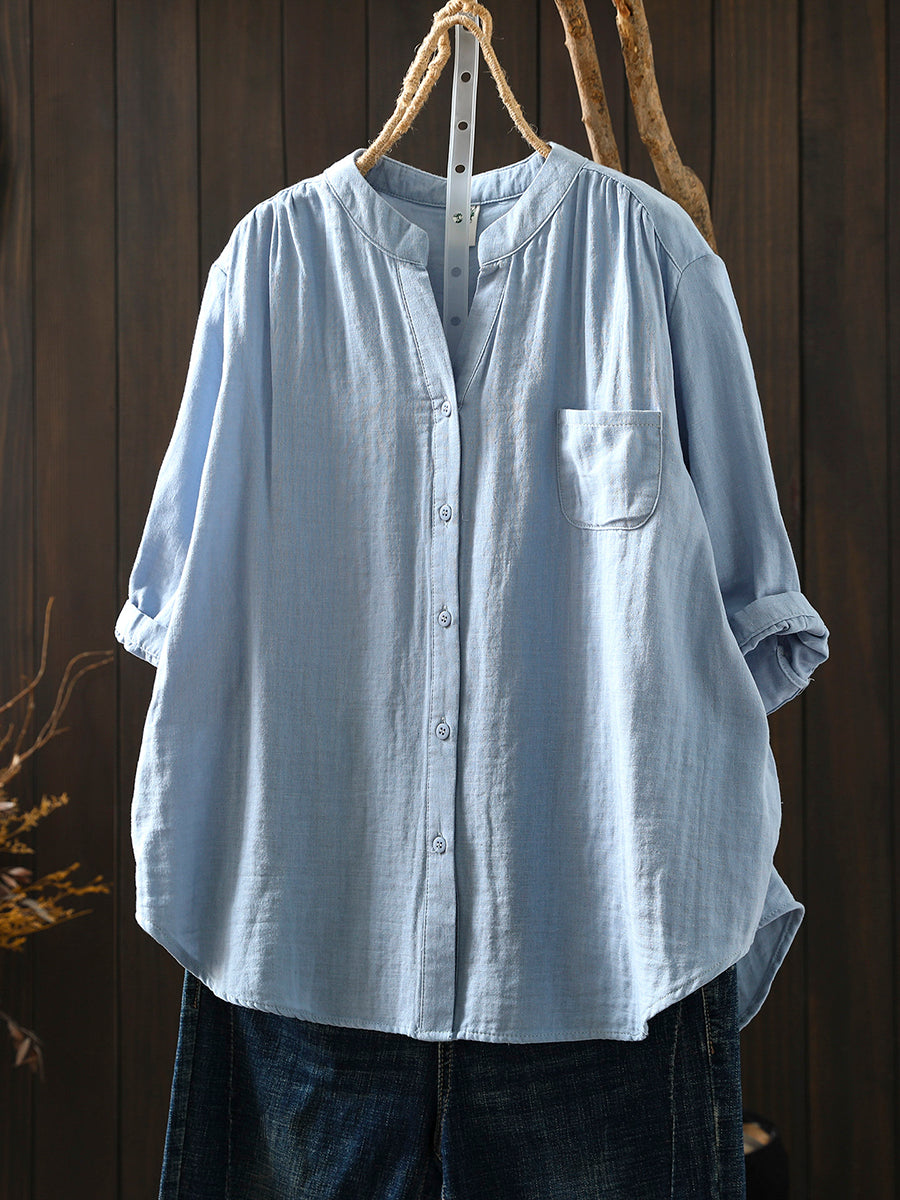 Women Summer Casual Pure Color V-Neck 100%Cotton Blouse