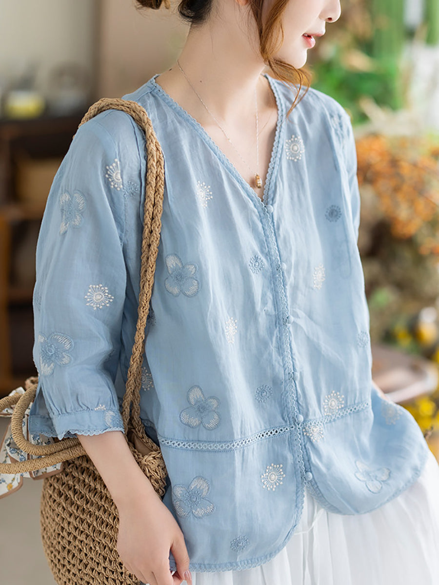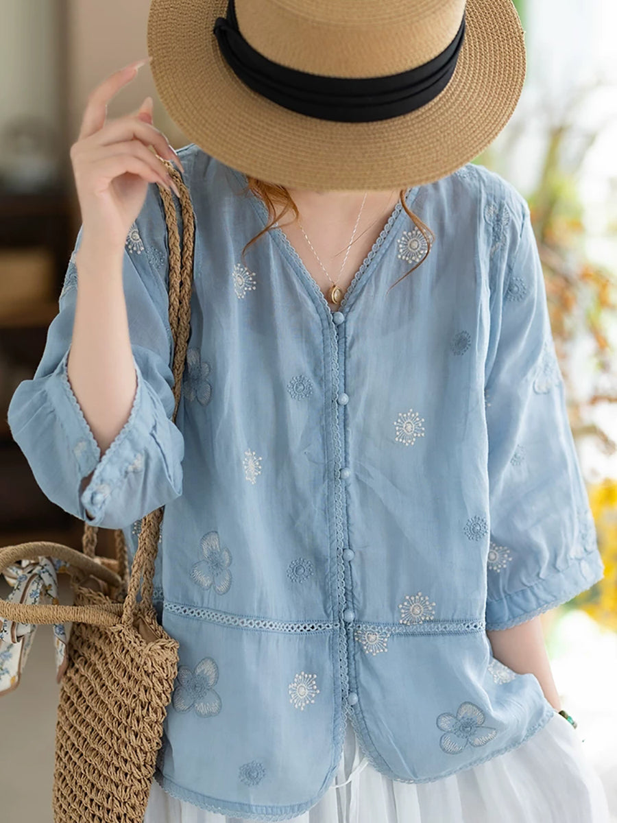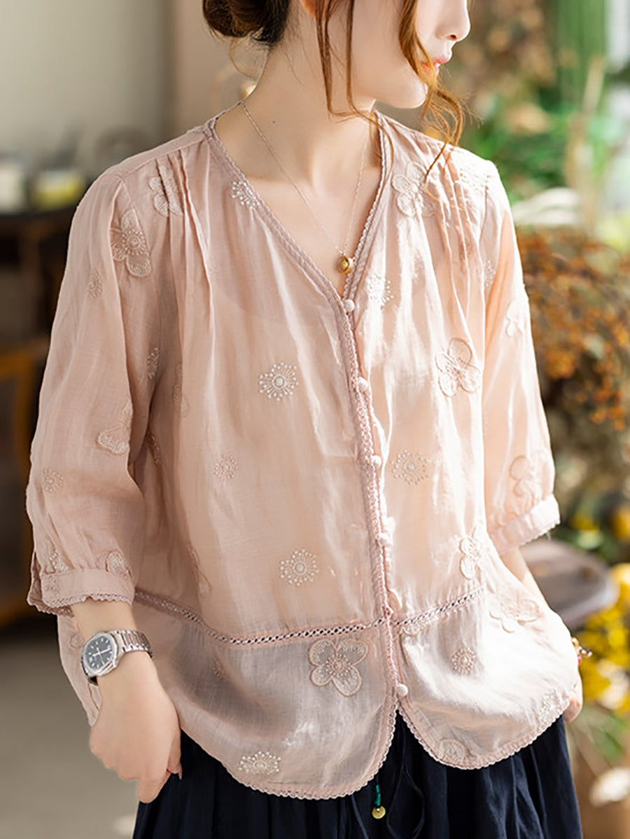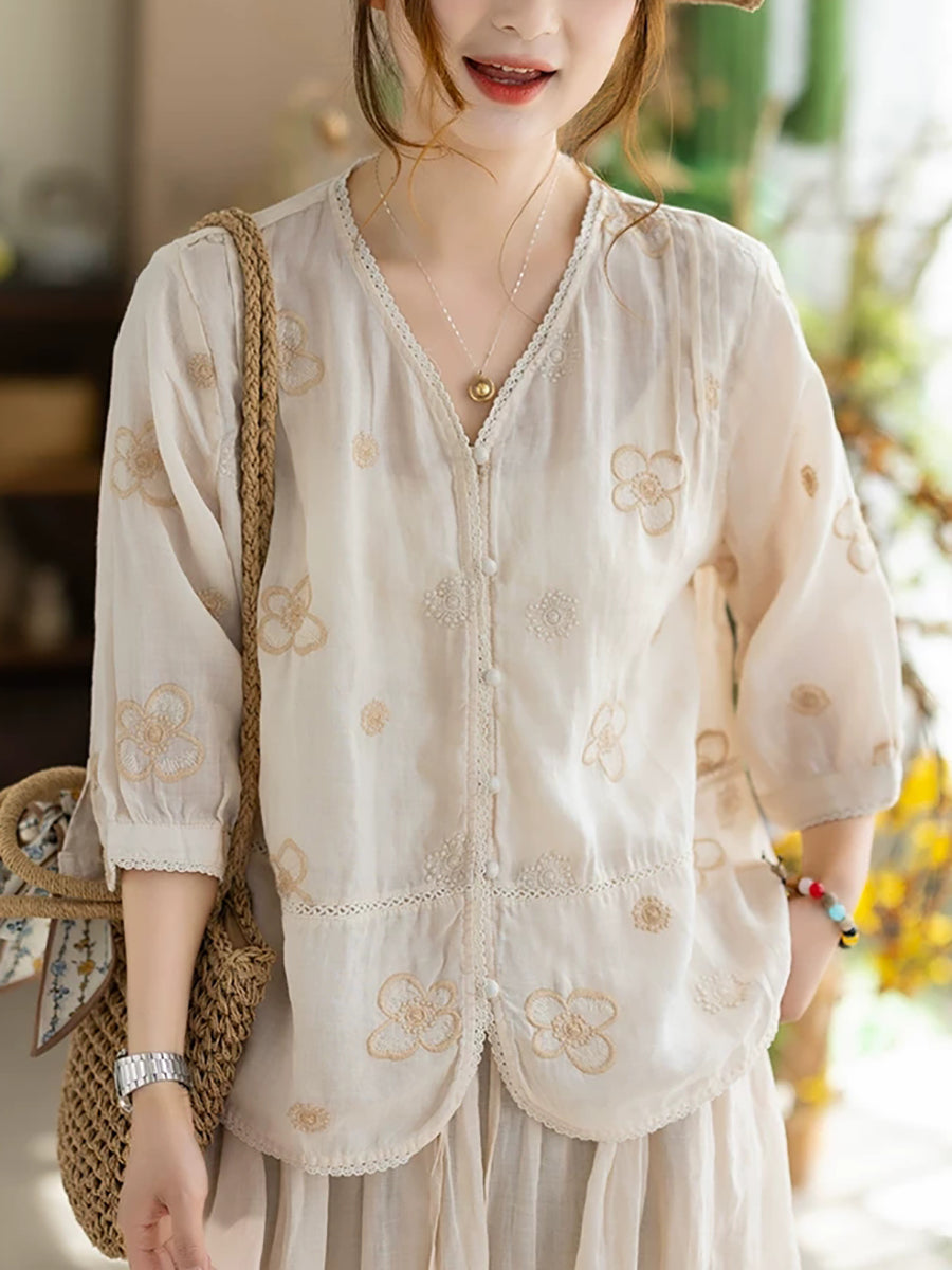 Women Summer Artsy Embroidery V-Neck 100%Ramie Shirt