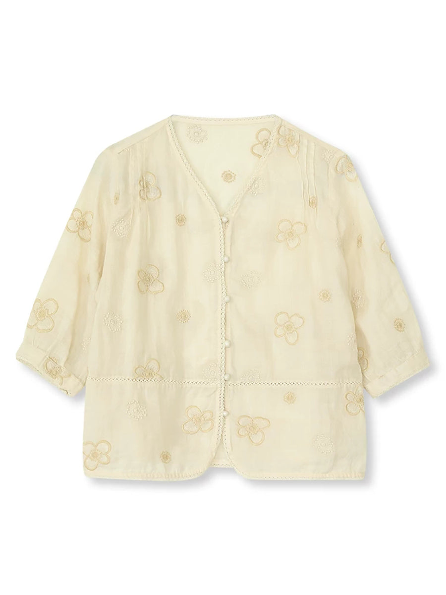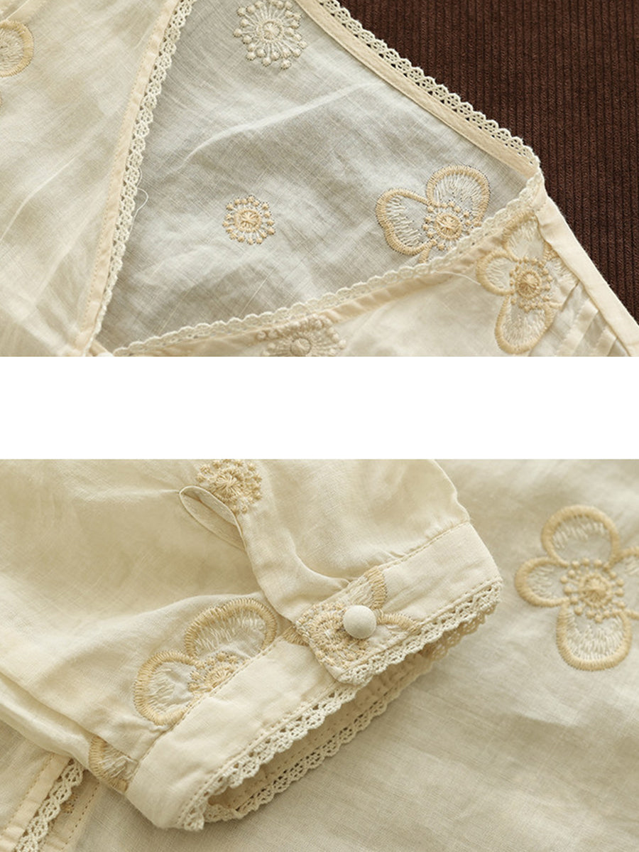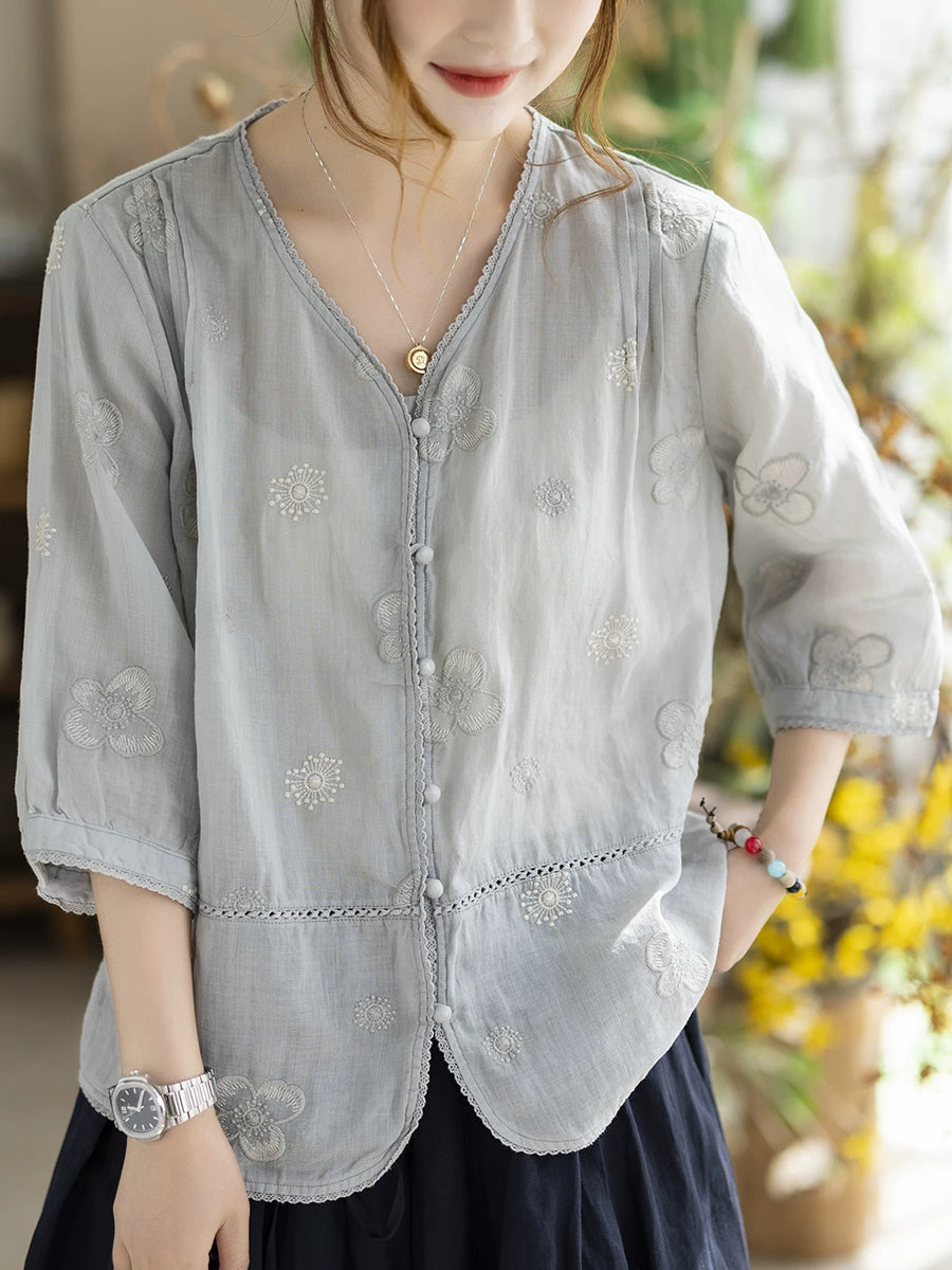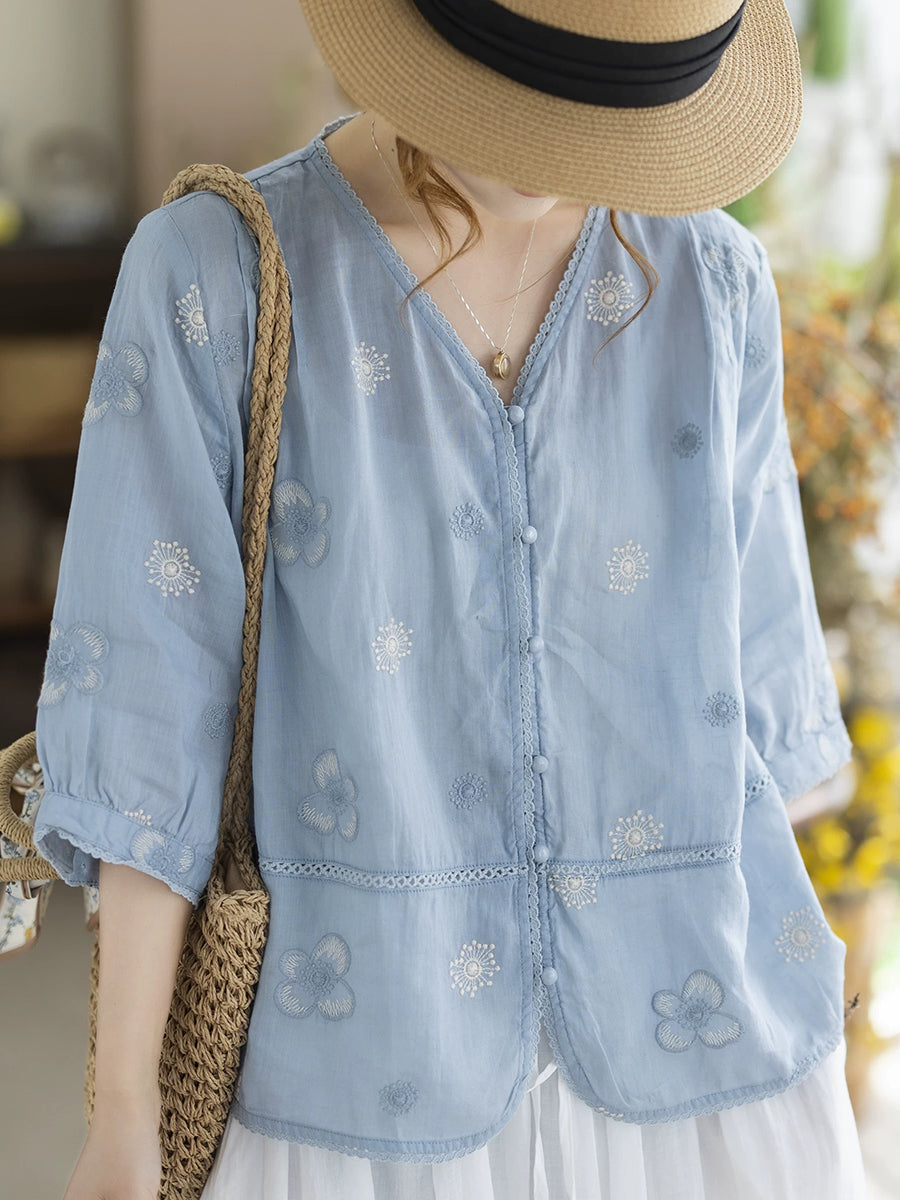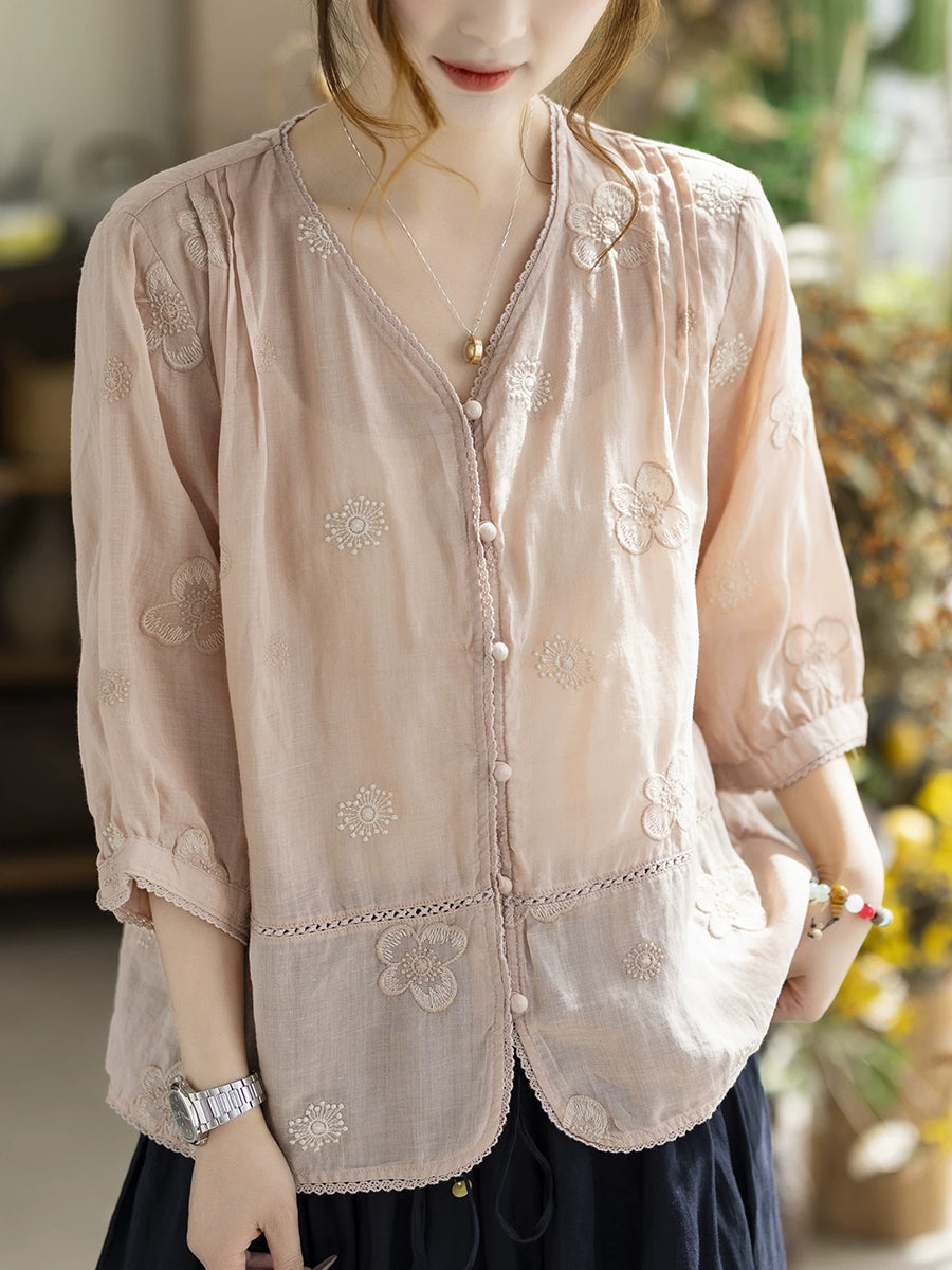 Women Summer Artsy Embroidery V-Neck 100%Ramie Shirt