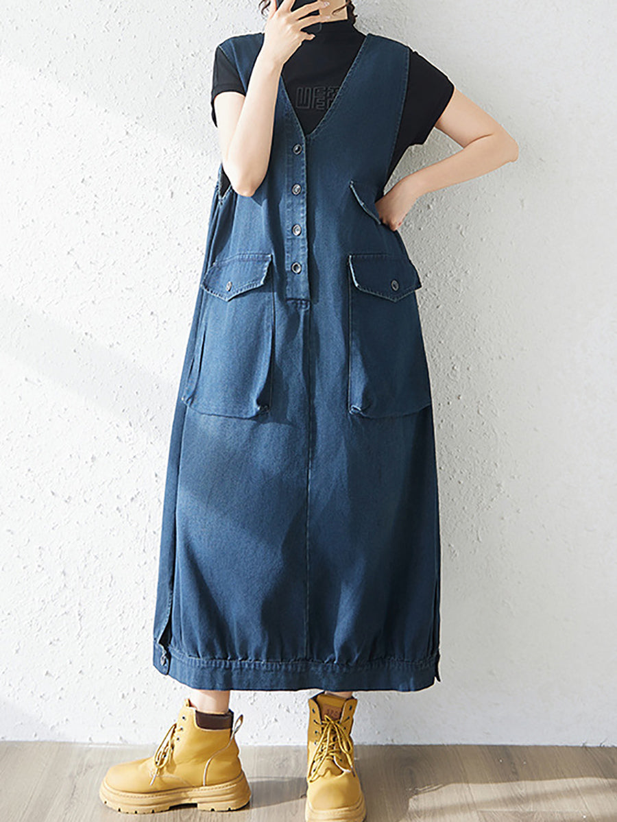Women Spring Casual Pure Color Denim V-Neck Dress