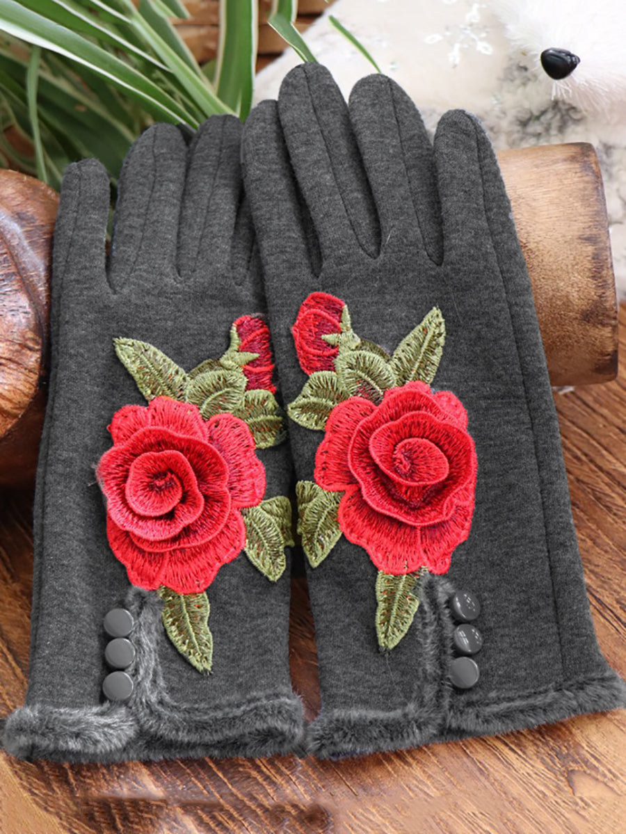 Women Ethnic Winter Embroidery Fleece-lined Gloves