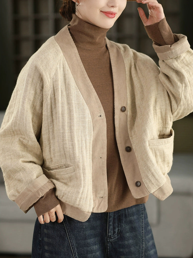 Women Winter Colorblock V-Neck 100%Linen Jacket