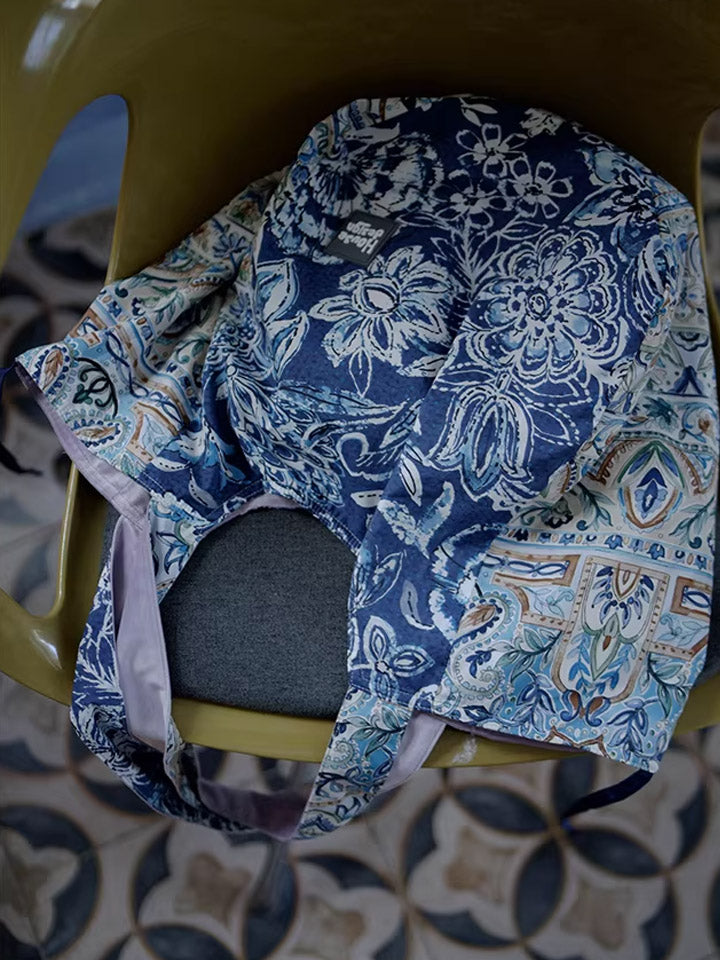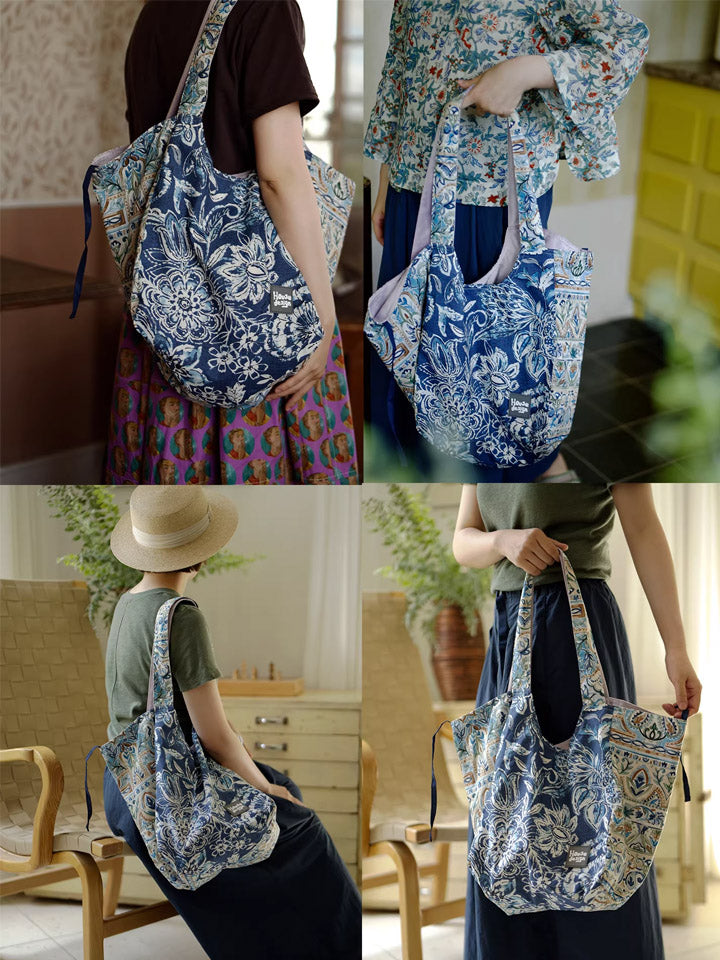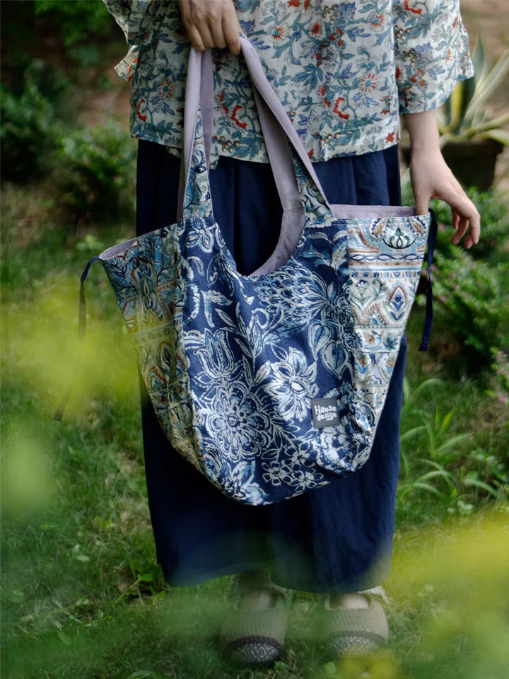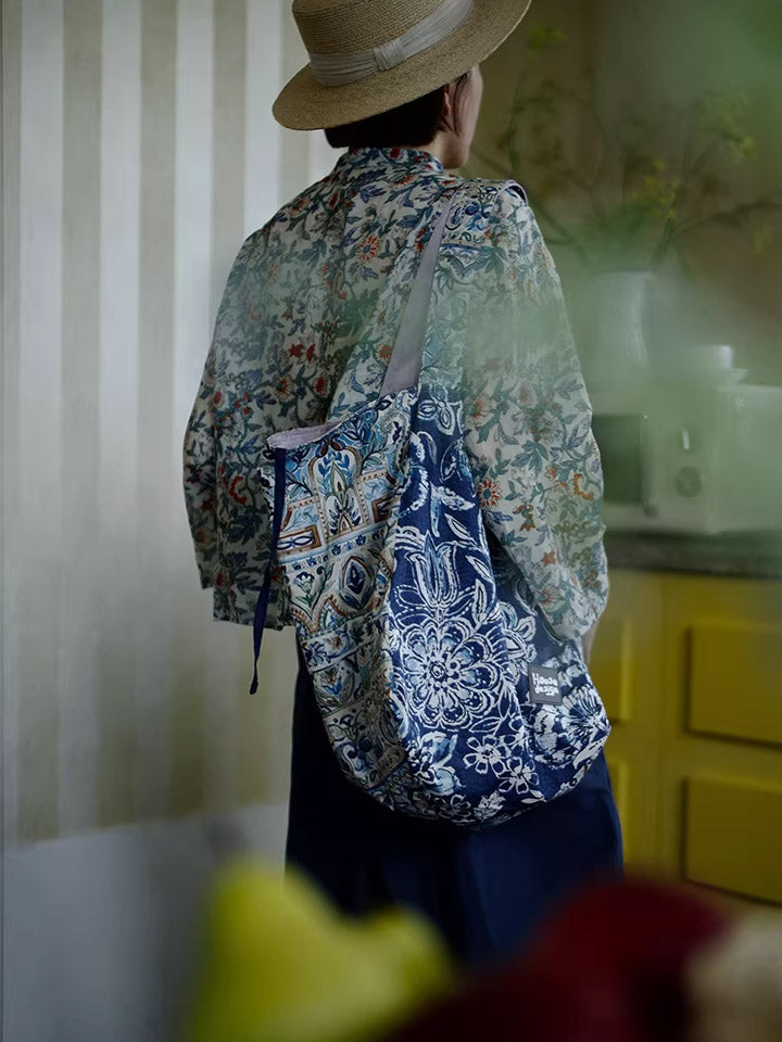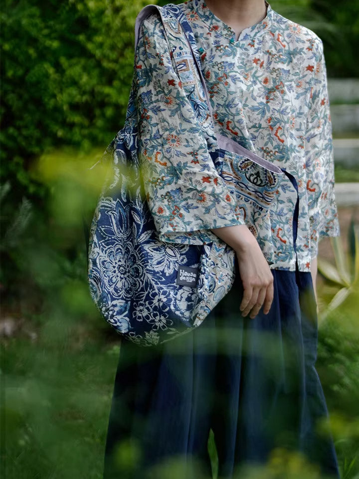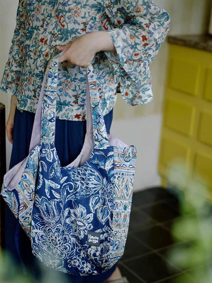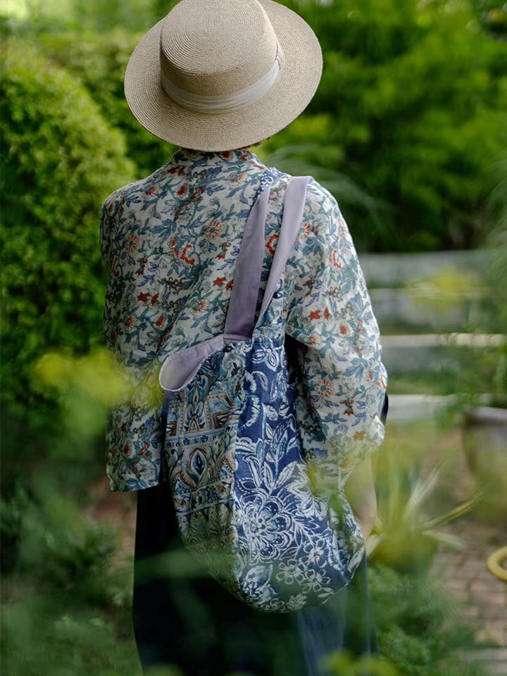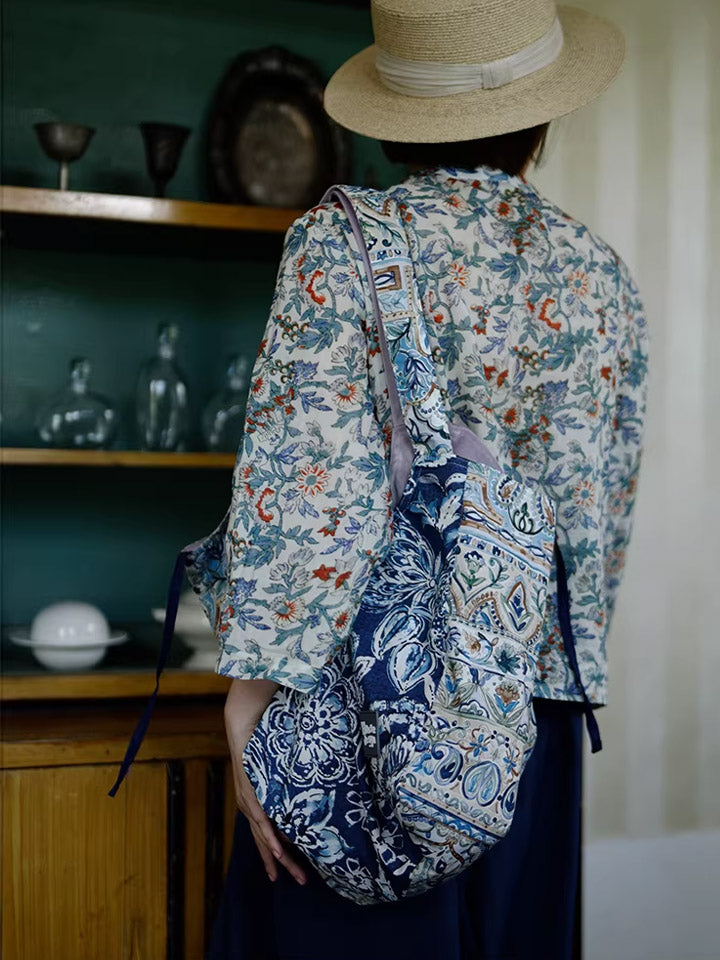 Retro Blue Floral Spliced Shoulder Bag