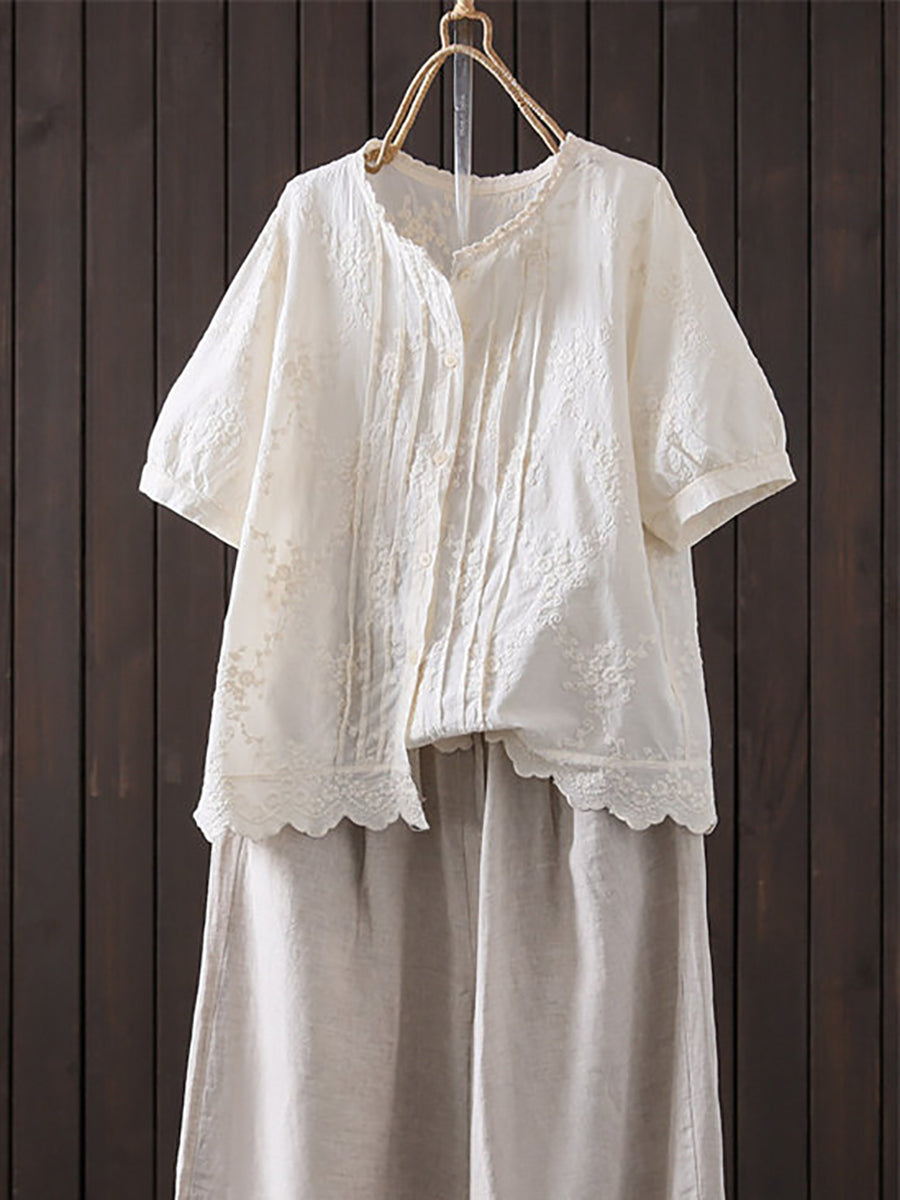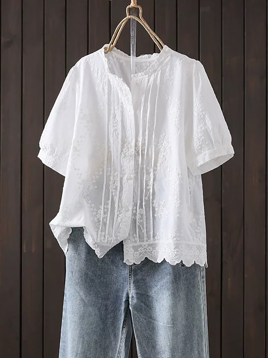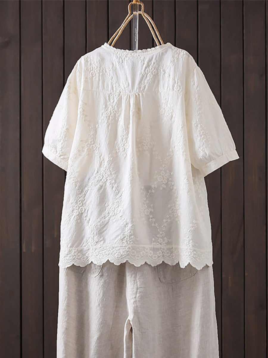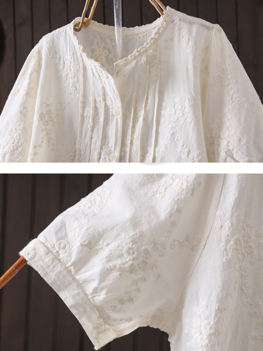 Plus Size Women Summer Artsy Embroidery 100%Cotton Shirt