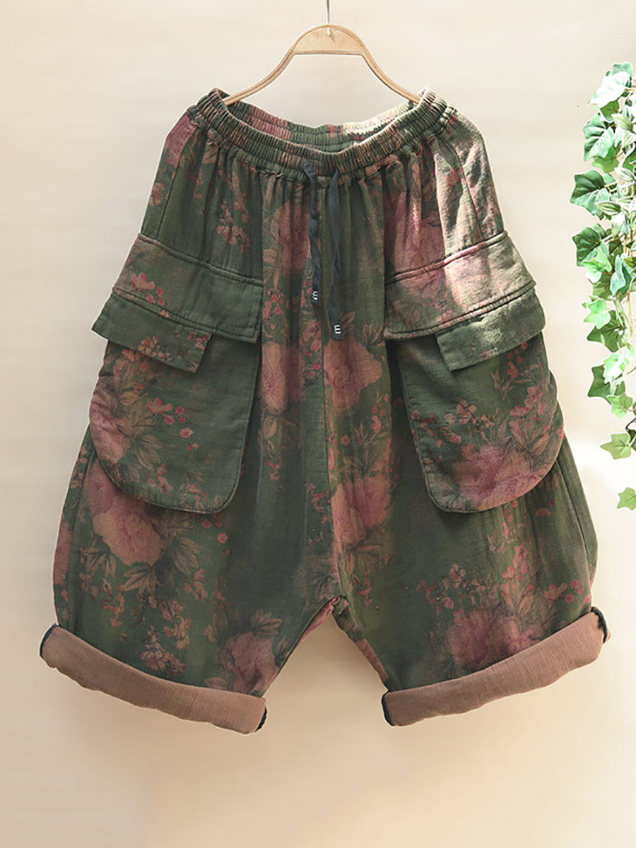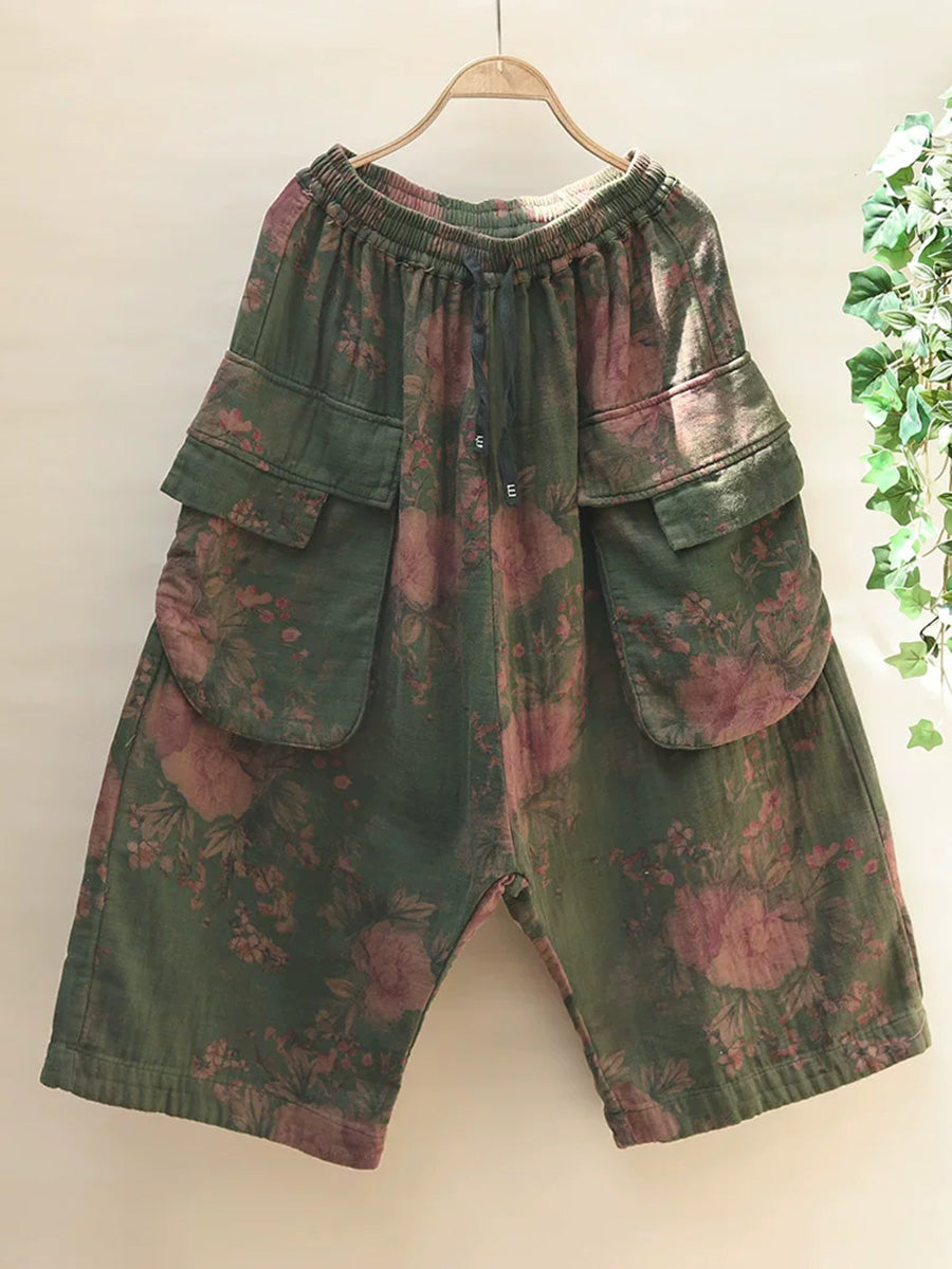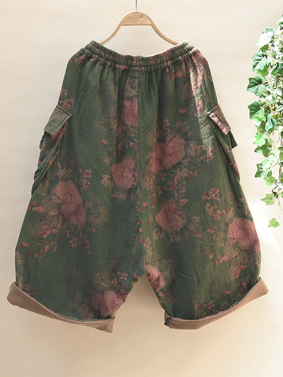 Plus Size Women Summer Retro Flower Wide-leg Cotton Pants