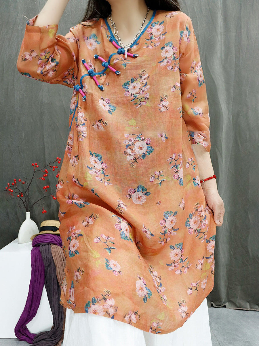 Women Summer Artsy Flower 100%Ramie V-Neck Blouse