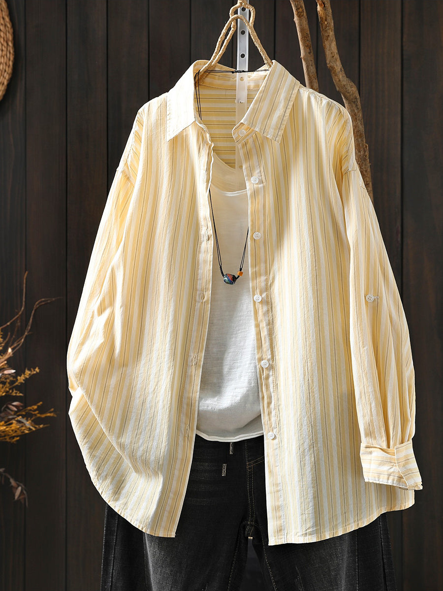 Women Spring Artsy Stripe 100%Cotton Turn-down Collar Shirt