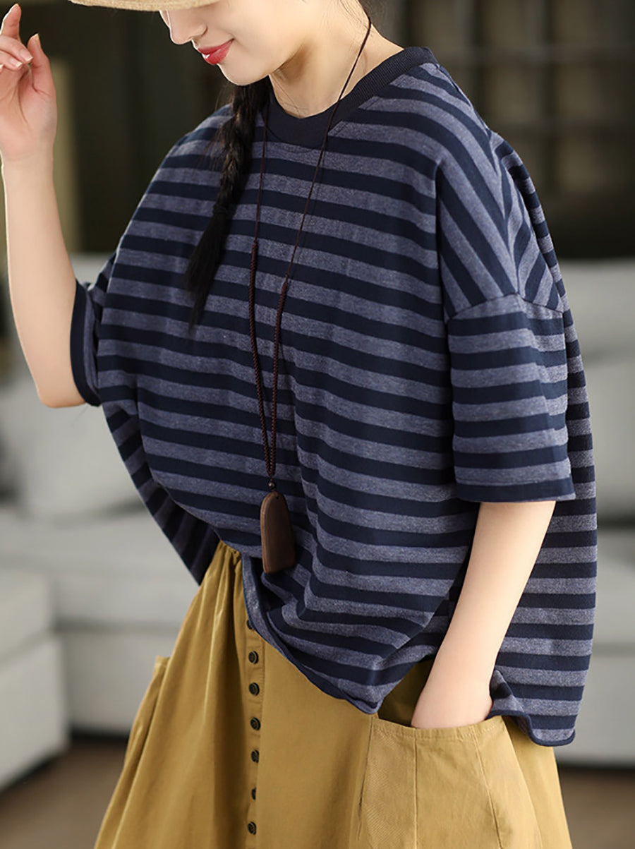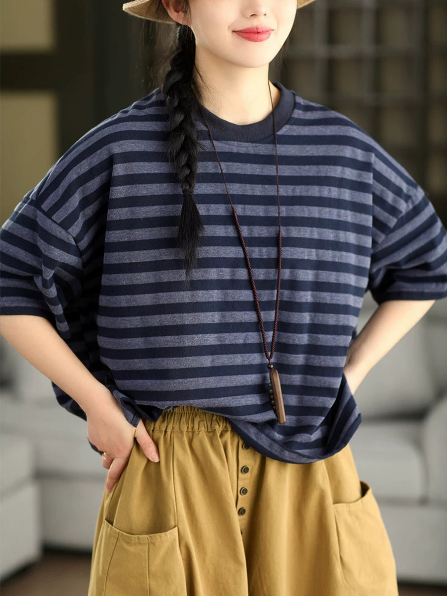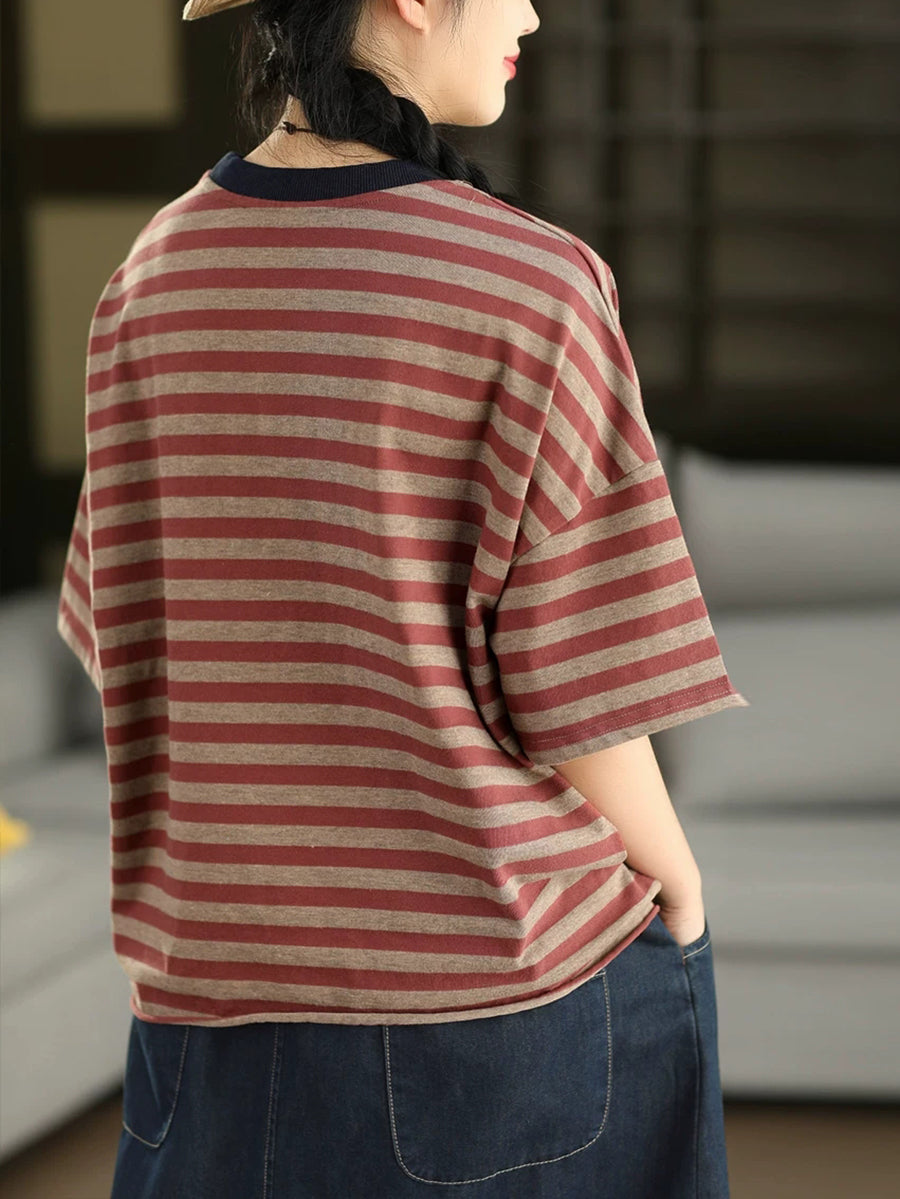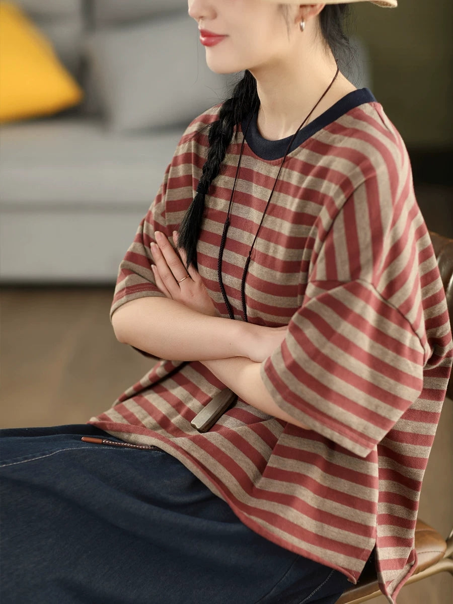 Women Summer Artsy Stripe O-Neck 100%Cotton T-Shirt