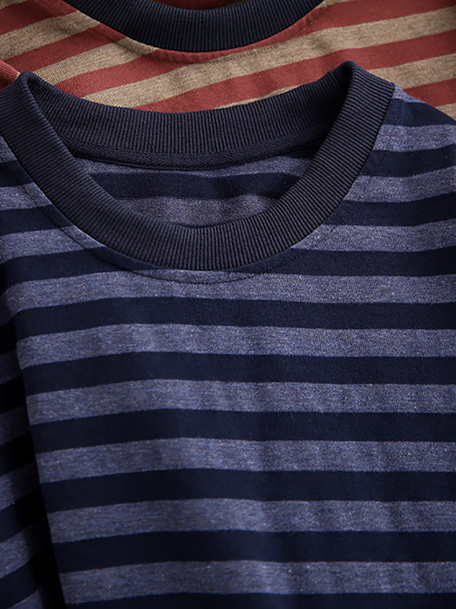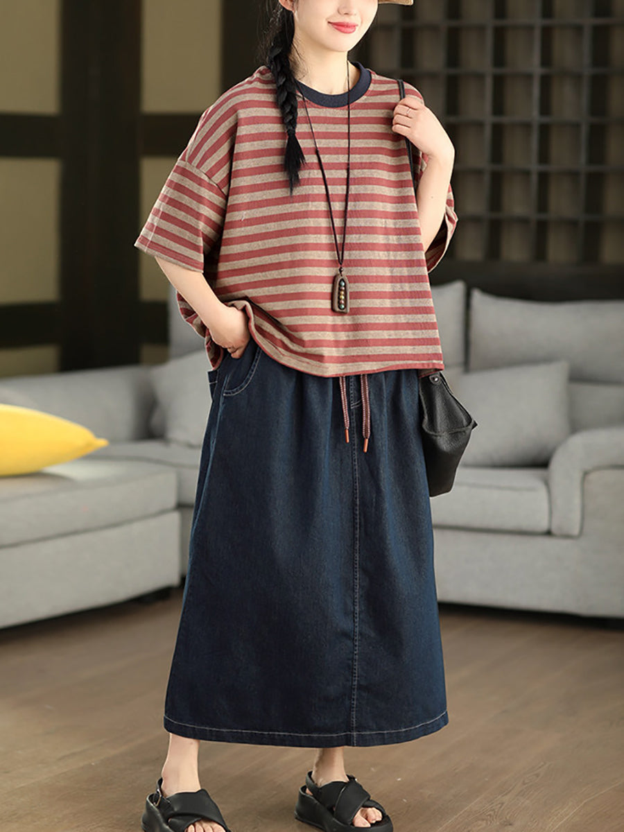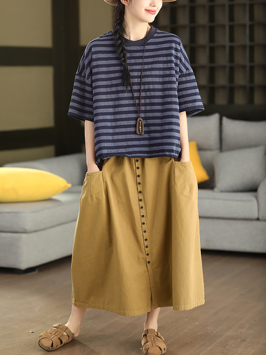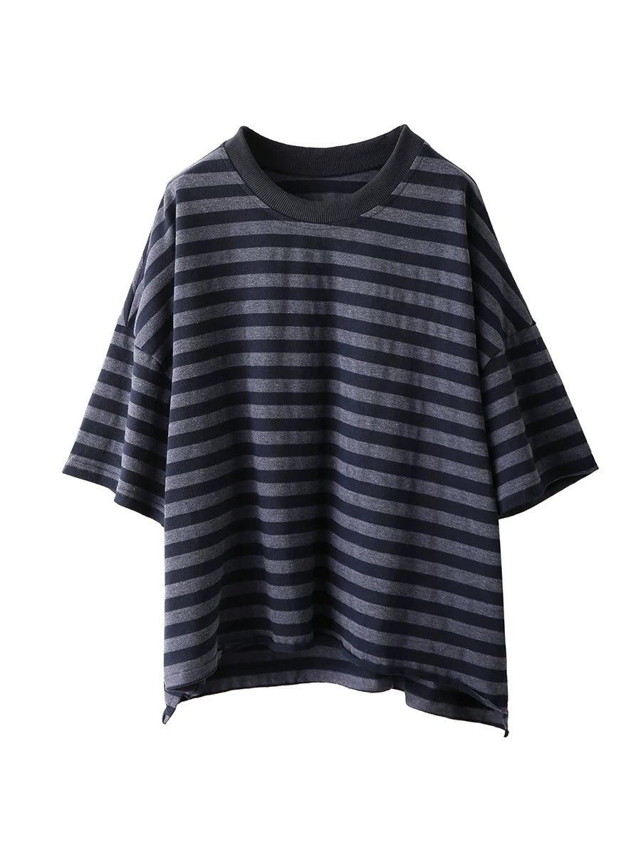 Women Summer Artsy Stripe O-Neck 100%Cotton T-Shirt