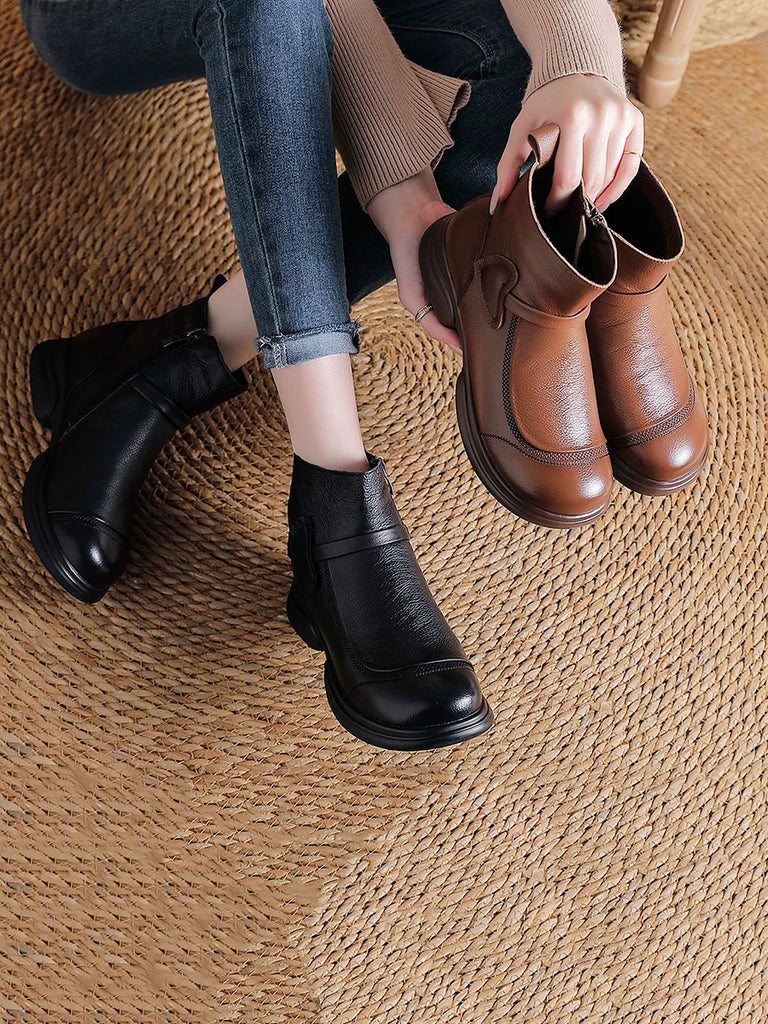 Women Winter Pure Color Leather Mid-Heel Boots