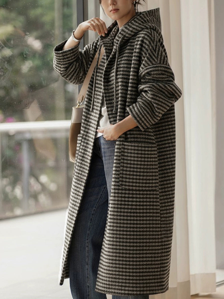 Plus Size Women Vintage Winter Stripe Hooded Coat