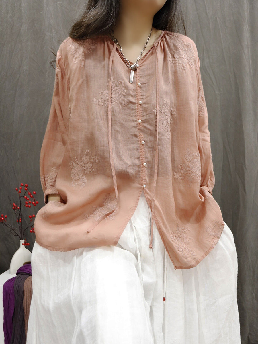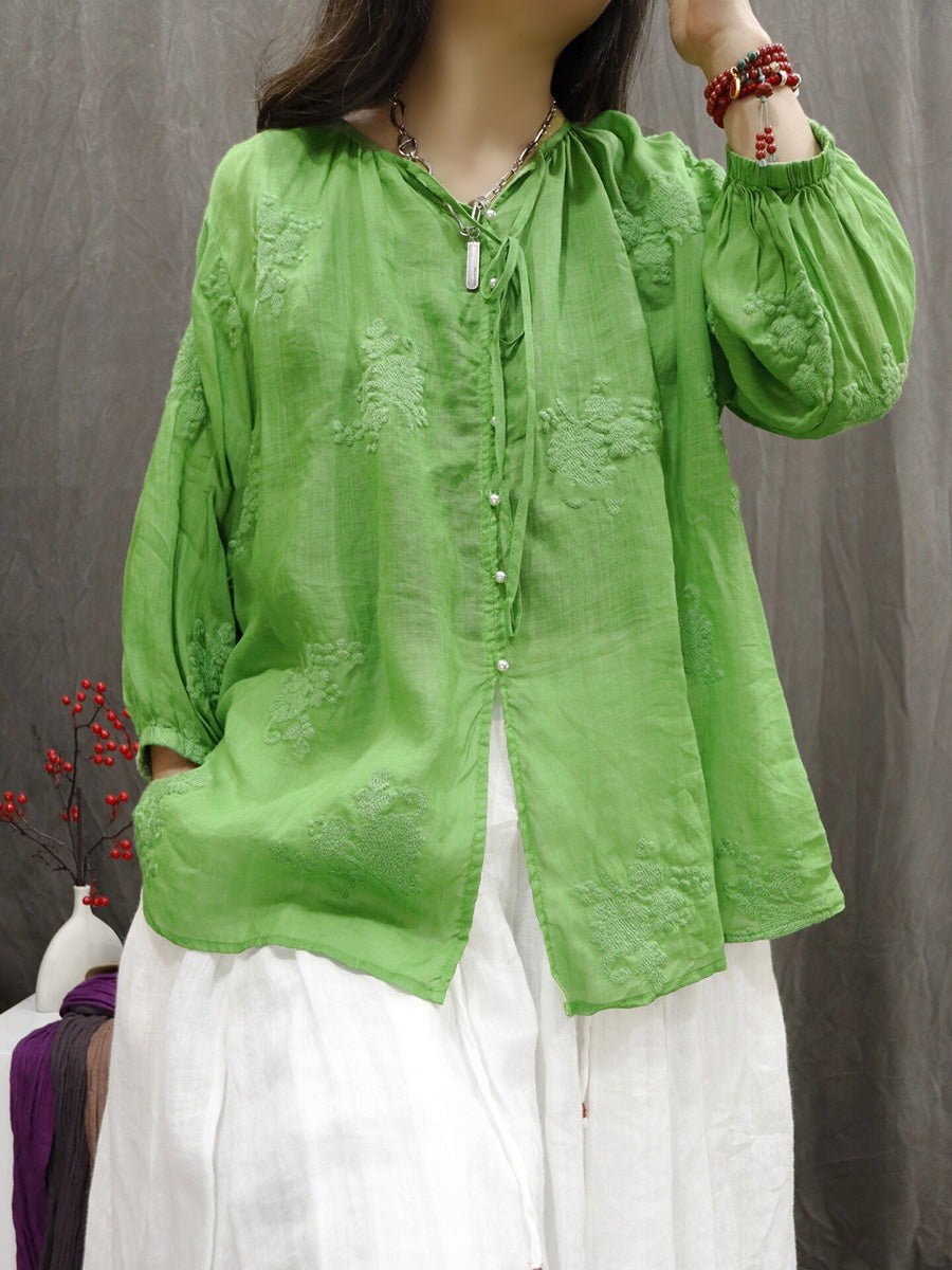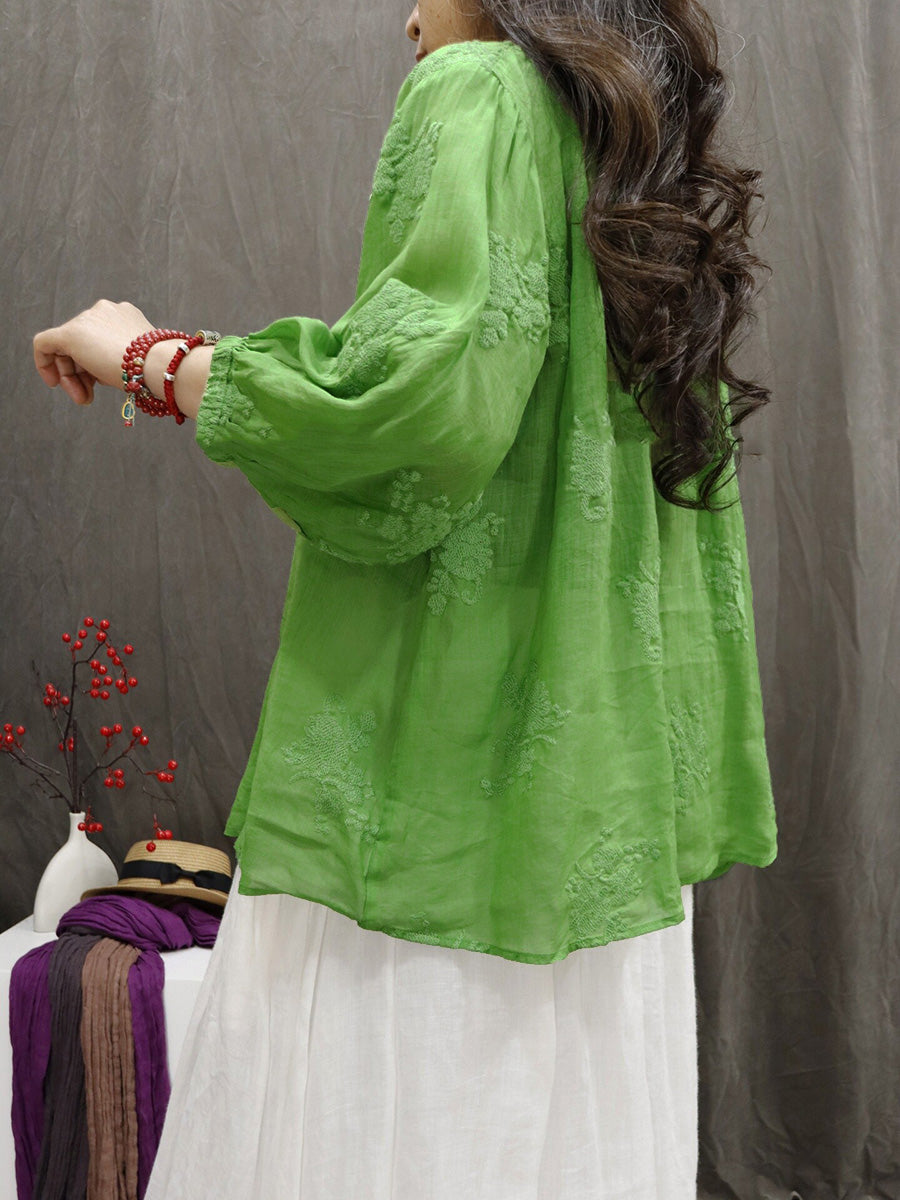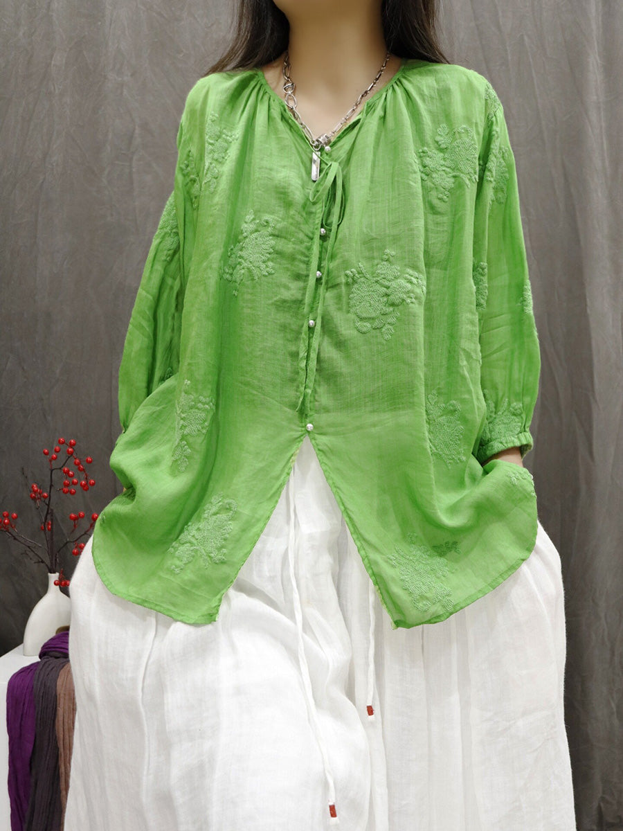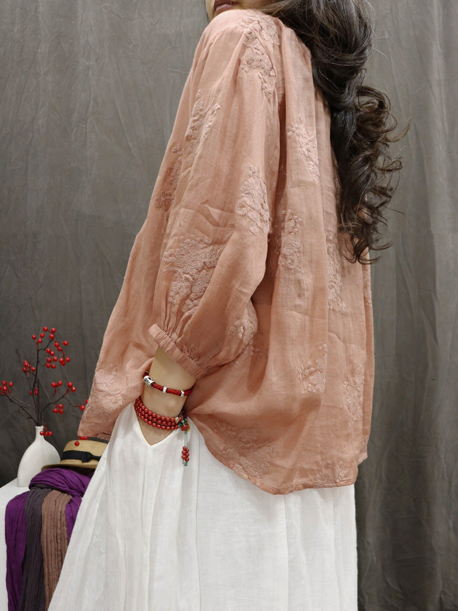 Women Artsy Summer Embroidery V-Neck 100%Ramie Blouse