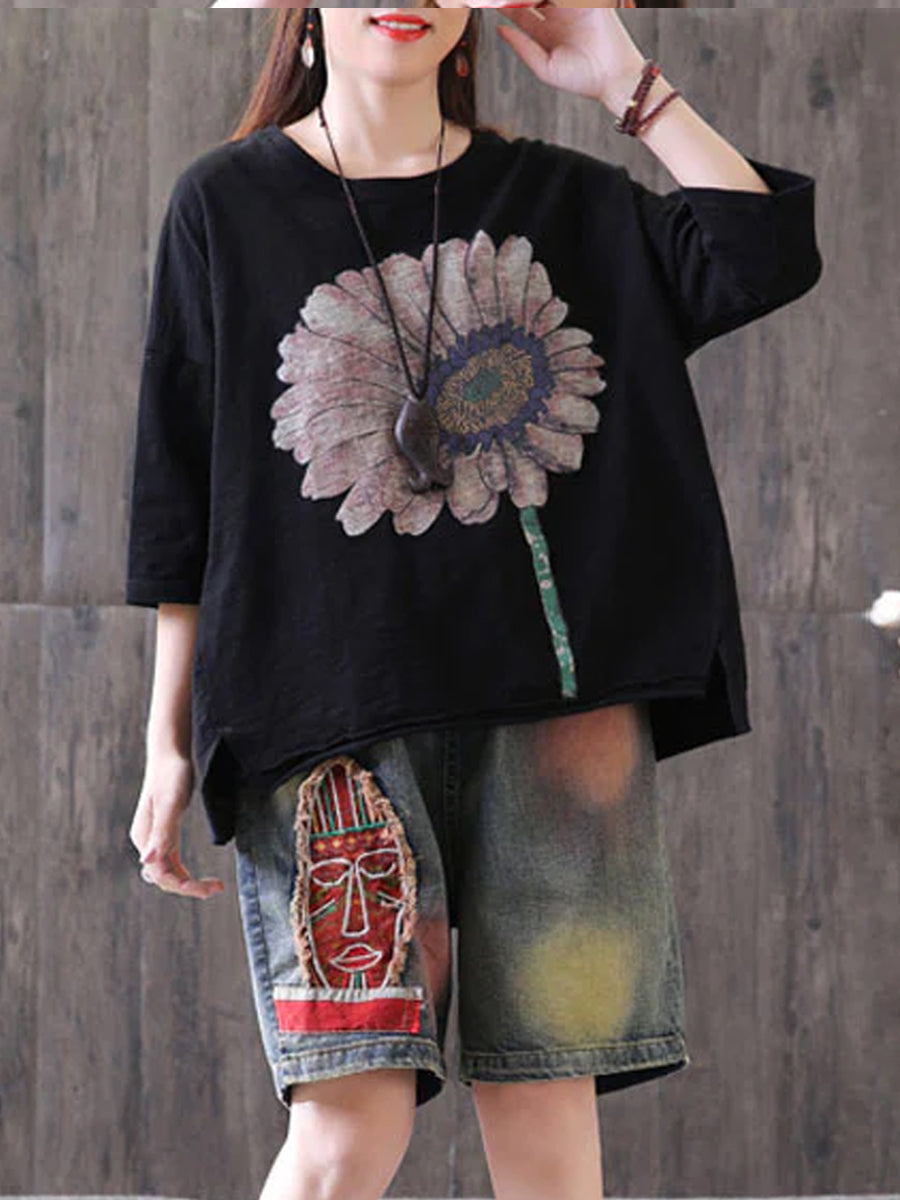 • Loose cotton sunflower printed red top, has a round neck, three quarter sleeve, you'll enjoy wearing across spring, summer, autumn.