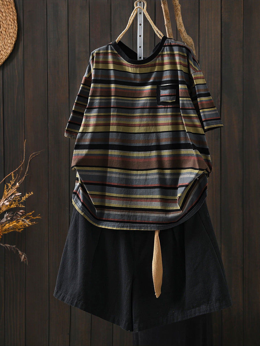 Women Summer Casual Stripe Cotton O-Neck T-Shirt