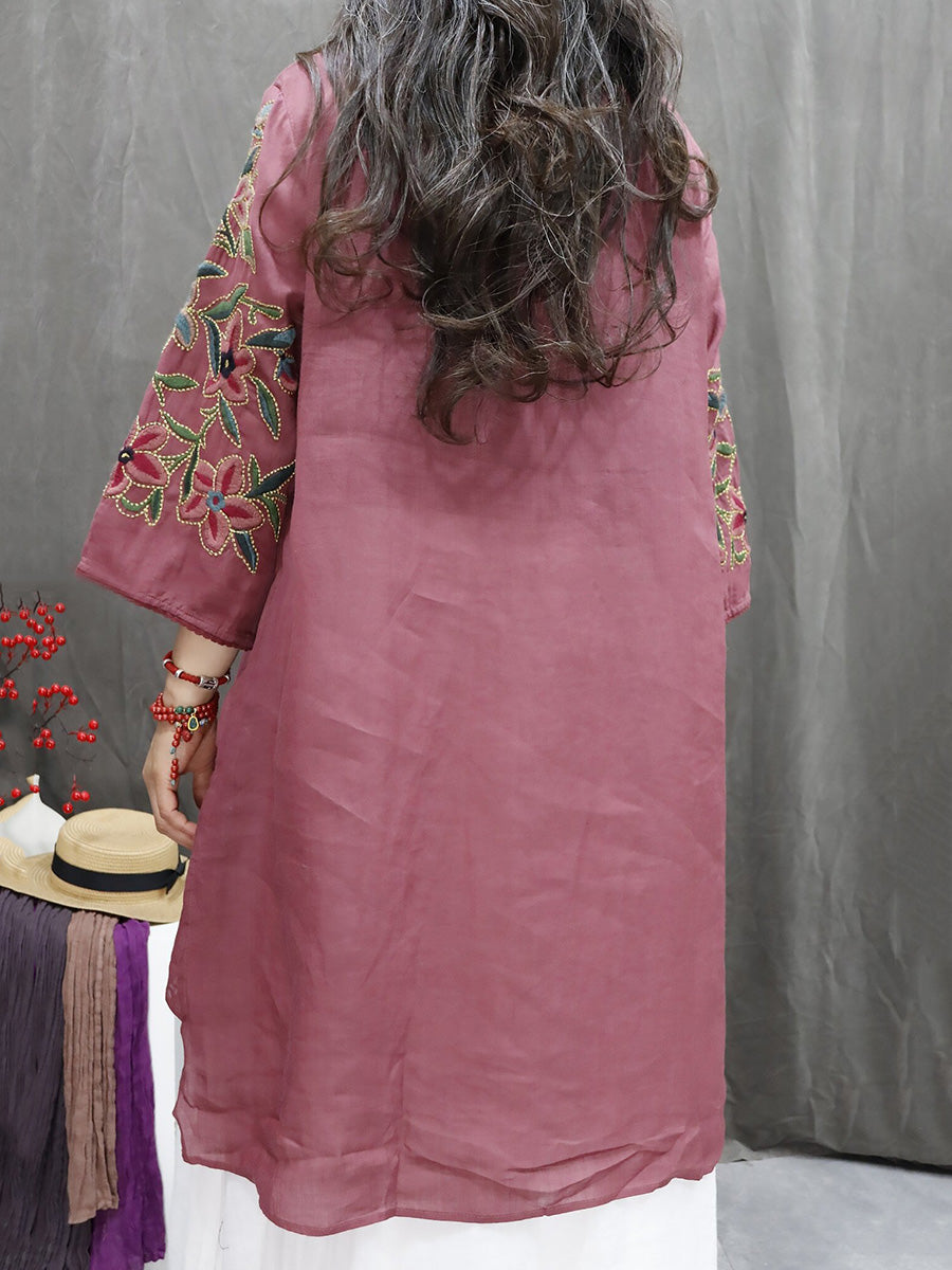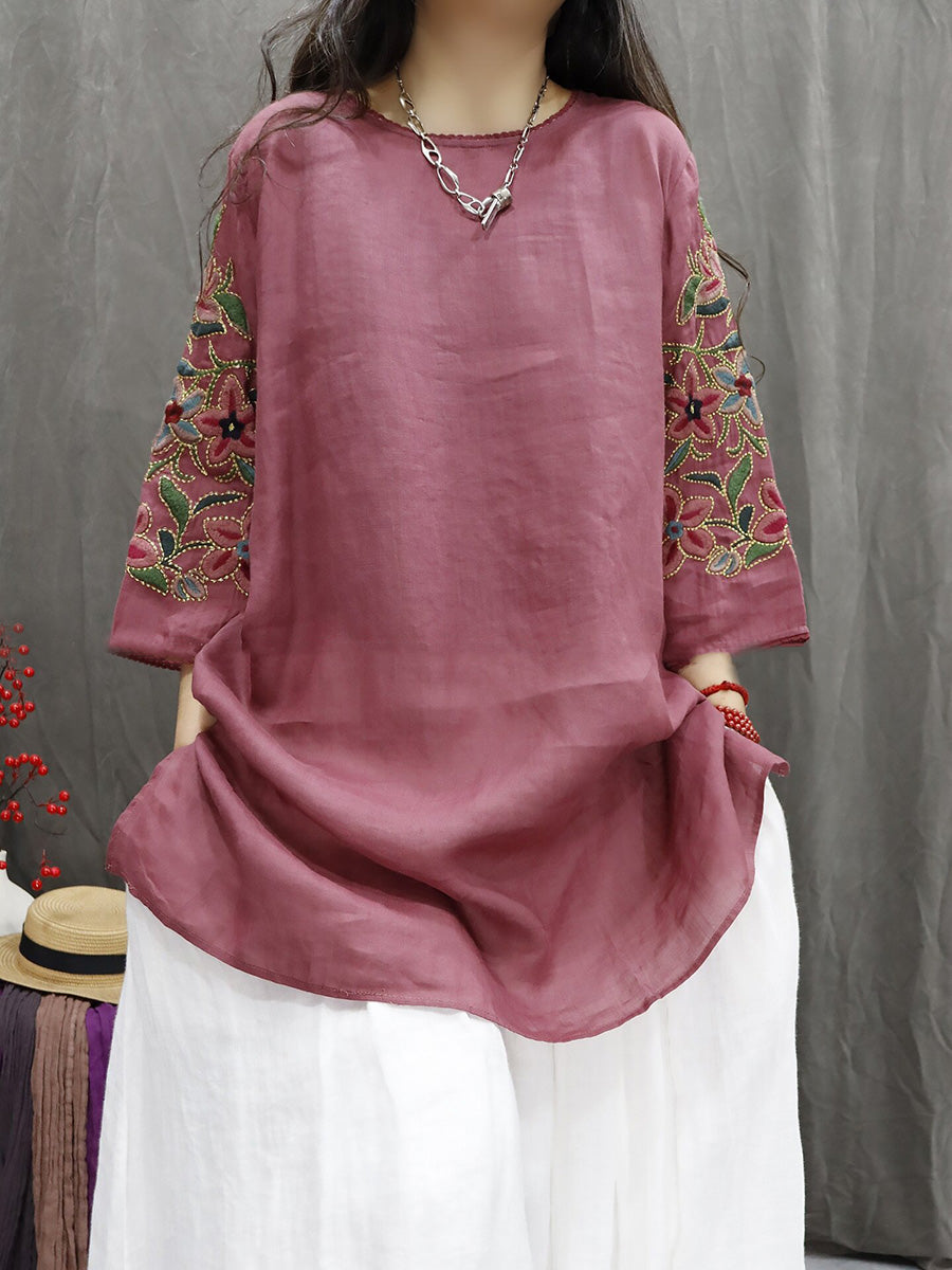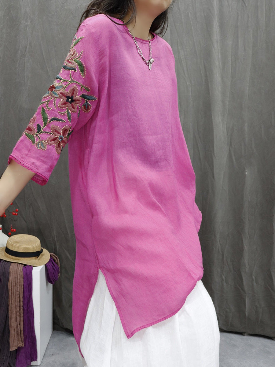 Women Artsy Embroidery Flower O-Neck 100%Ramie Blouse
