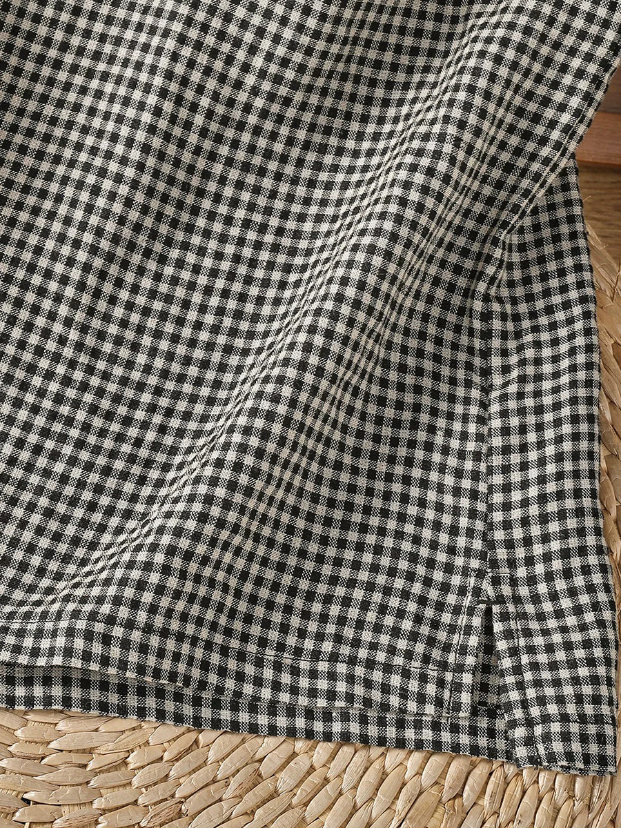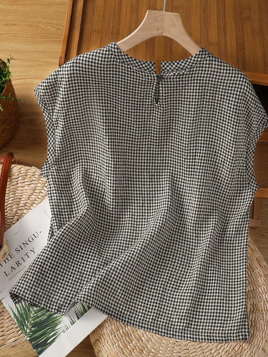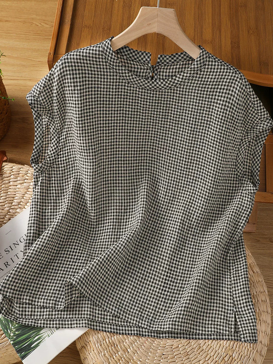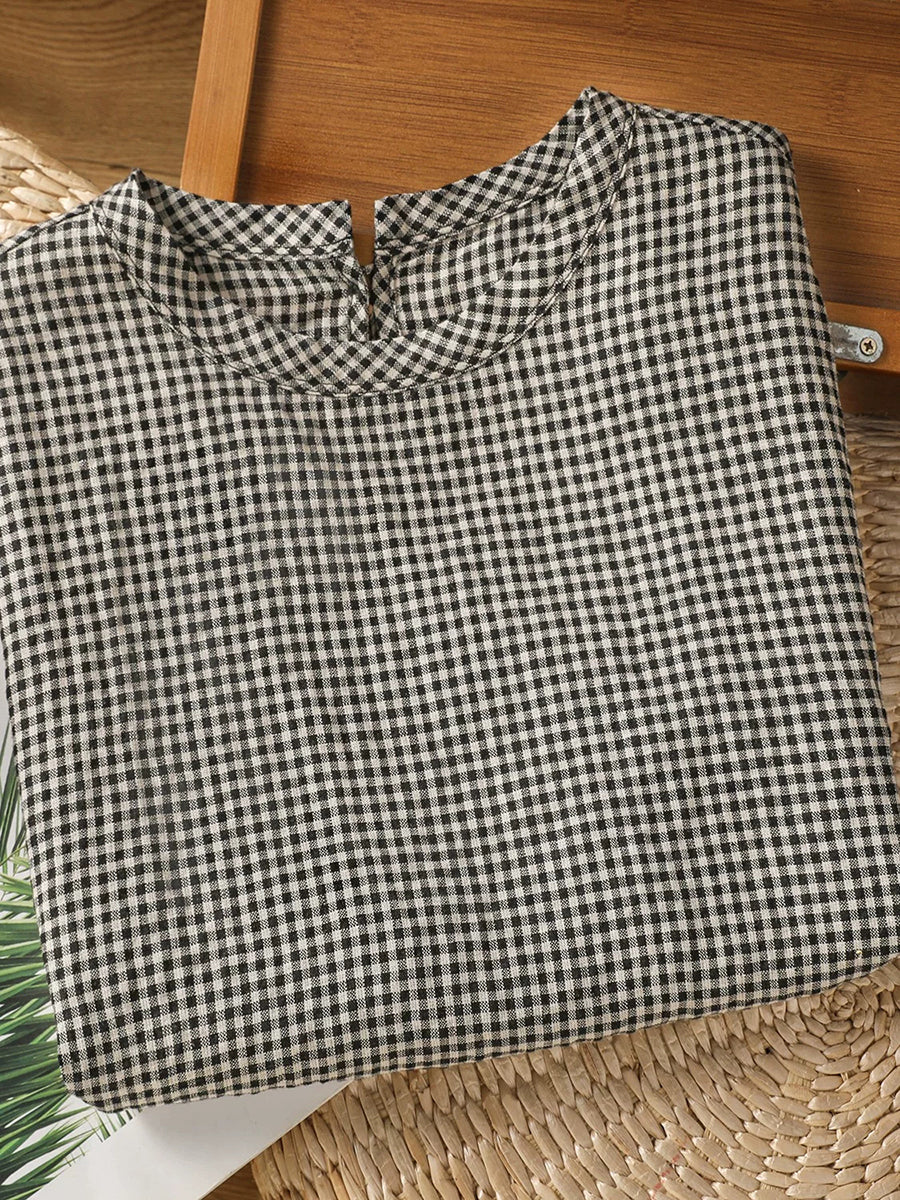 Women Summer Retro Lattice O-Neck Blouse