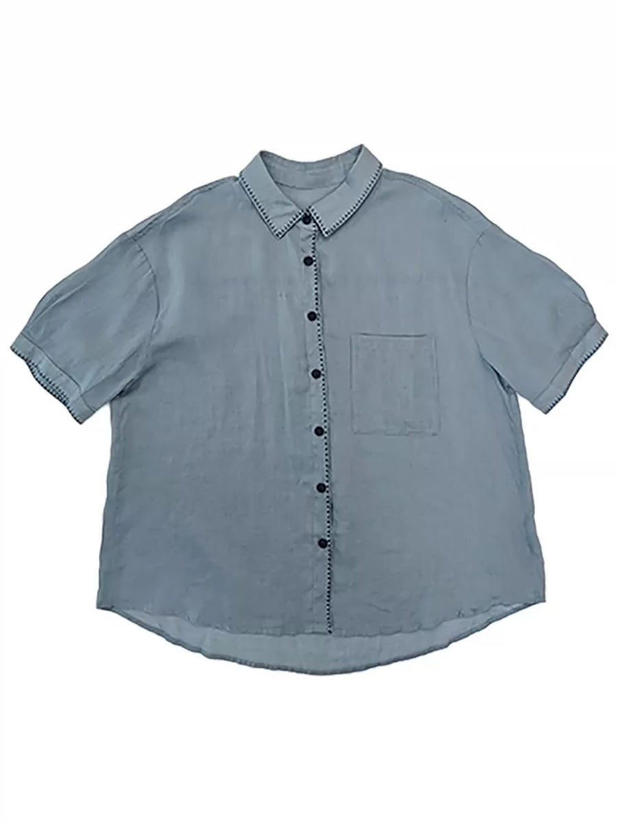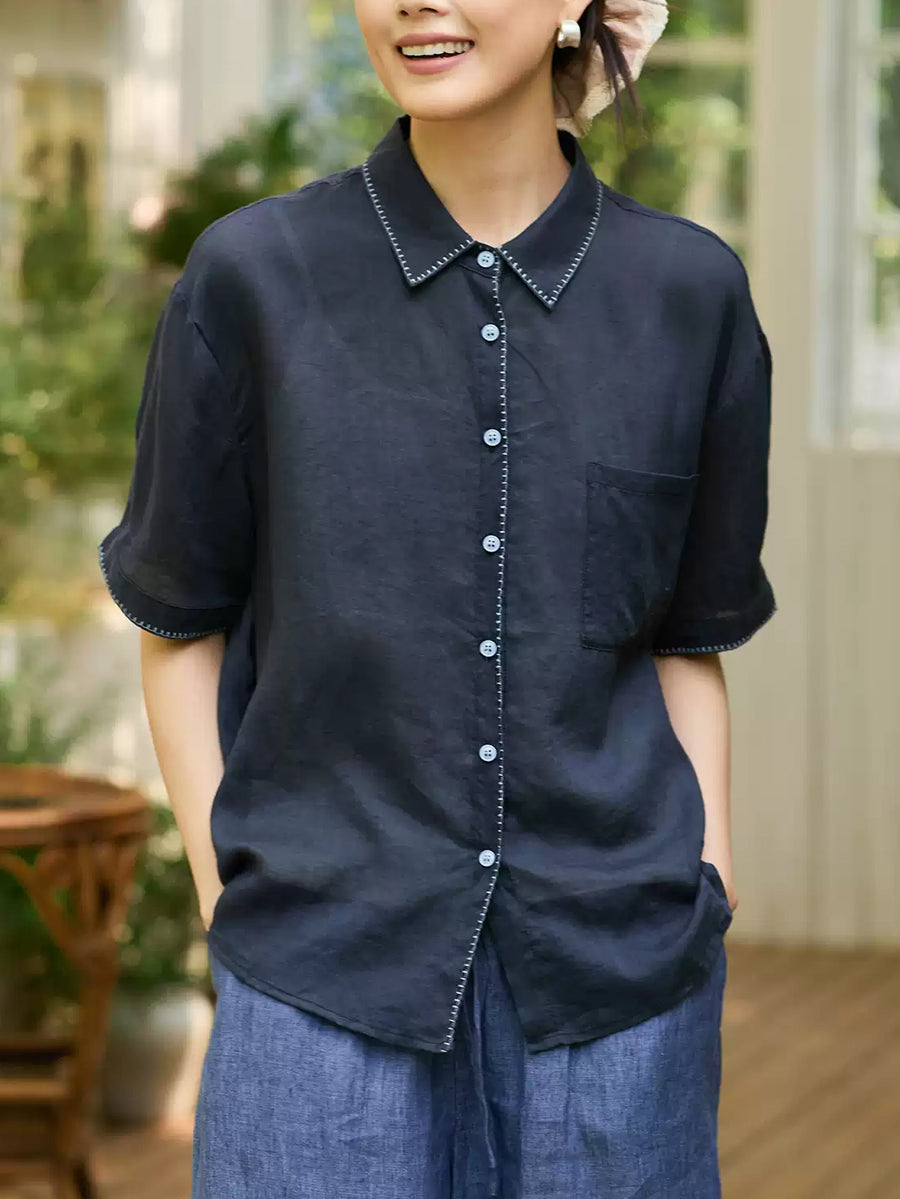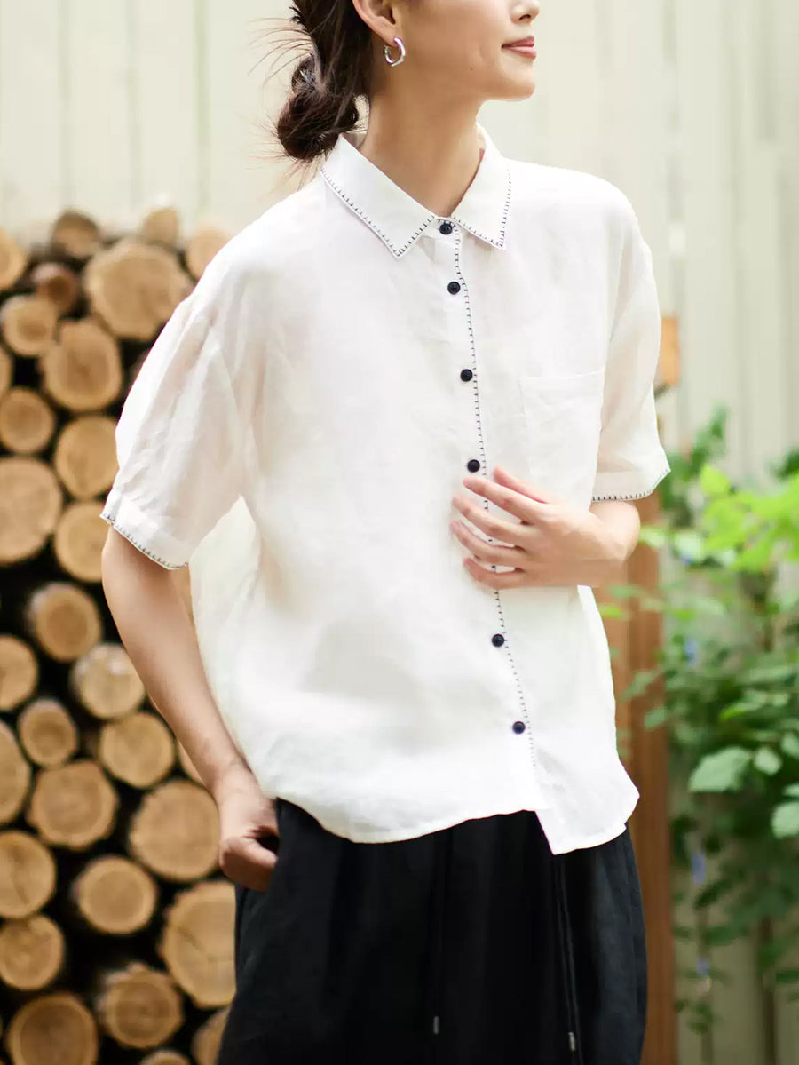 Women Summer Artsy Ramie Turn-down Collar Shirt