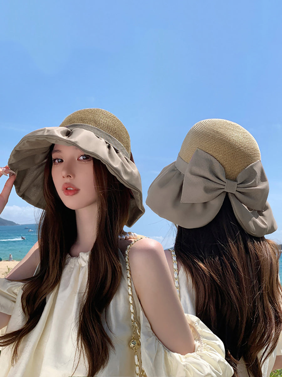 Women Summer Colorblock Straw Bowknot Sunproof Hat