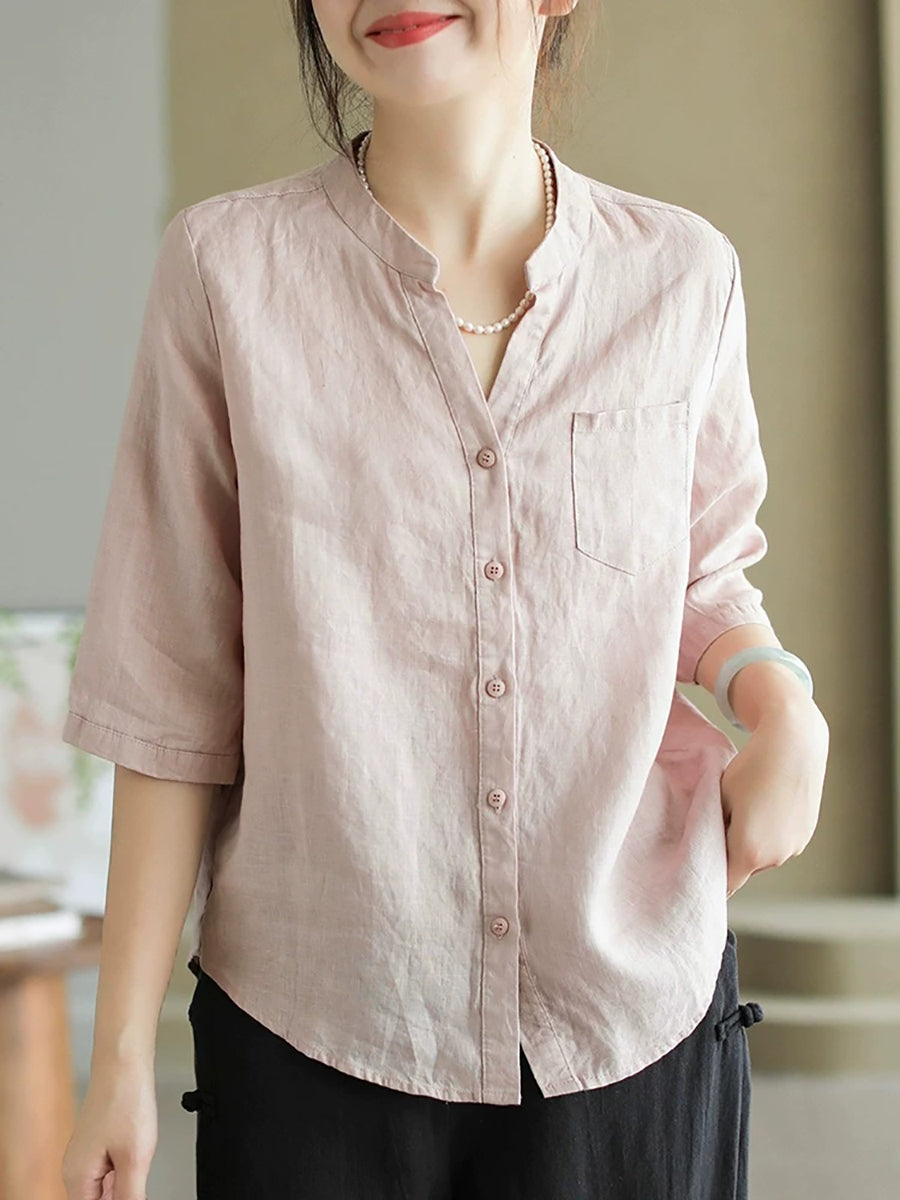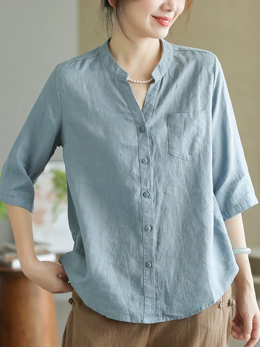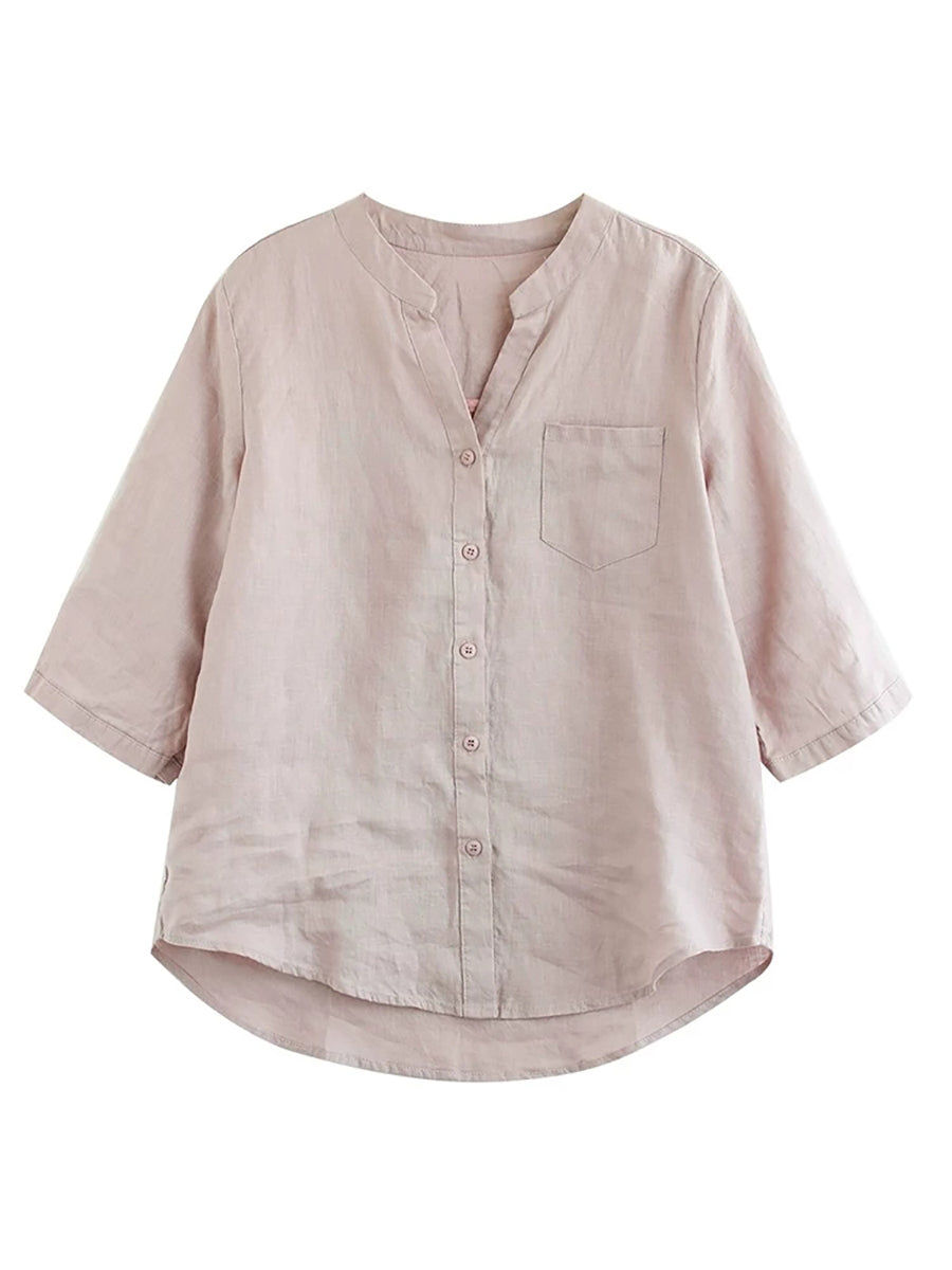 Women Summer Pure Color V-Neck 100%Linen Shirt