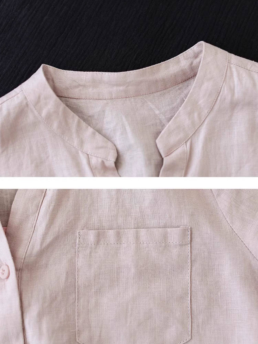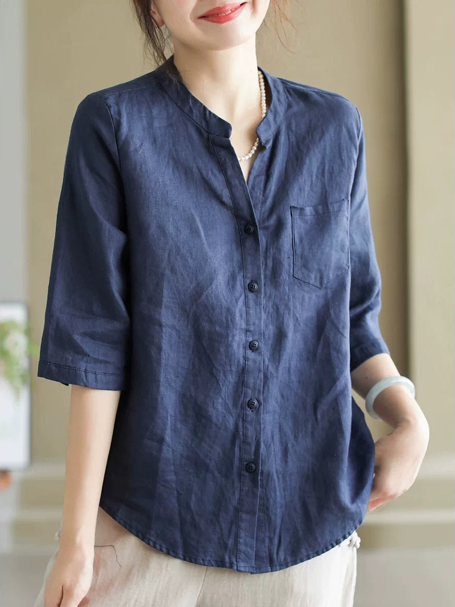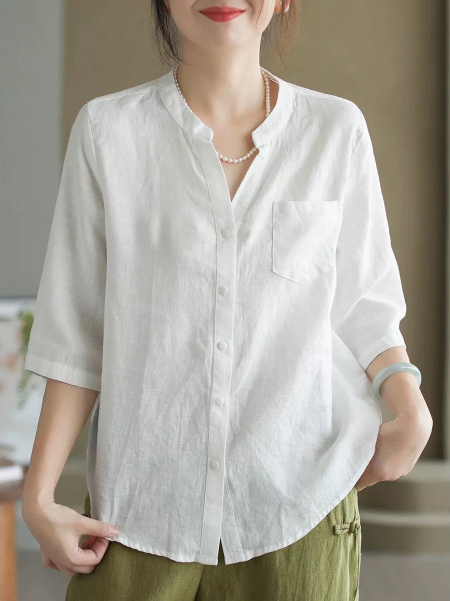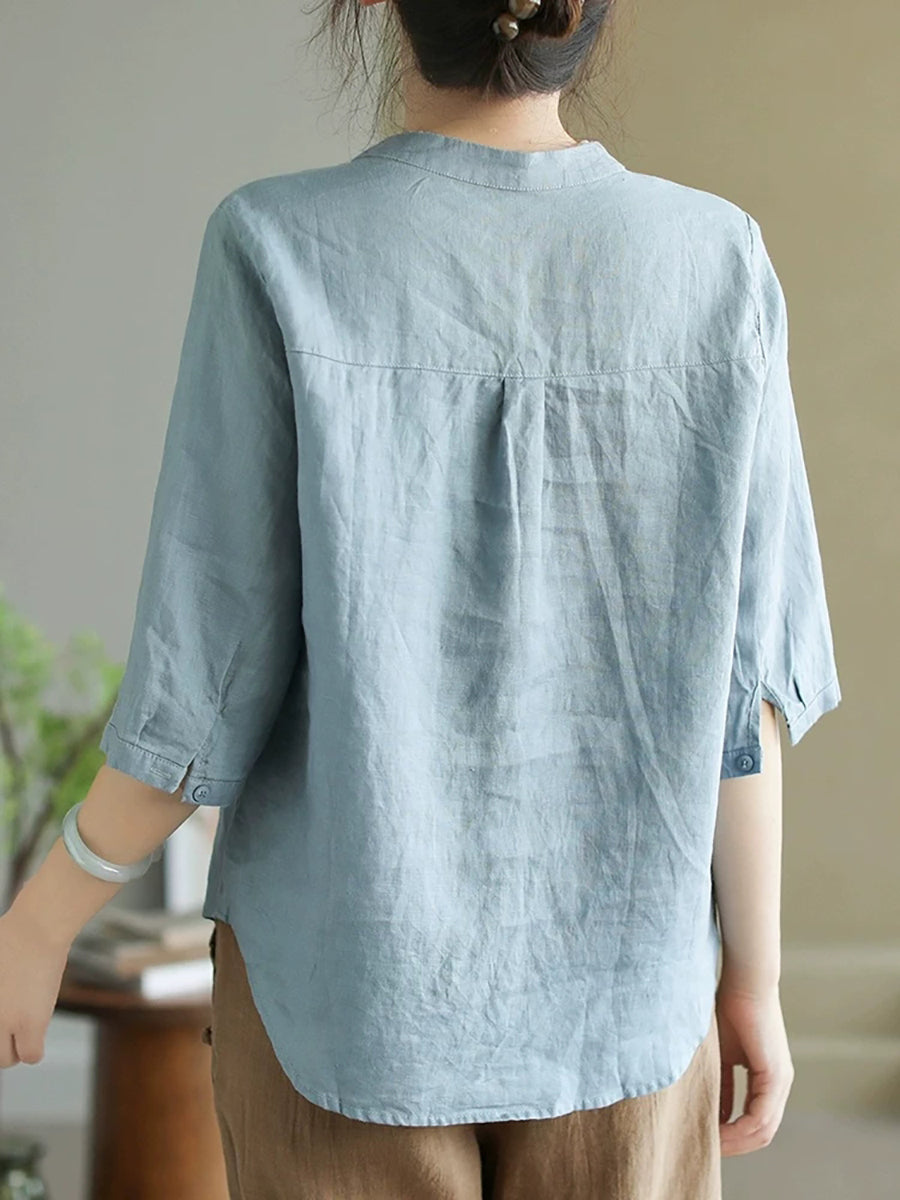 Women Summer Pure Color V-Neck 100%Linen Shirt