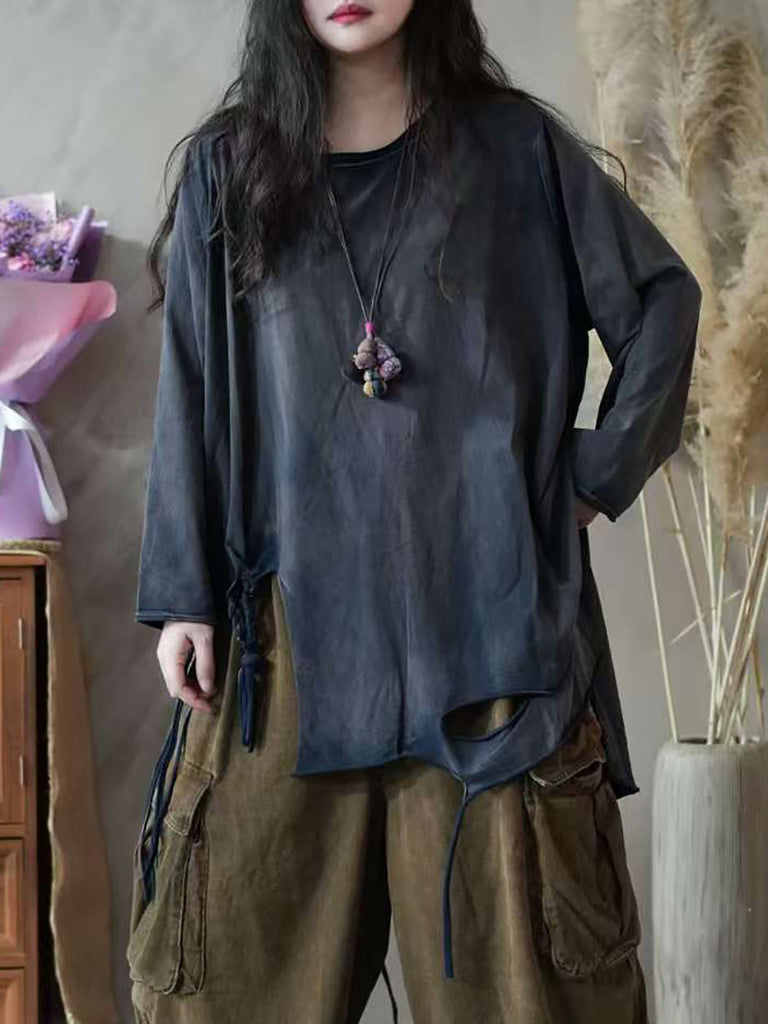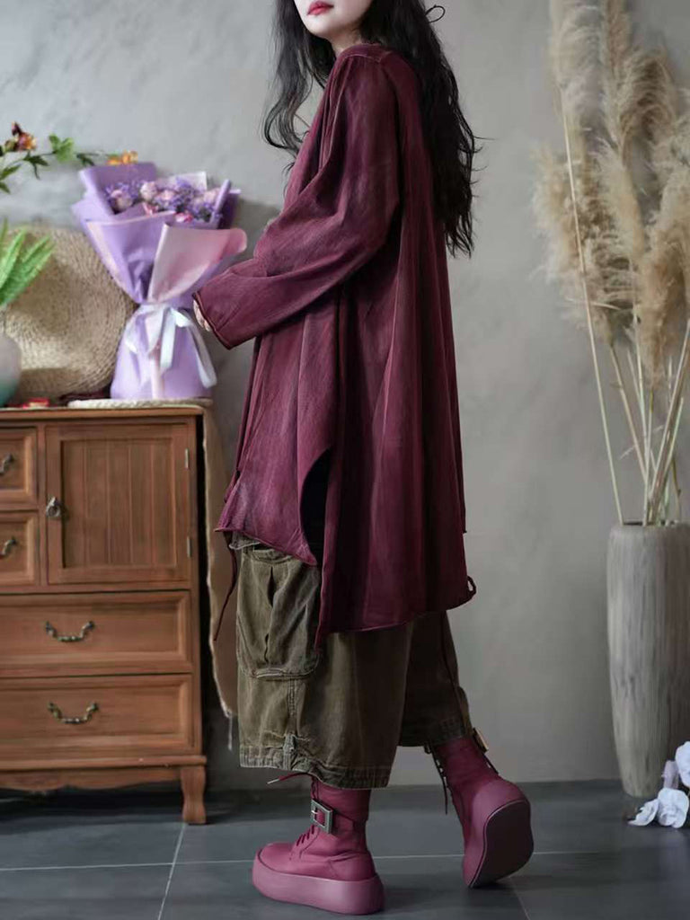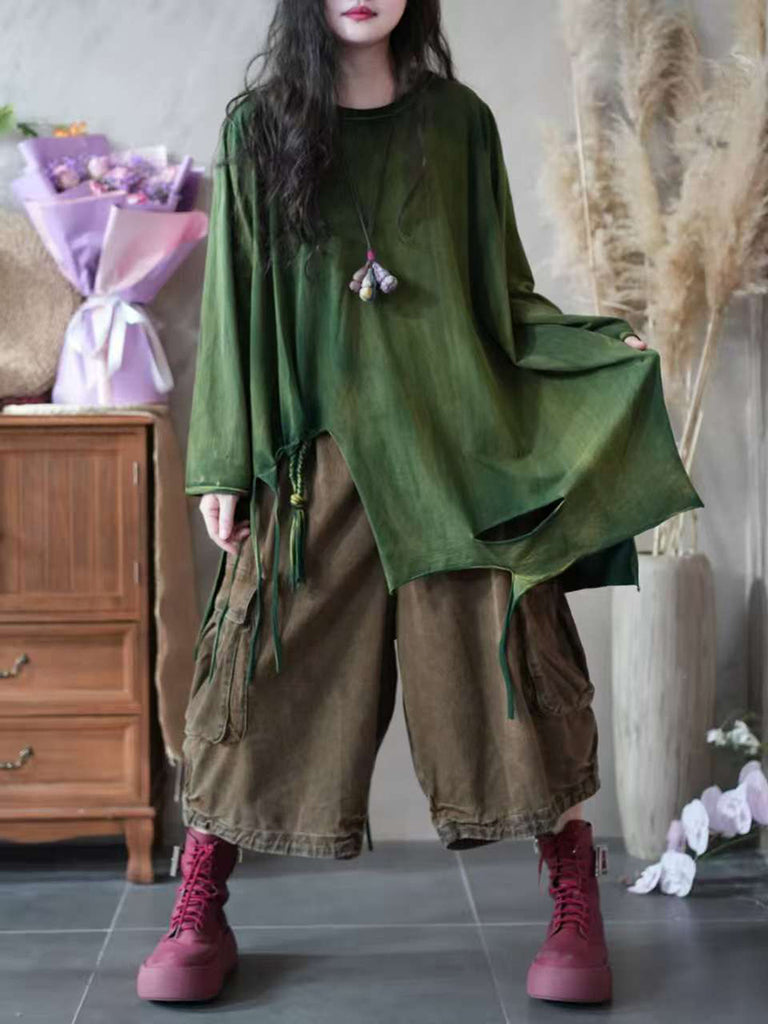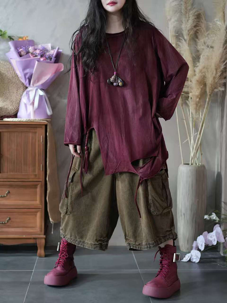 Women Autumn Retro Split Hem 100%Cotton O-Neck Blouse