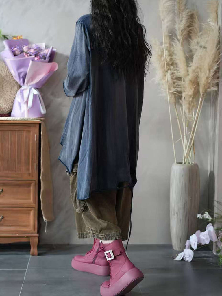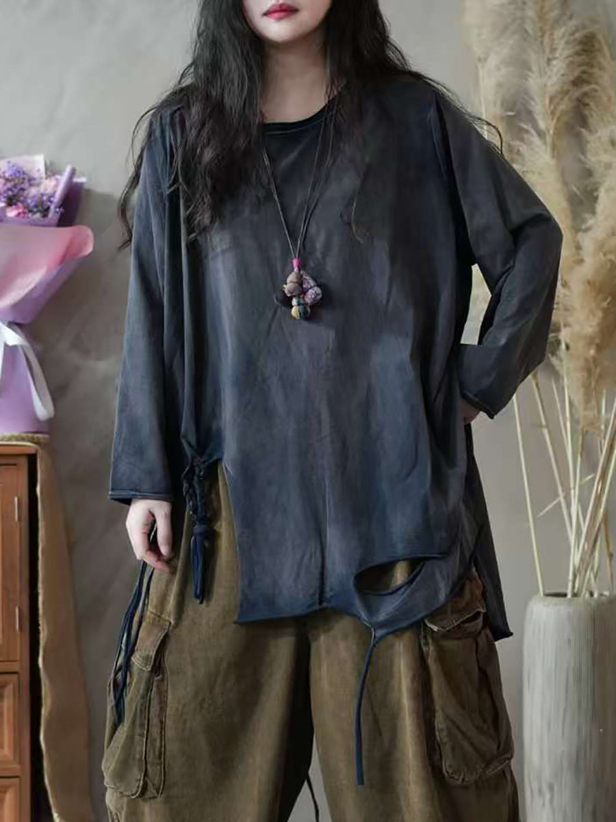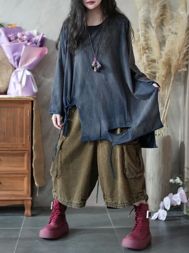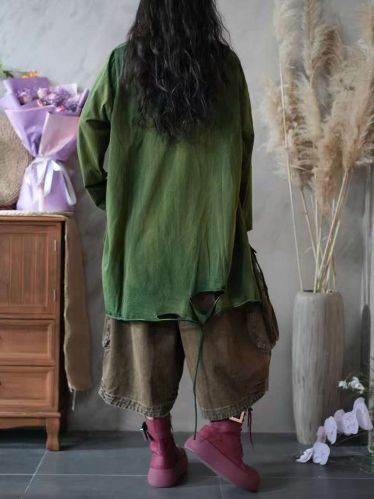 Women Autumn Retro Split Hem 100%Cotton O-Neck Blouse