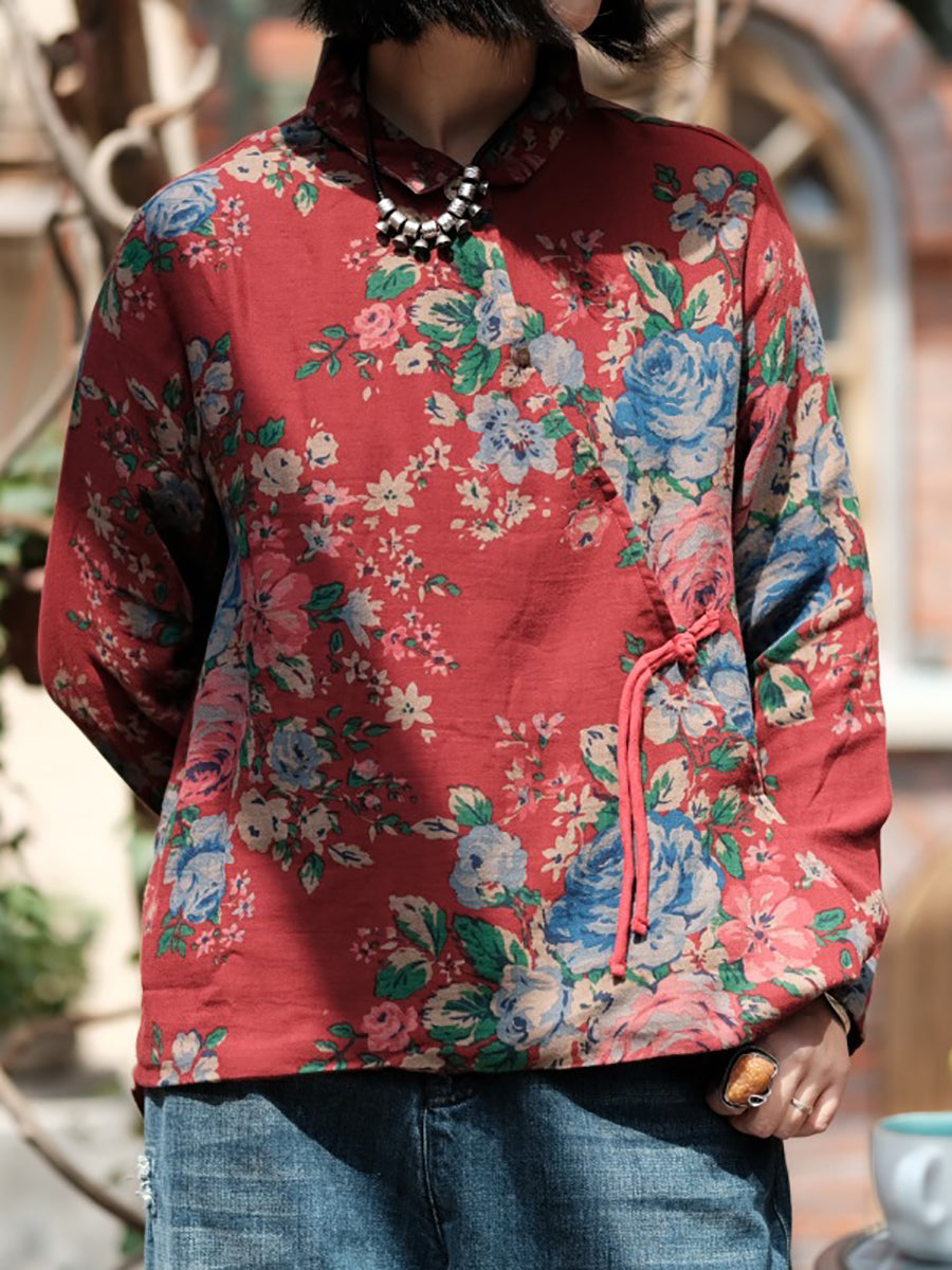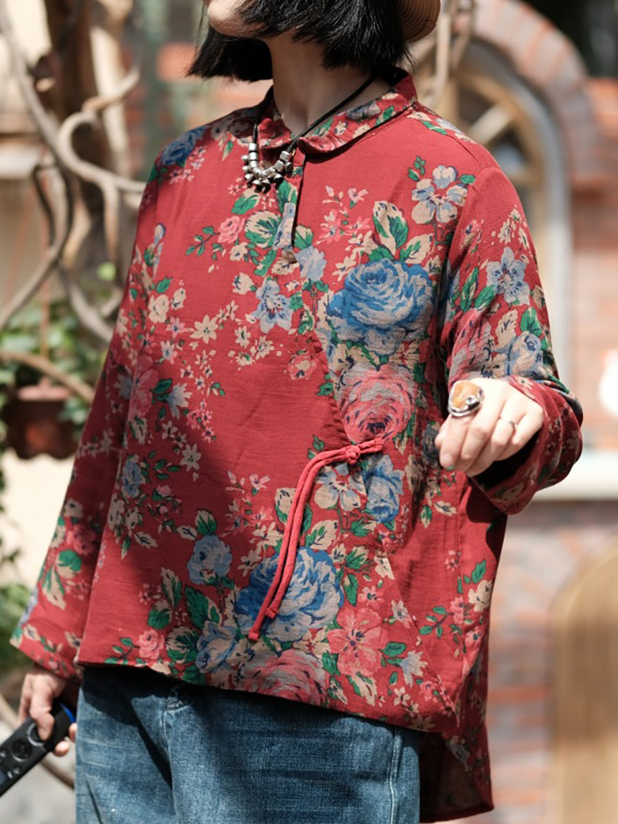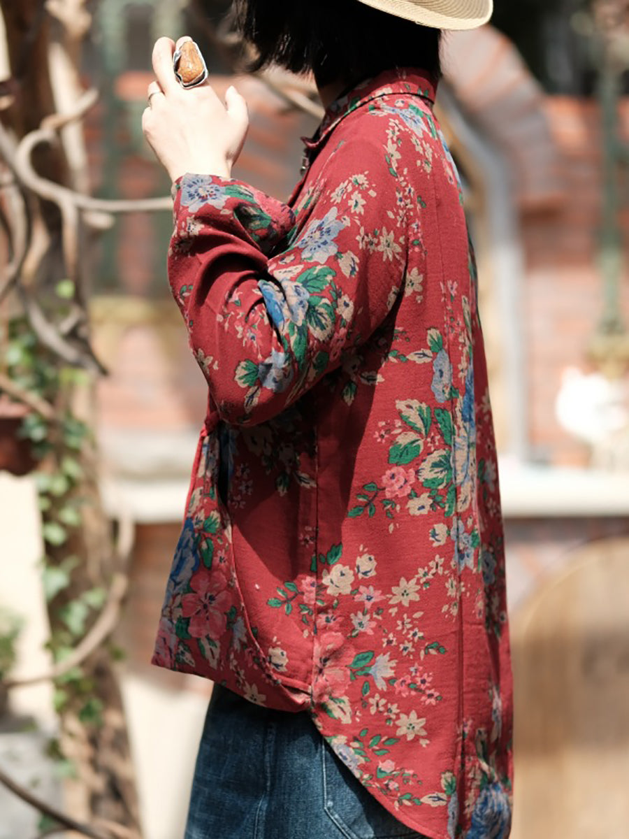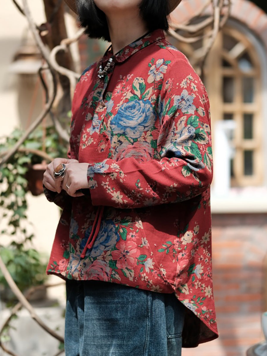 Women Spring Vintage Flower Turn-down Collar 100%Cotton Shirt