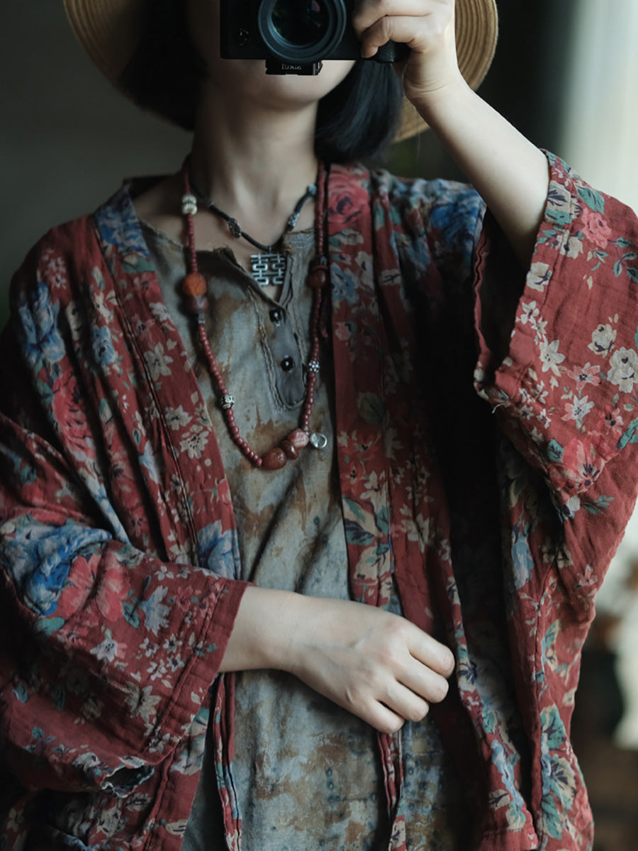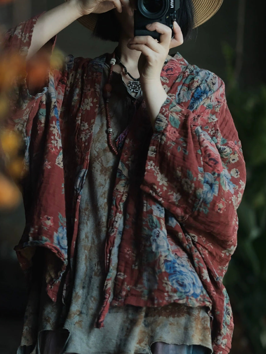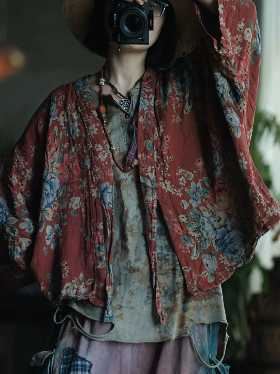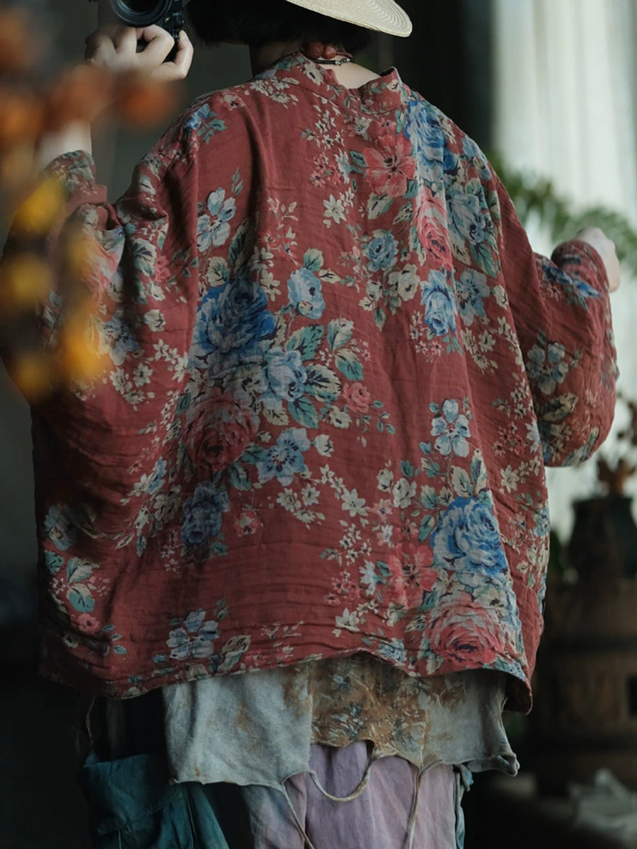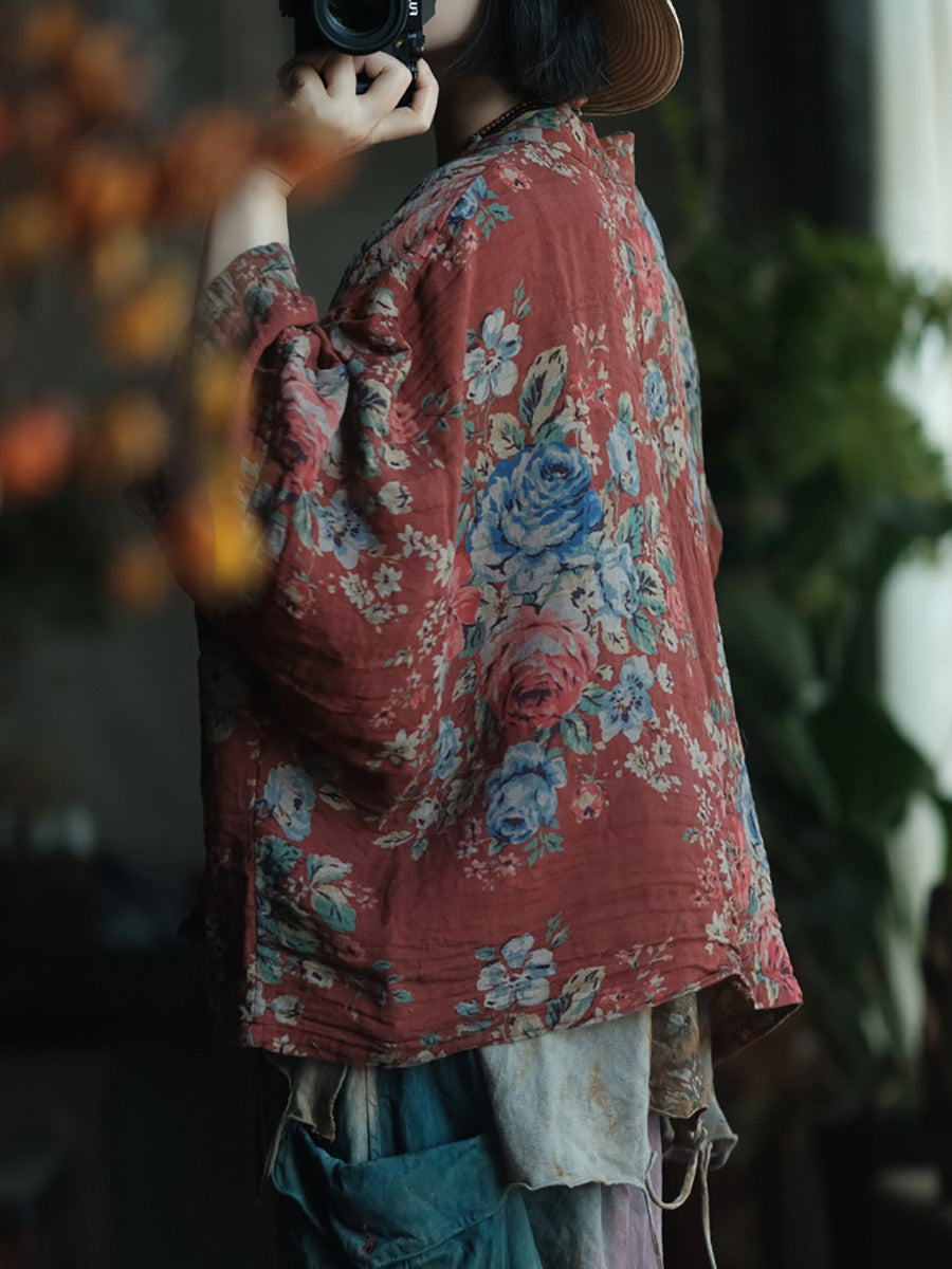 Women Spring Retro Flower V-Neck Cotton Shirt Coat