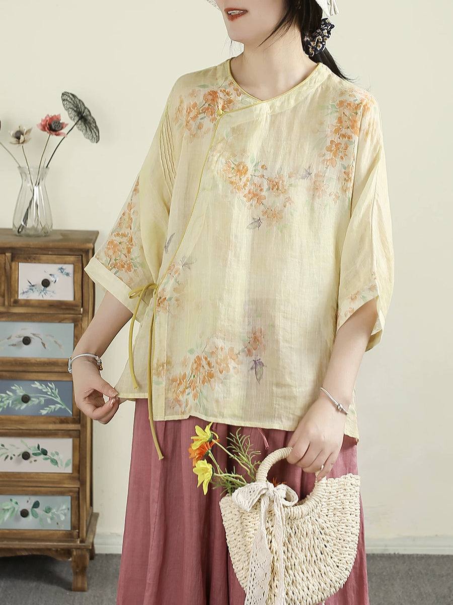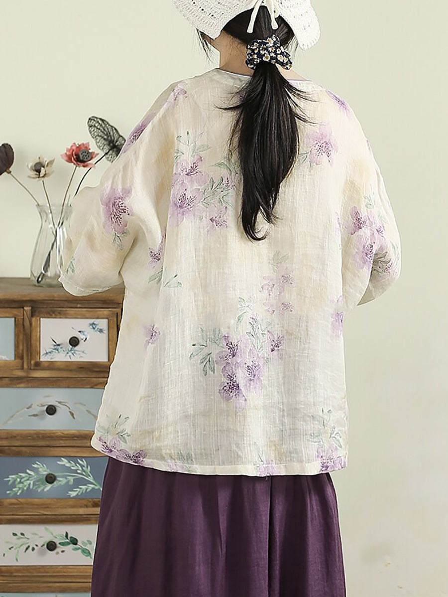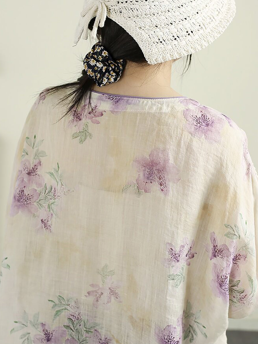 Women Artsy Summer Flower 100%Ramie O-Neck Blouse