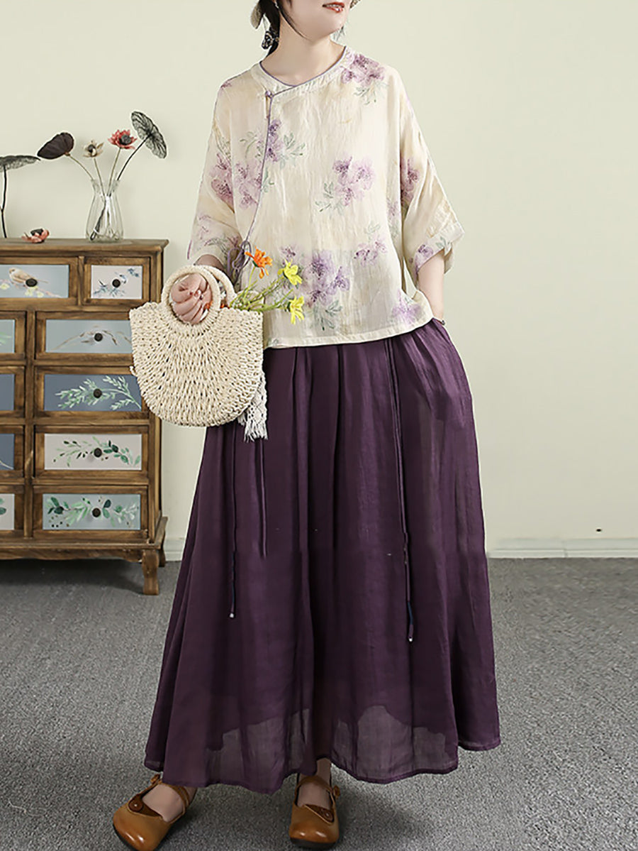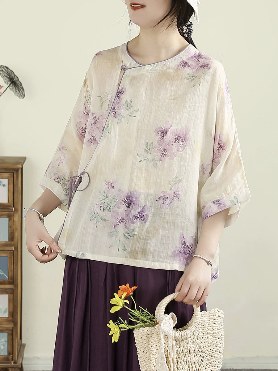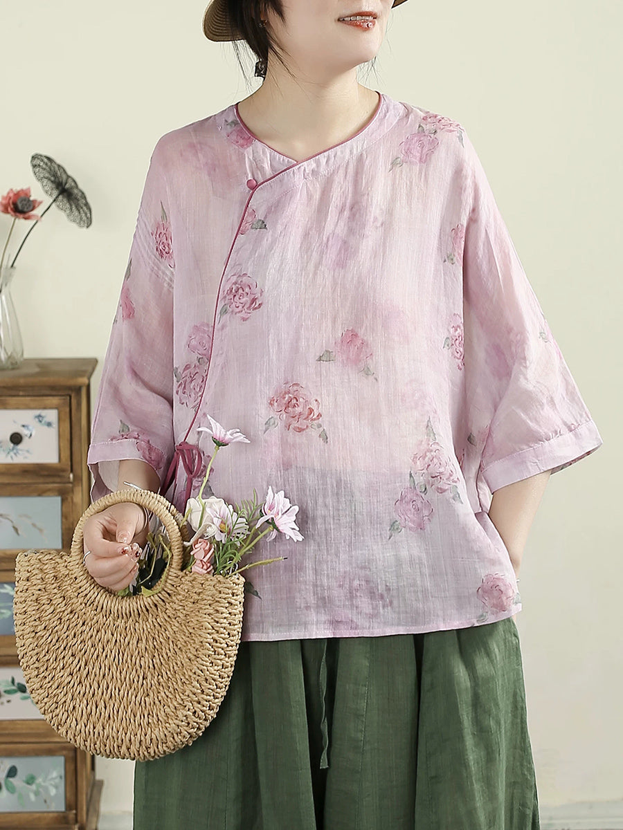 Women Artsy Summer Flower 100%Ramie O-Neck Blouse
