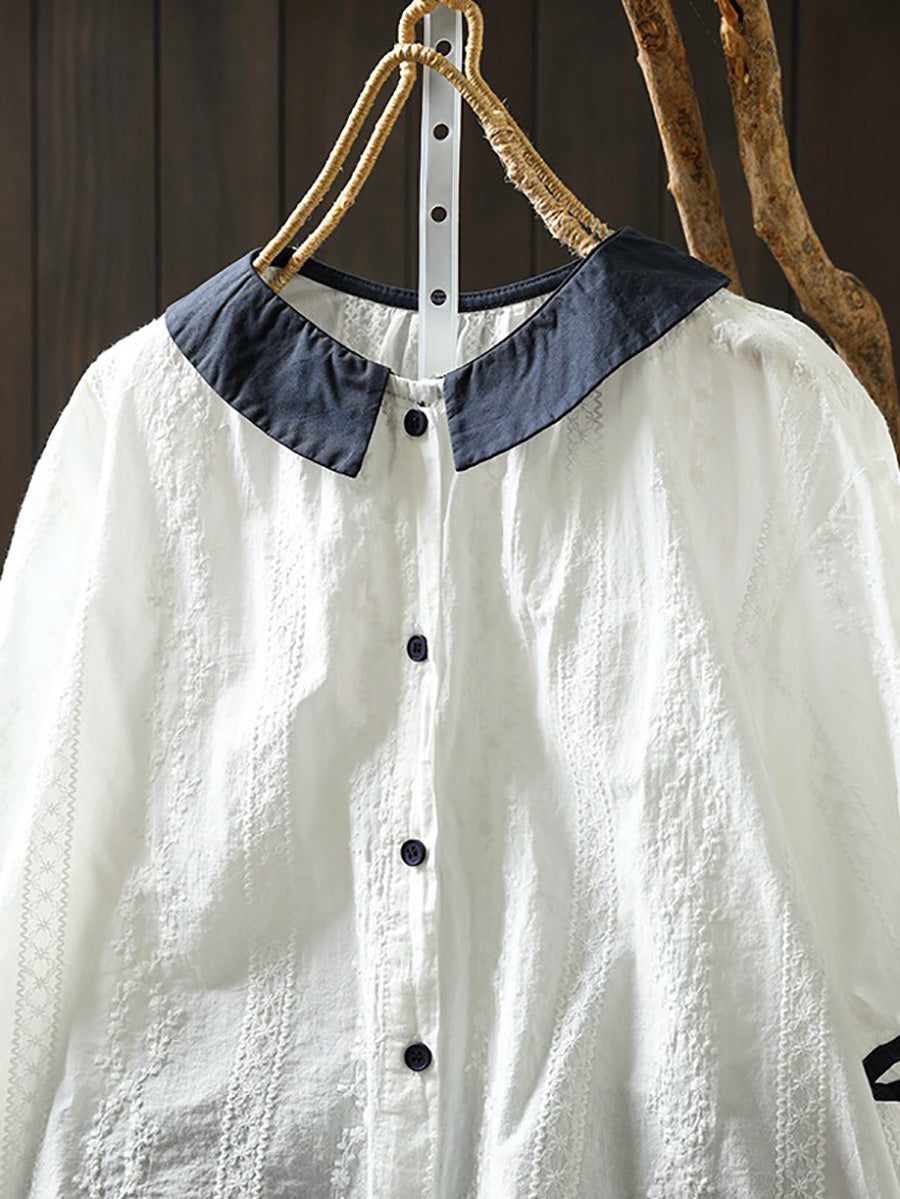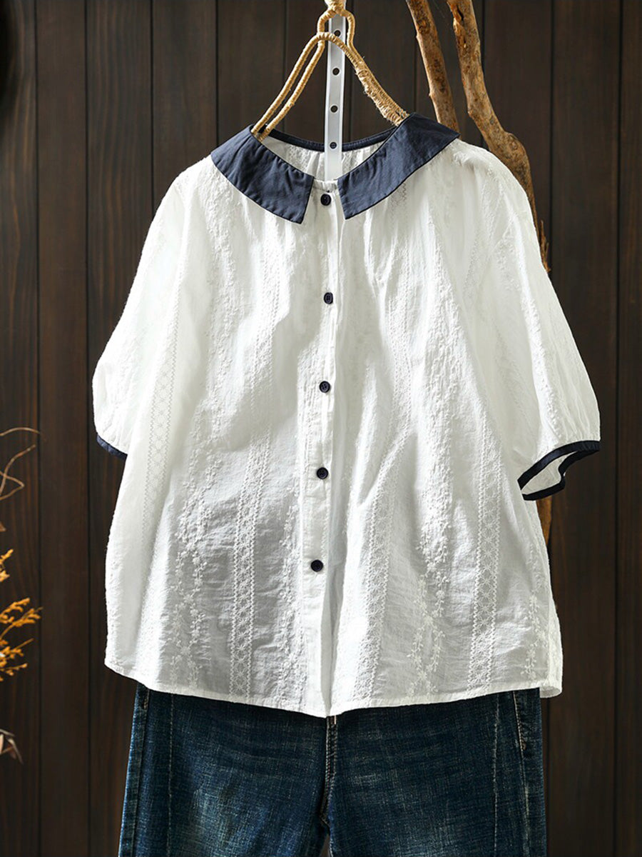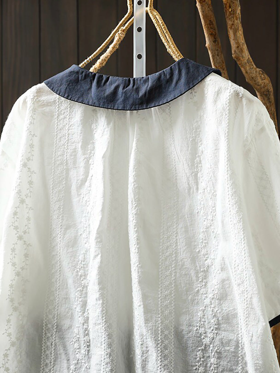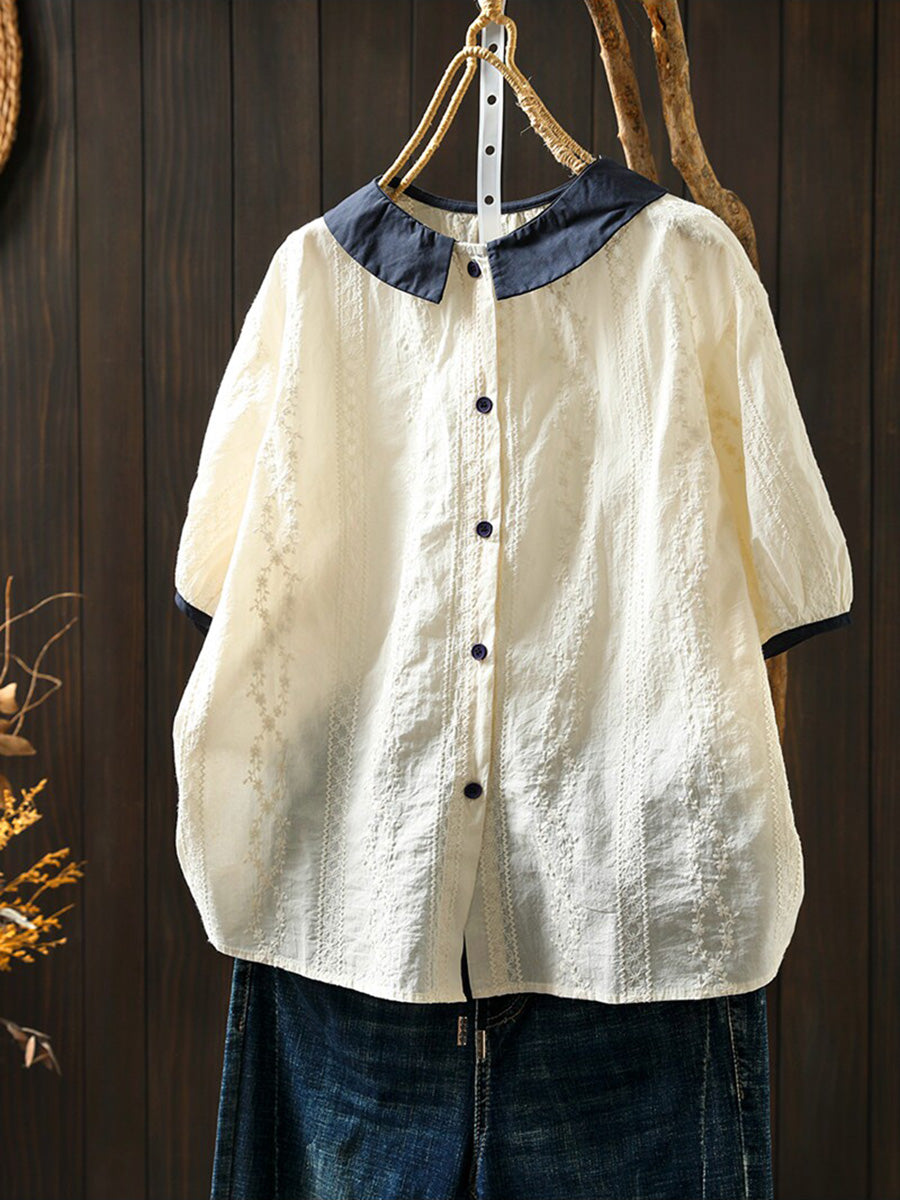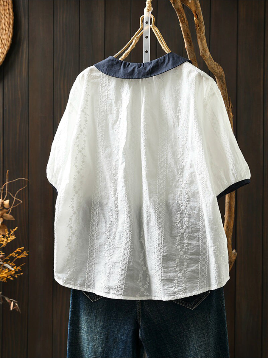 Women Summer Artsy Embroidery Colorblock 100%Cotton Blouse