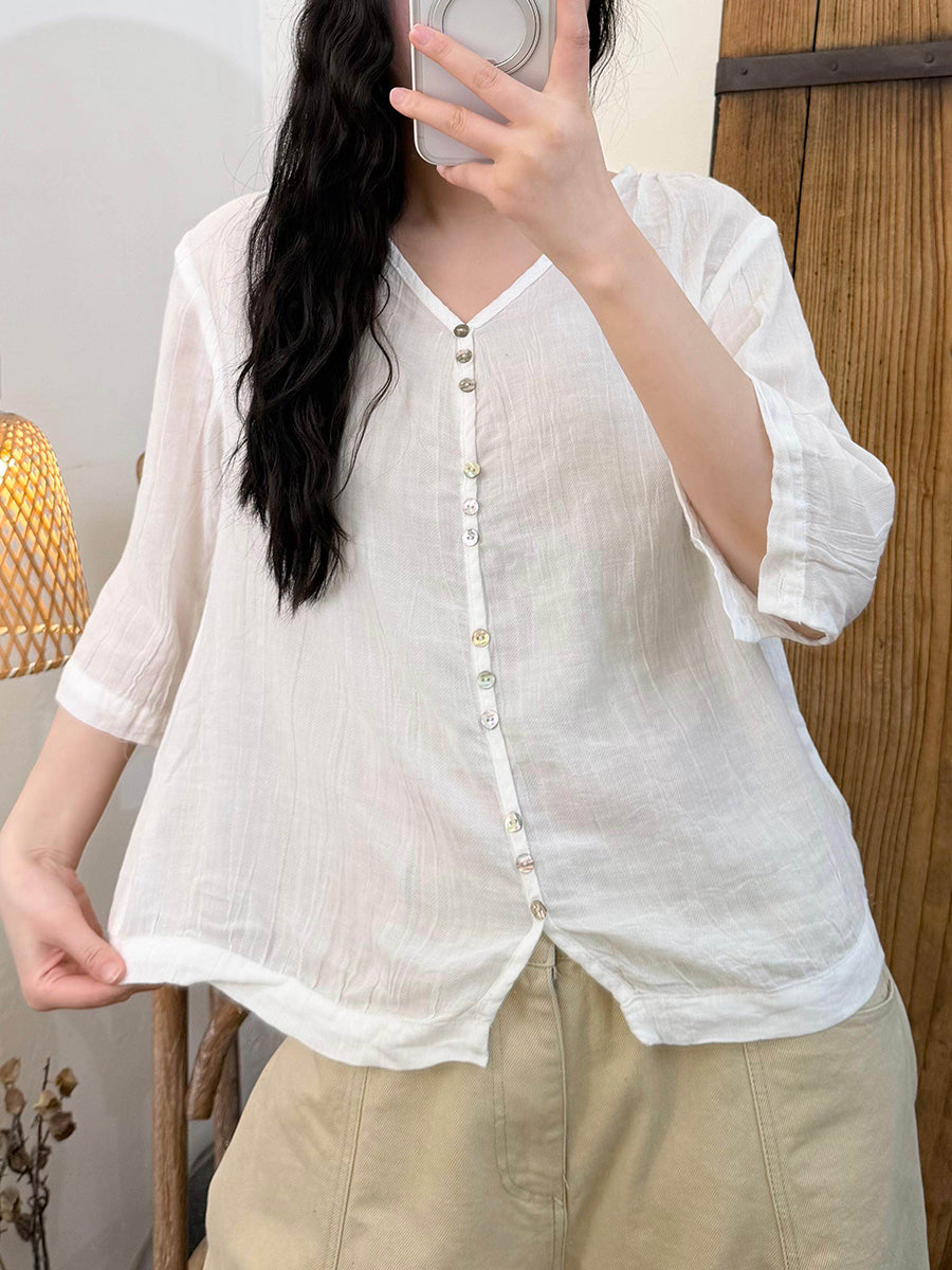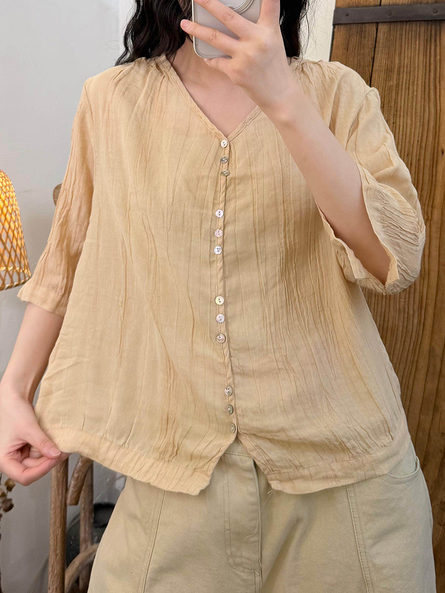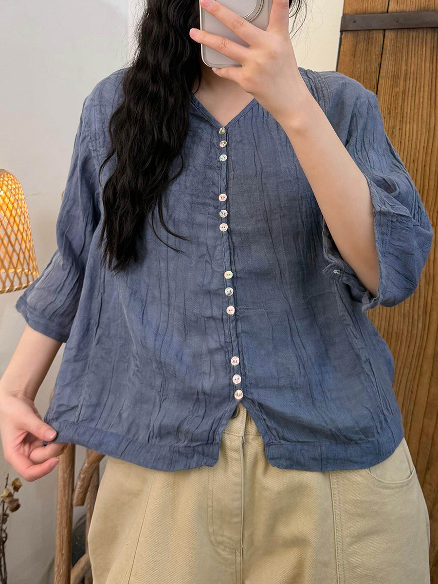 Women Summer Artsy Pure Color V-Neck Blouse
