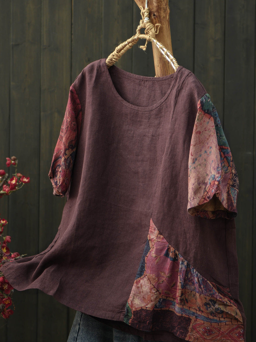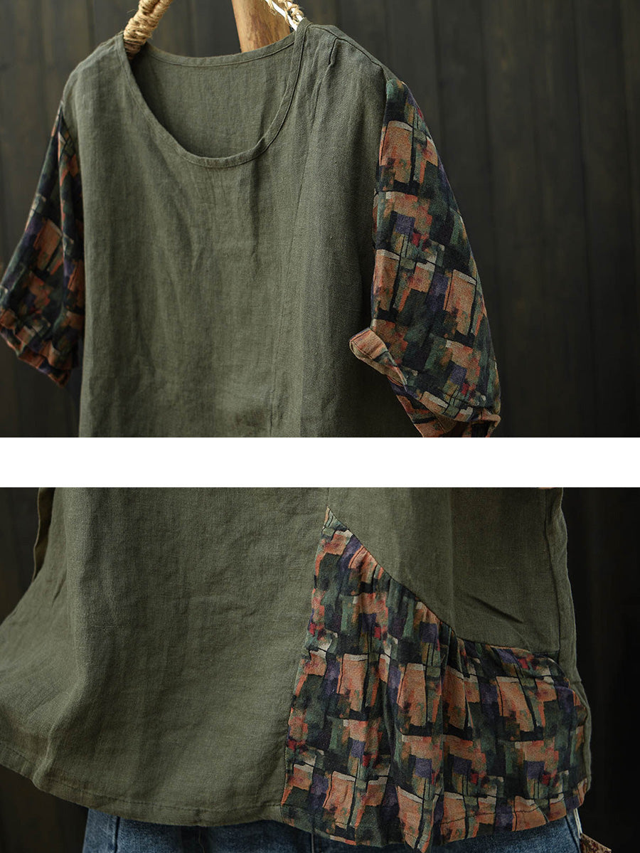 Women Summer Patchwork Linen Short Sleeve T-Shirt