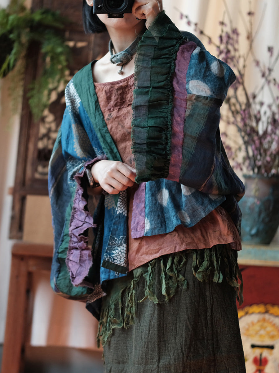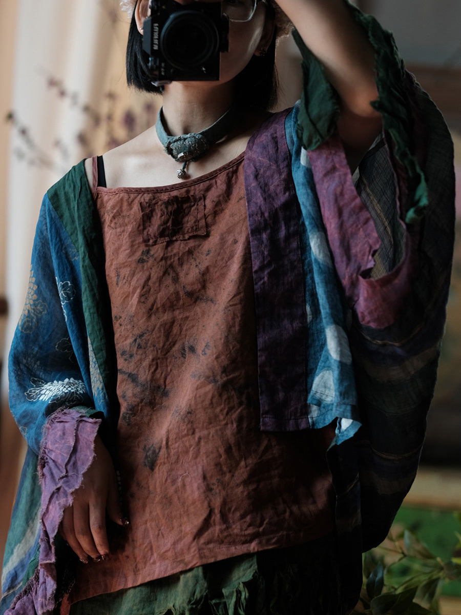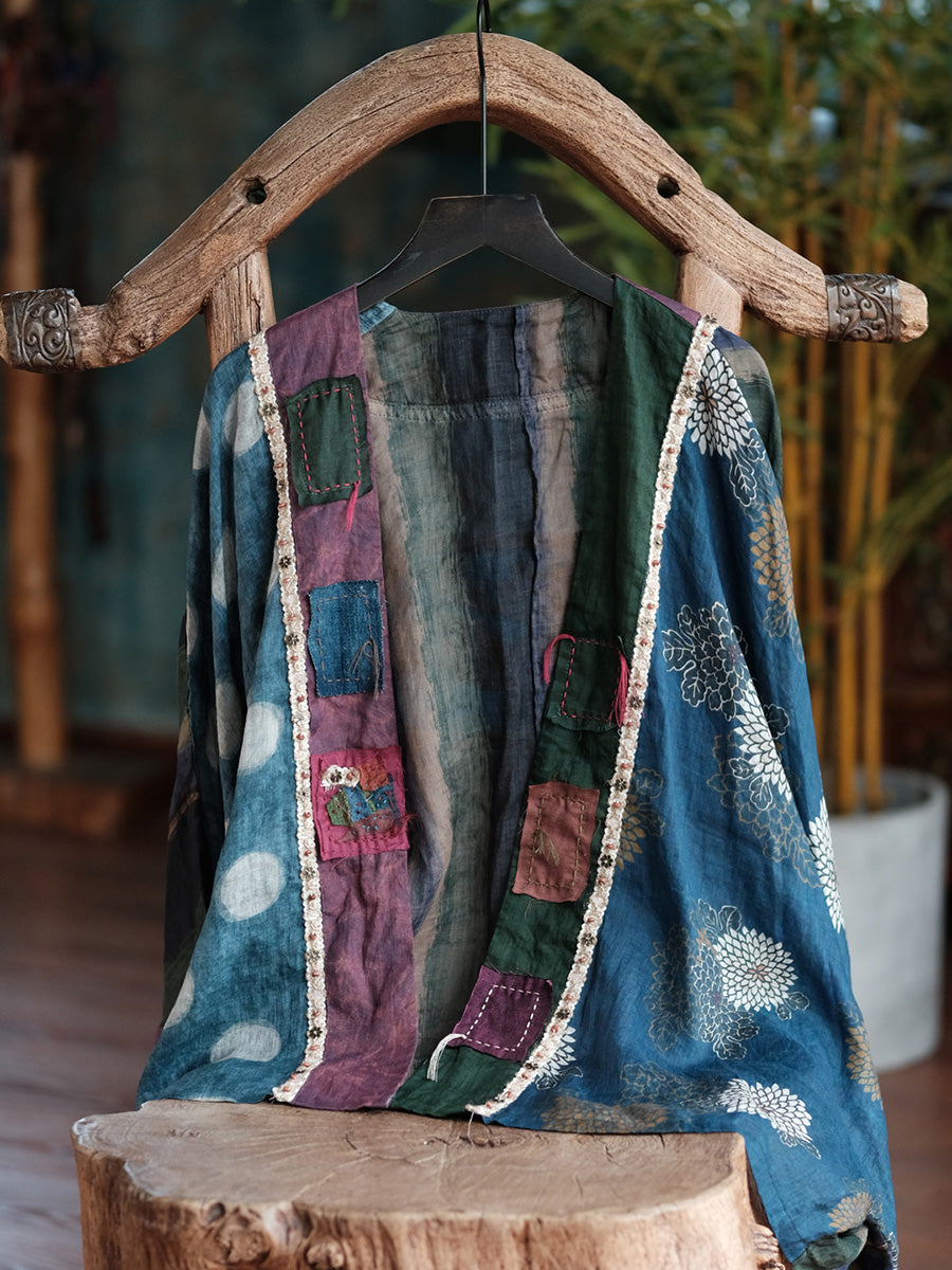 Women Summer Retro Flower Patchwork Linen Shirt