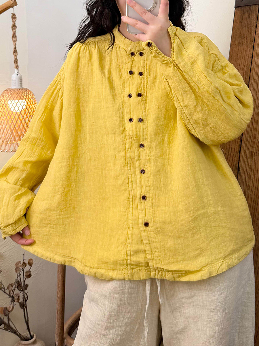 Women Autumn Retro Pure Color Linen Stand Collar Shirt