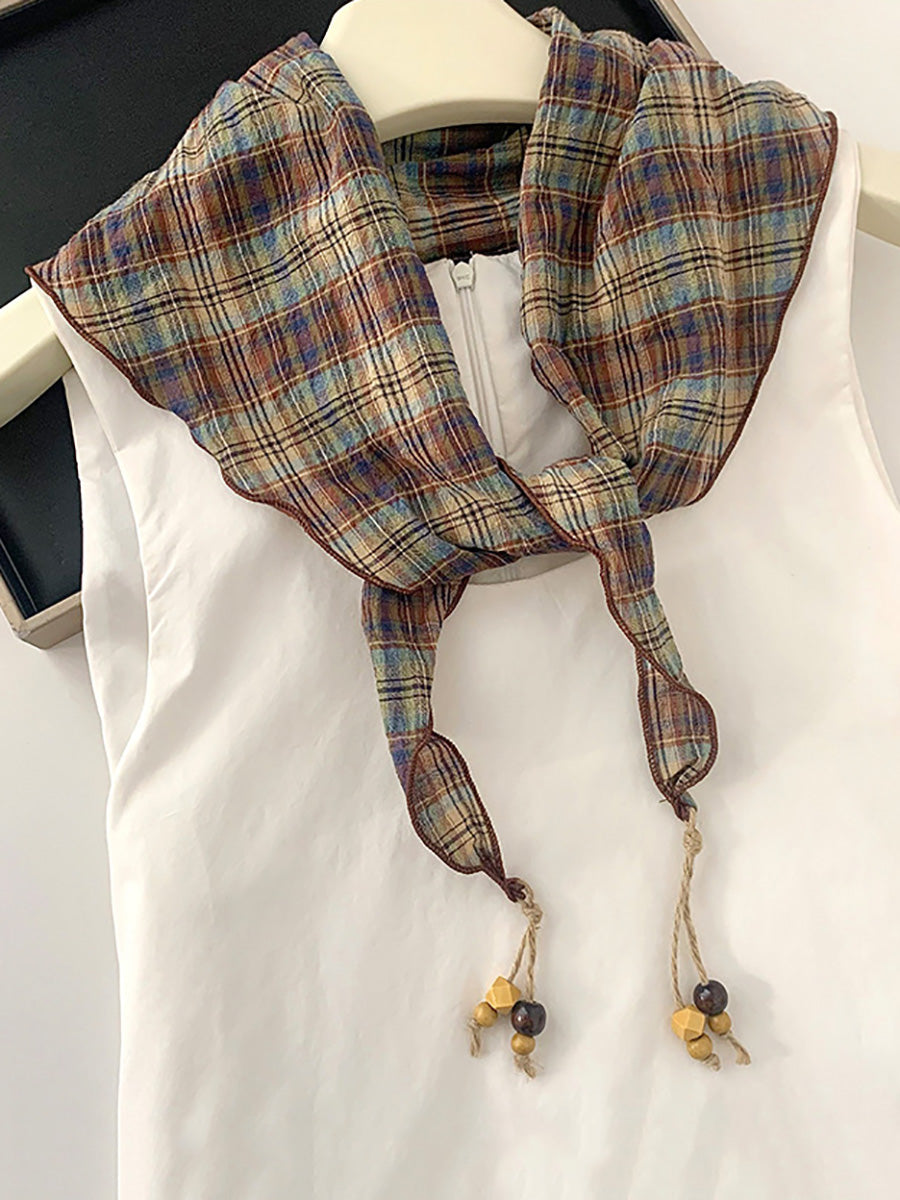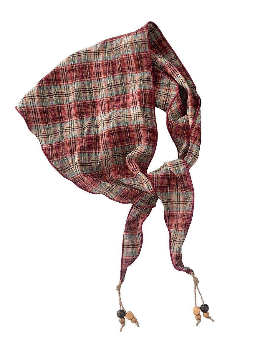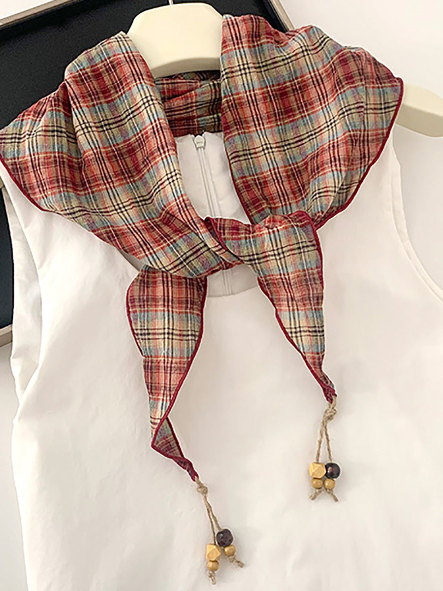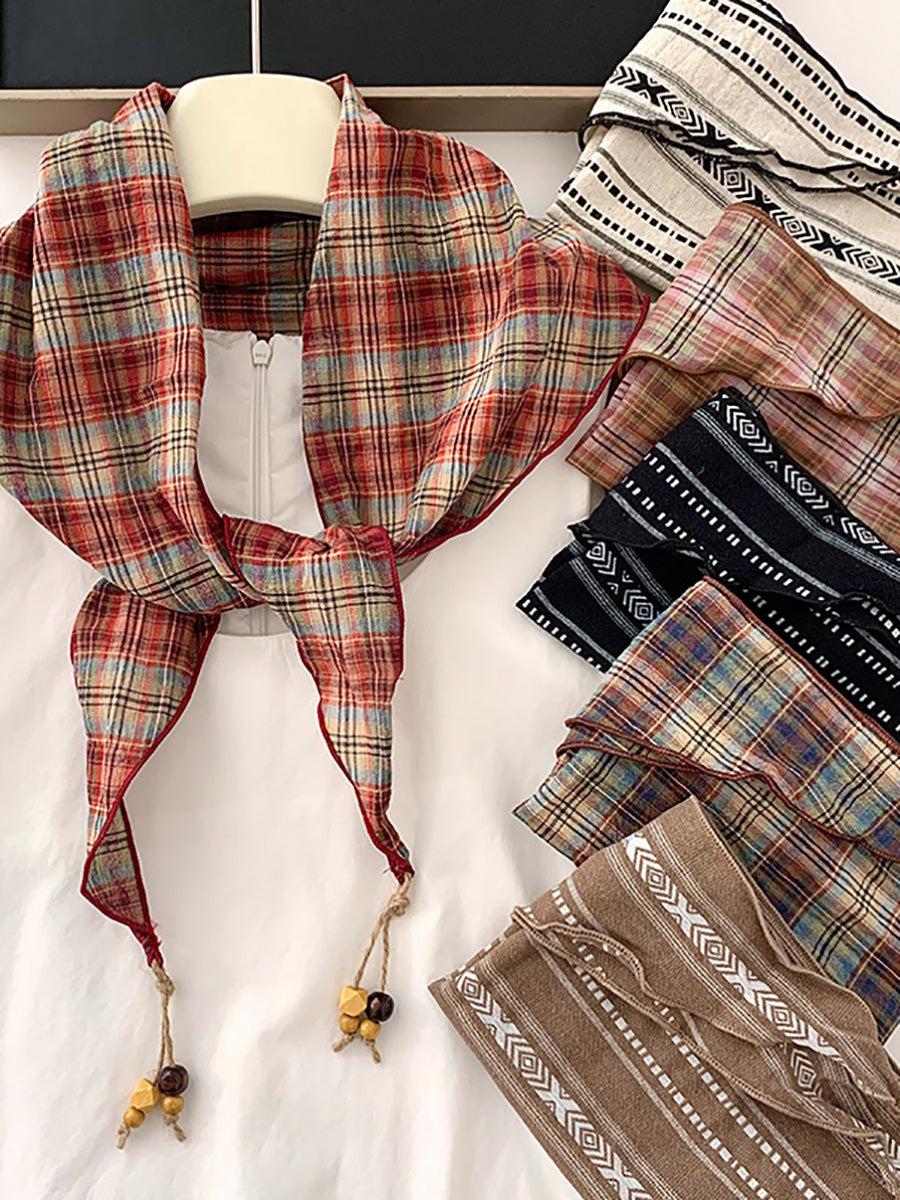 Women Vintage Plaid Bead Tassel Triangular Scarf