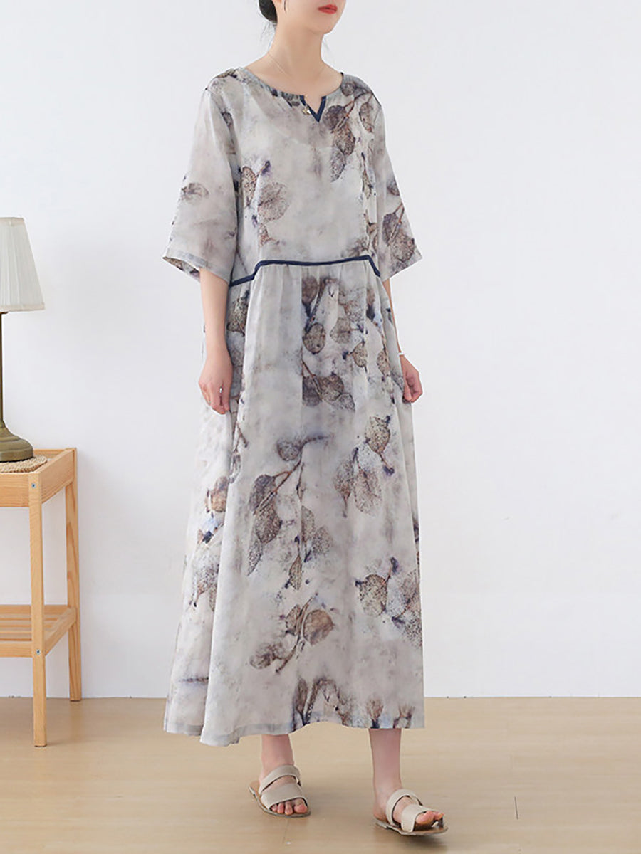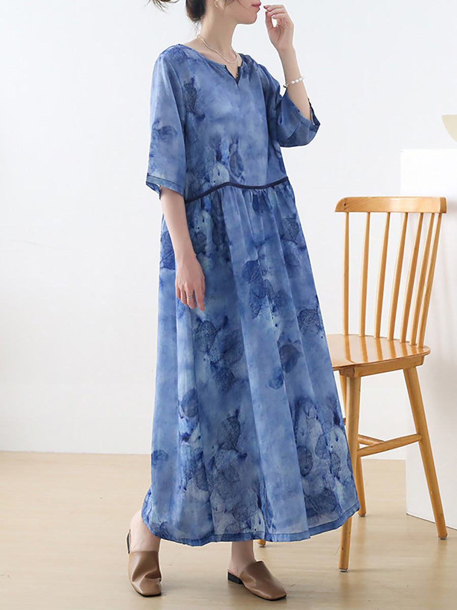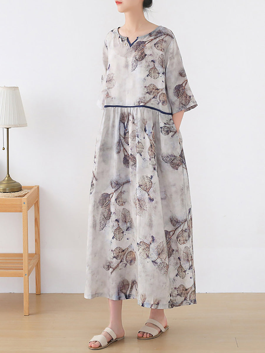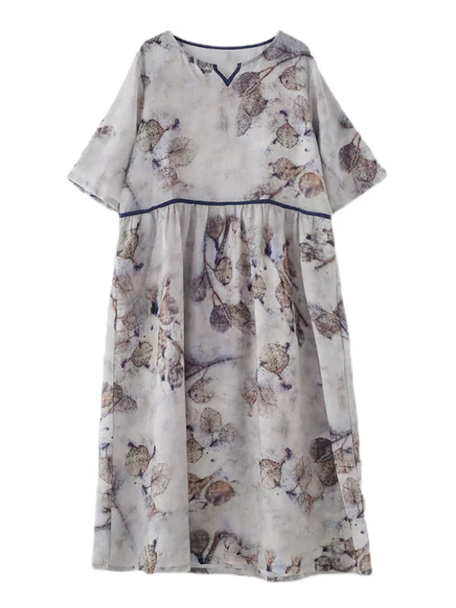 Women Summer Artsy Flower V-Neck 100%Ramie Dress