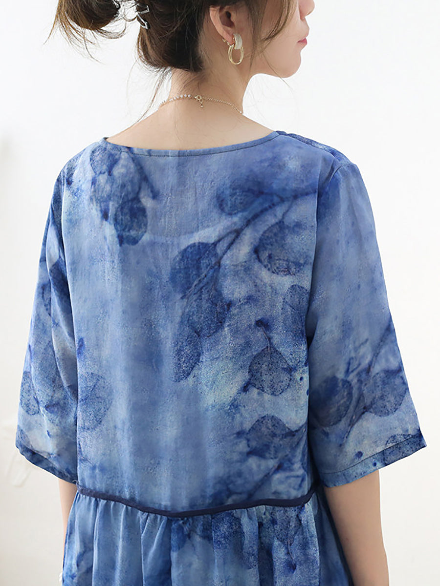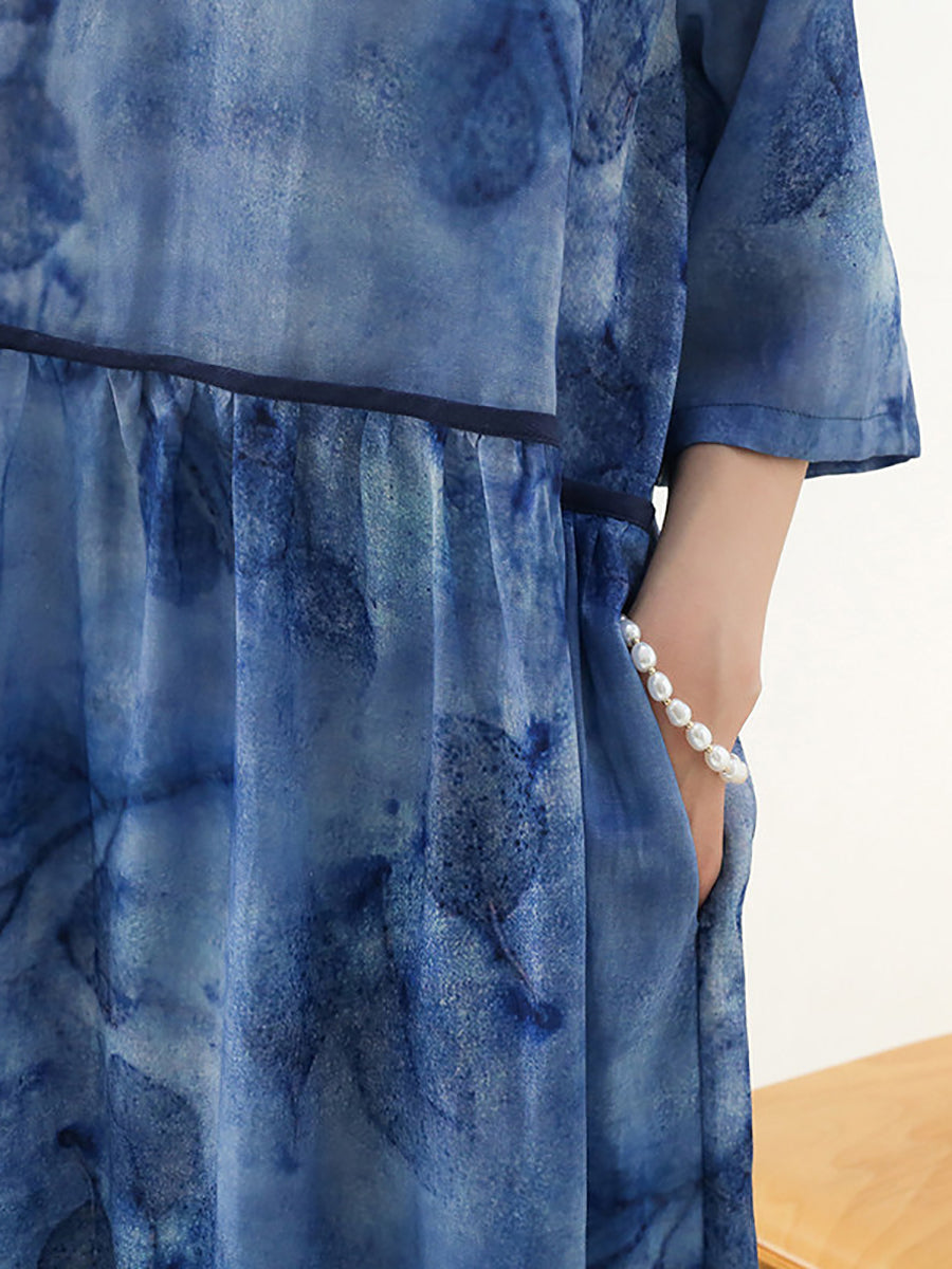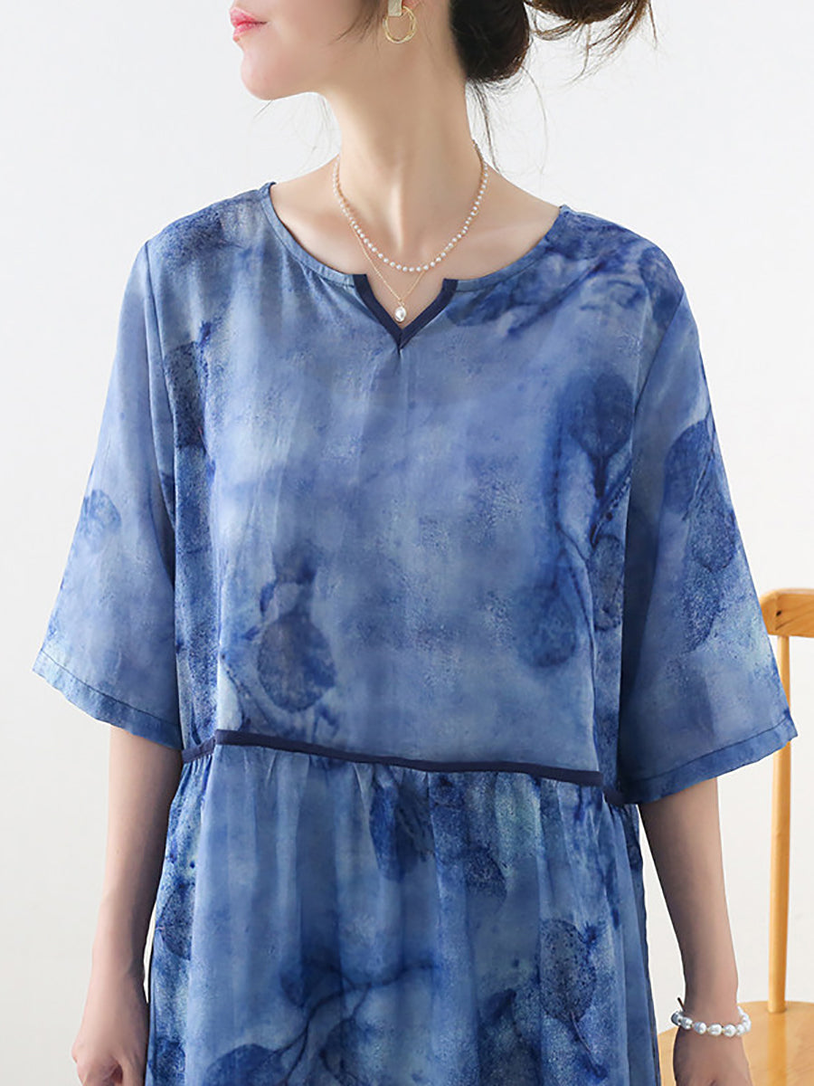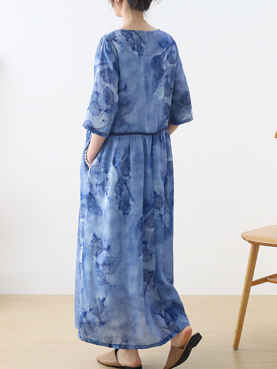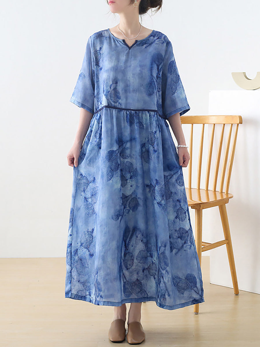 Women Summer Artsy Flower V-Neck 100%Ramie Dress